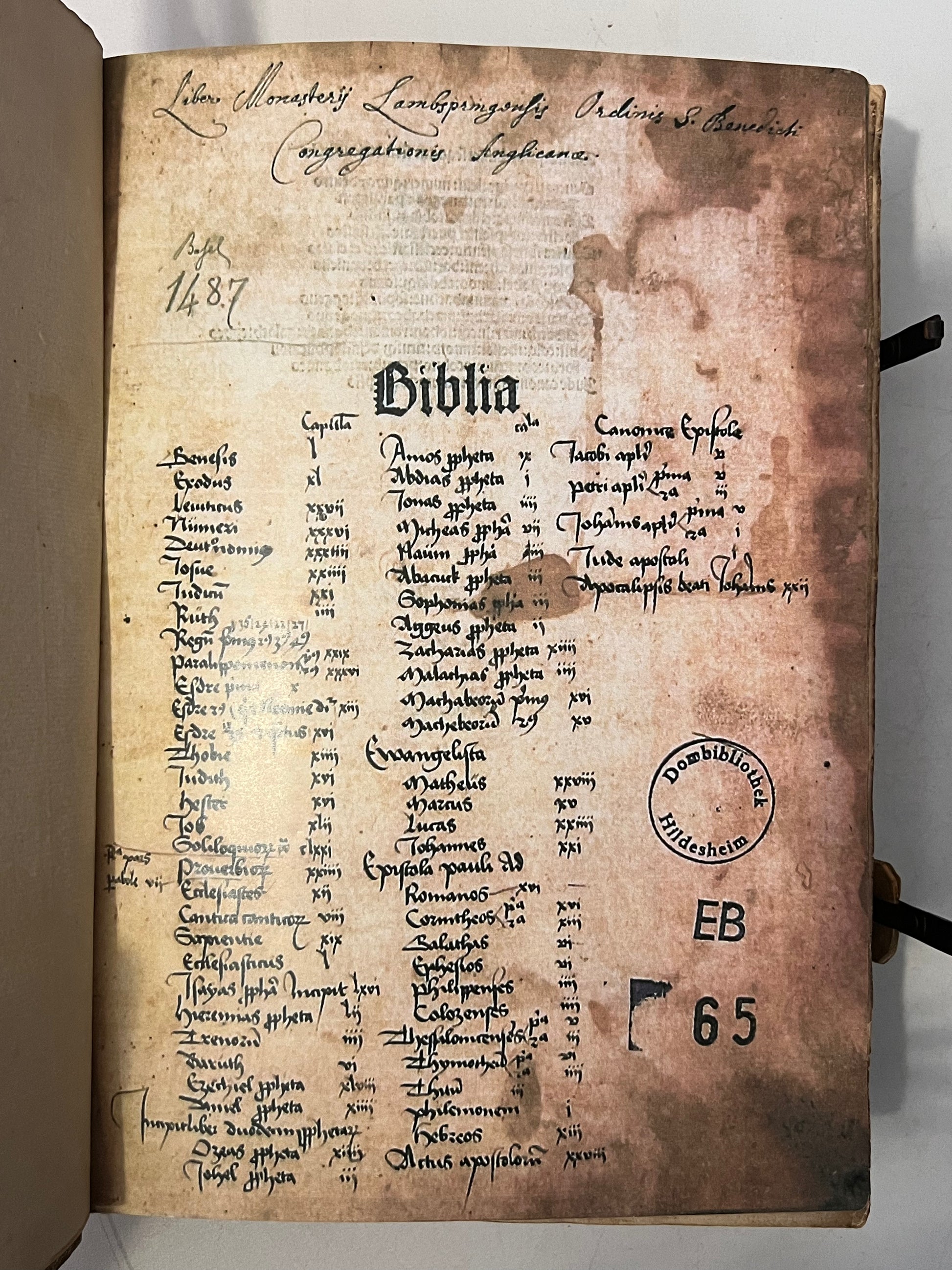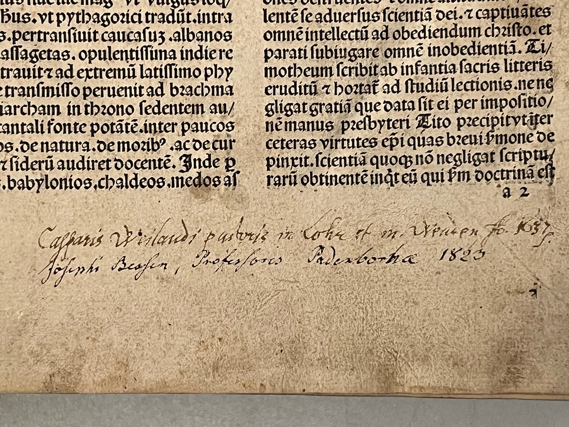 Ownership inscription to foot of a2, difficult to decipher, but roughly reading "Ca??aris Winlaudi pastoris in Lohn et in Weuien, anno 1637", or roughly translating to (?) Vinaldus, pastor in Lohne and in (?), in the year 1637. Lohne is a town in Germany approx 120km away from Paderborn. This book therefore most likely stayed in institutional ownership from circa 1487 through to at least the 1820s (see below), as it's highly unlikely that this Pastor Vinaldus figure personally owned this Bible, but was writing a record of his ministry in an institutionally held Bible, quite possibly in the German city of Paderborn (see below).