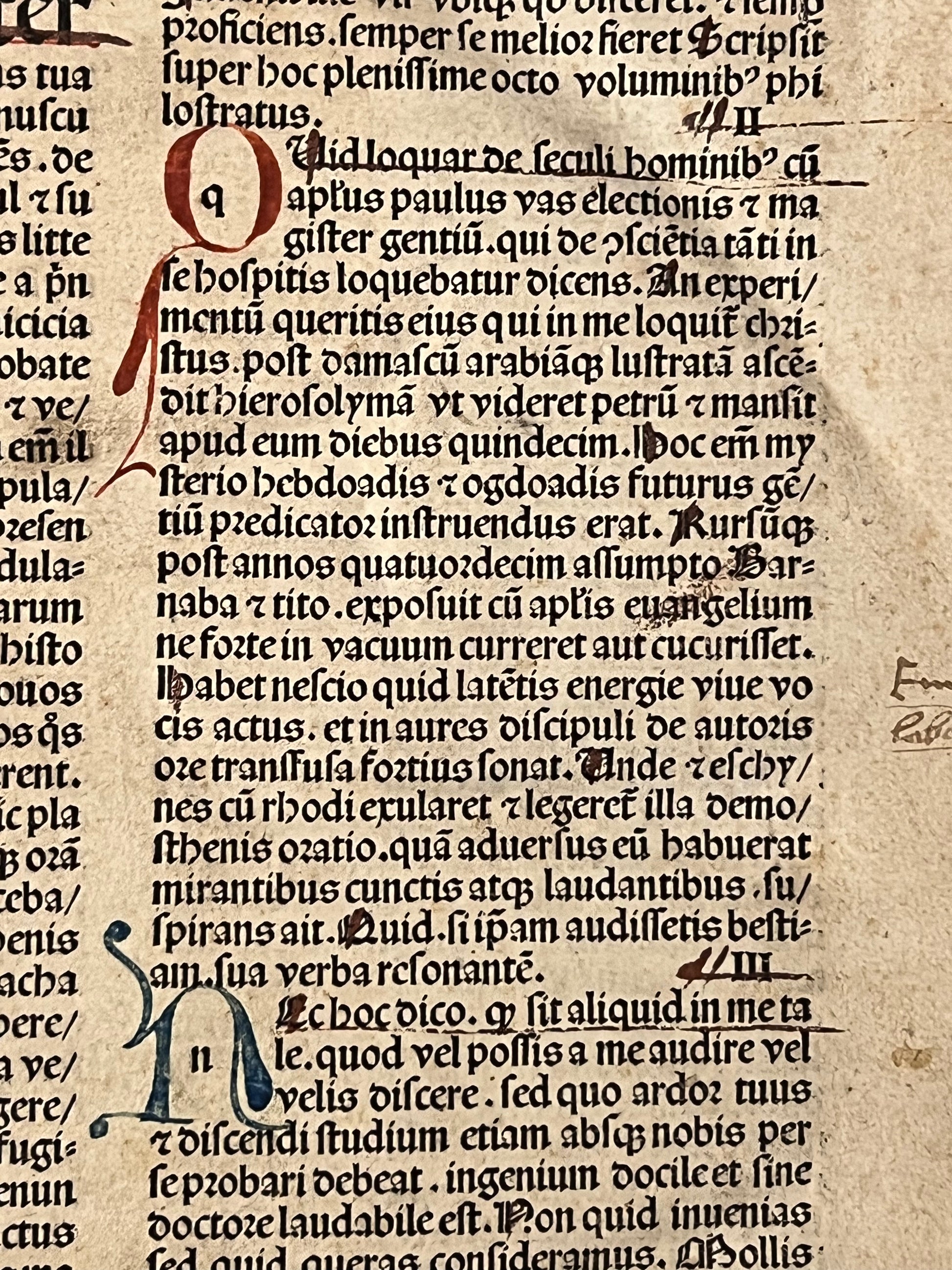 Most likely originally purchased by a wealthy theological institution, likely in Germany, with (probably) two rubricators at work and a separate illuminator for the entrance Lombardi capital. There is very light and very neat contemporary marginalia, including some manicules, in places throughout the full text, in at least three different hands, thus indicating ownership by a theological institution, most likely a university as opposed to a monastery or otherwise.