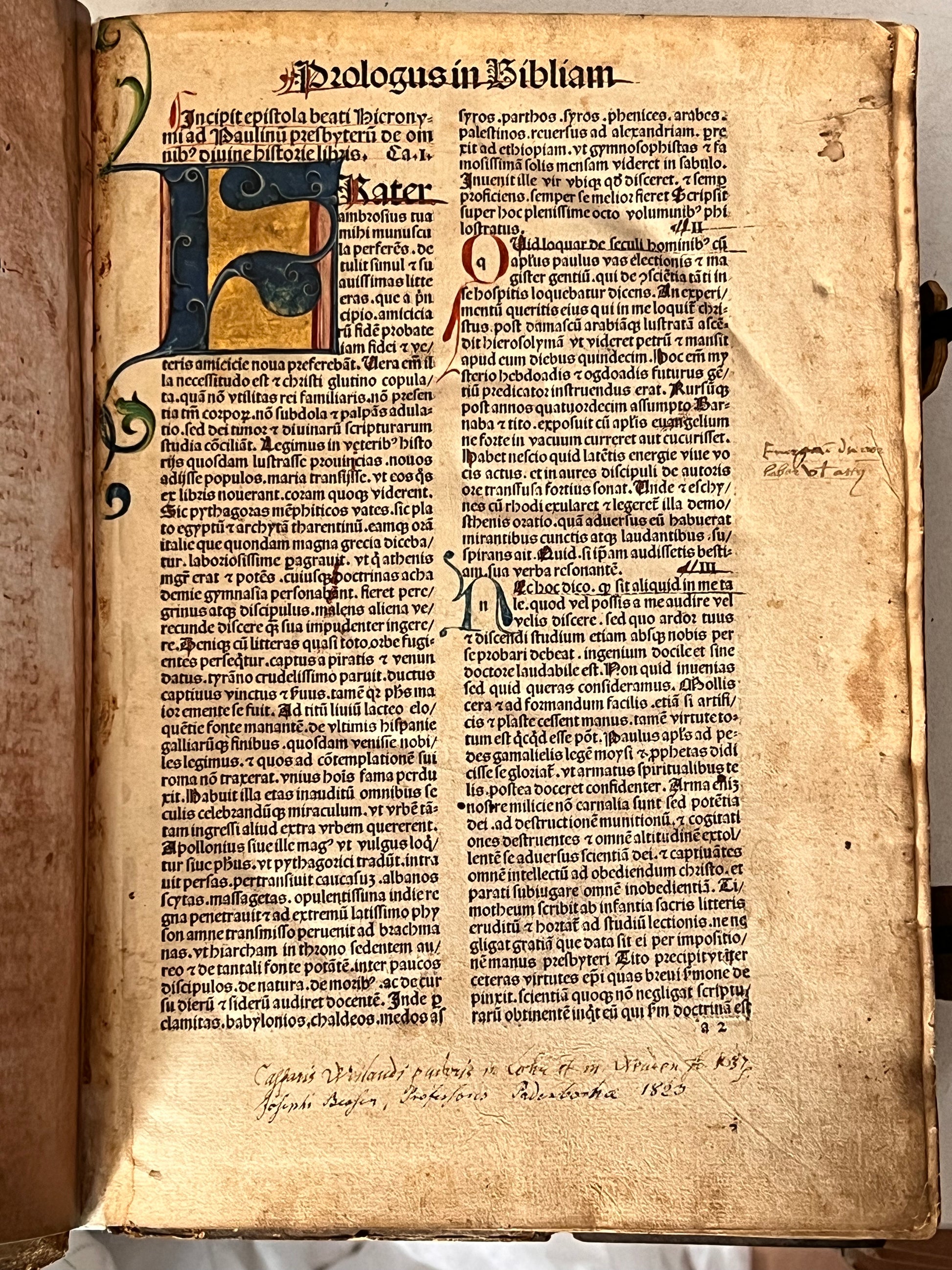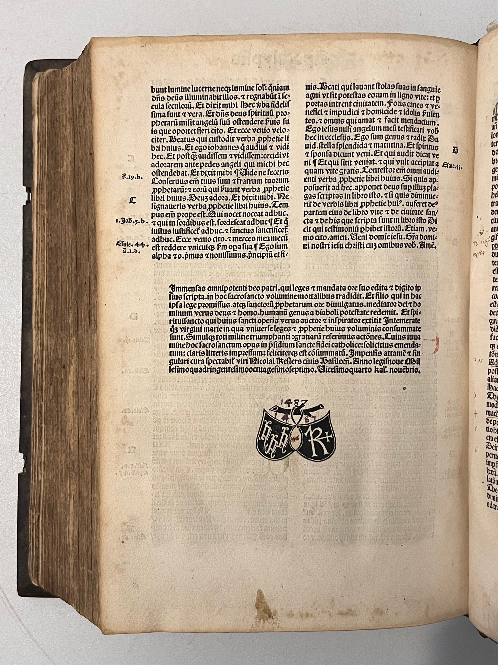 Acquired by us (WoodPaz Books Ltd) in 2024 from Germany with the approved cultural heritage export license from the German government which is, as far as can be traced, the first time this Bible has been owned outside of Germany since its printing in Basel in 1487 and thus a very rare opportunity for its acquisition being presented.