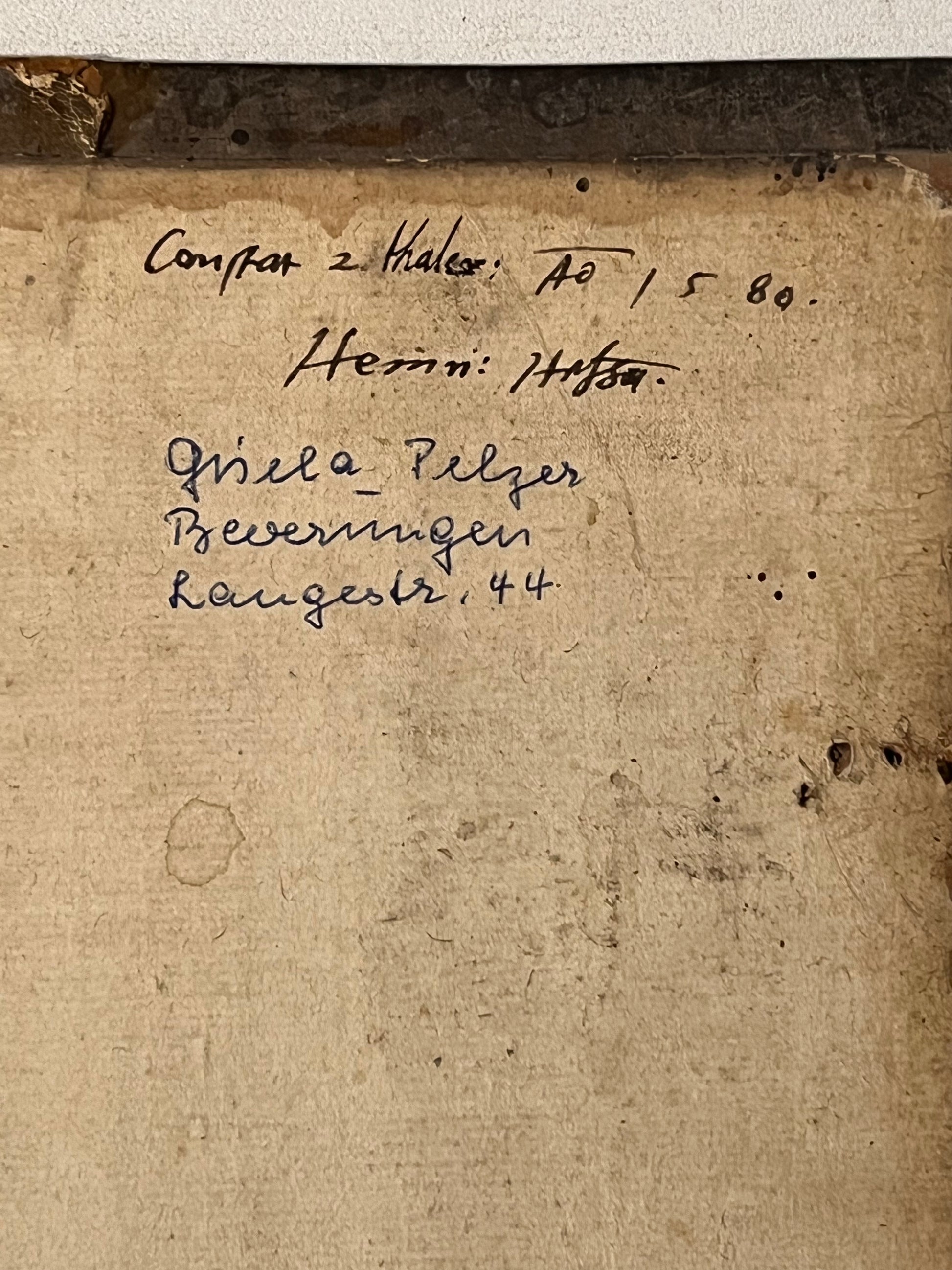 We find one later inscription to the rear pastedown in German in blue ink, circa the late 20th century, which reads "Gisela Pelger, Beereswingen (?), Laugesbe, 44". Thus showing the shift from institutional to individual ownership some time between 1823 and c.1990-2000, though there is an individual with this name who worked as a church bookkeeper in Germany and so it could well still have been an institutional copy up until this point.