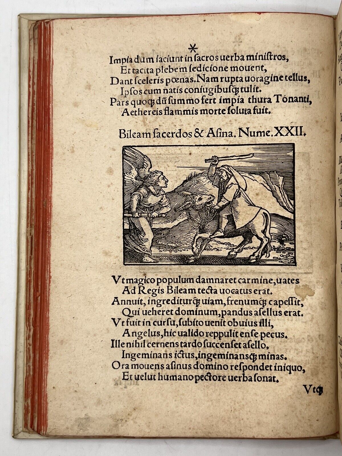 The beautiful illustrations throughout this book were commissioned for a 1533 Biblicae Historiae, printed by the same printer (Egenolph). Here we find the 80 woodcuts by H.S. Beham throughout with the associated scripture verses accompanying the illustrations in these 80 Old Testament scenes. This book was compiled by the German Protestant Reformer Aemilius. "Close copies of the same cuts were used in the Coverdale Bible of 1535 and in Tyndale's New Testament of 1536" (Fairfax-Murray 65).