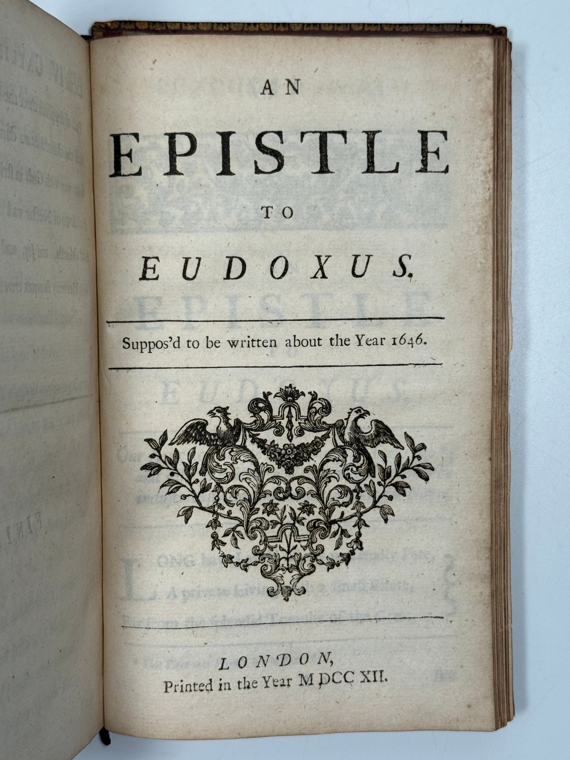 Collates as complete with the frontispiece, all titles and the often lacking advertisement leaf (D4), together with the original blanks. The advertisement leaf includes an advert for the seventh volume of the famous Rowe edition of Shakespeare's Works, the first edition following the folios. Signatures frequently reset for each of the four books of the main text and then again for the final two works. Light pencil inscriptions to blanks. Mildly toned text, else very clean throughout. Internally excellent. Bookplate to front pastedown.