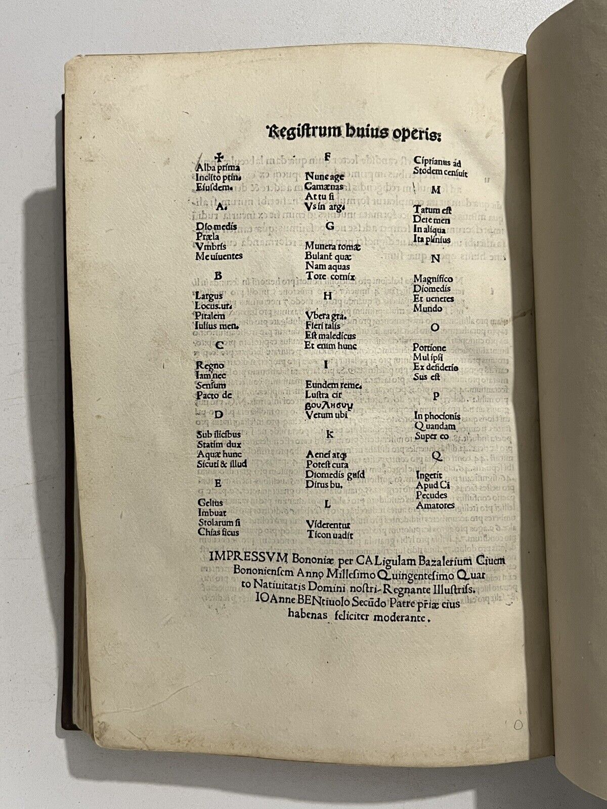 Calpurnii et Nemesiani Poetarum Buccolicum carmen Una cum Commentarus Diomedis Guidalotti Bononiensis. Impressum Bononiae per Caligulam Bazalerium Ciuem Bononiensem Anno Millesimo Quingentesimo Quarto (1504), folio.