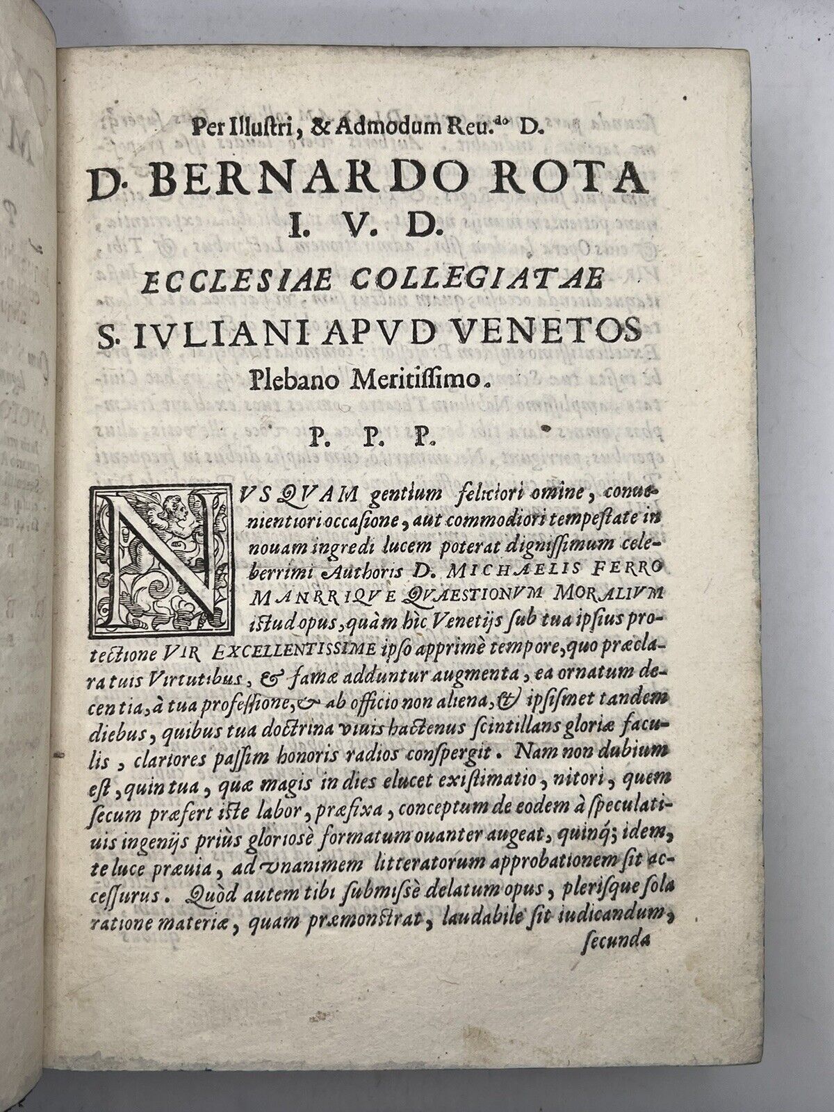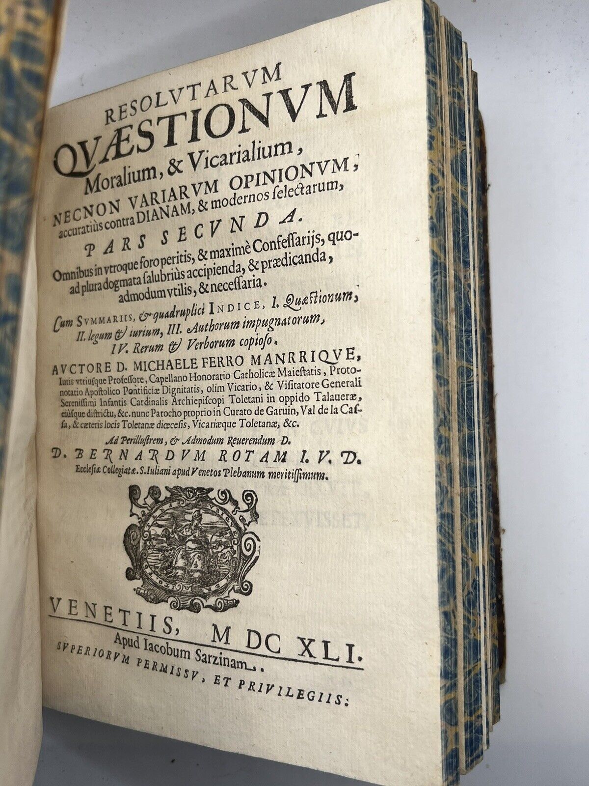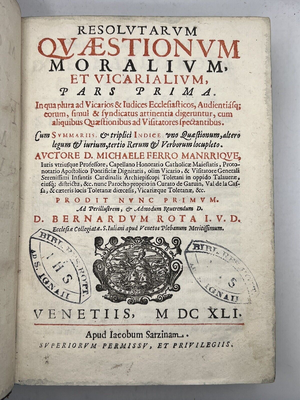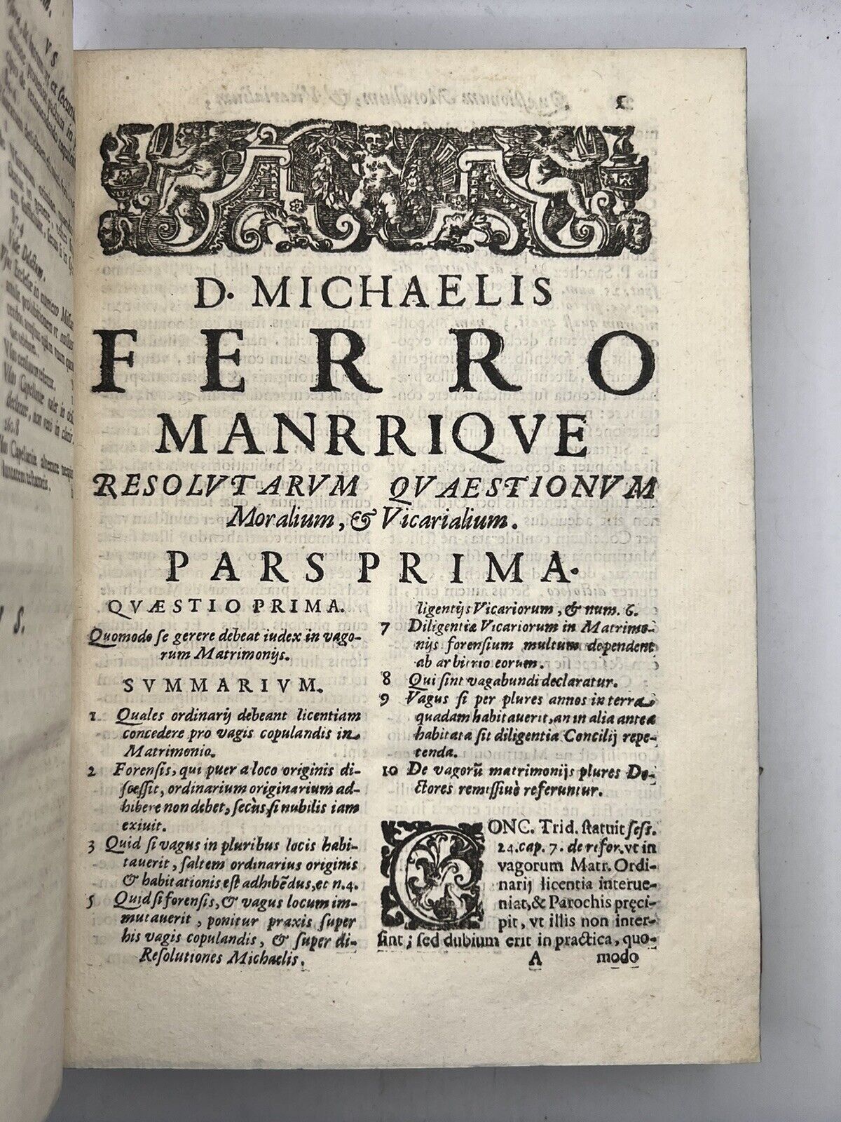 Resolved Moral and Vicarial Questions. In Which Many Matters Pertaining to Vicars and Ecclesiastical Judges, Their Hearings, and Syndicate Matters are Arranged, Along with Certain Questions Pertaining to Visitors. With Summaries and a Triple Index: One of Questions, Another of Laws and Rights, the Third of Rich Matters and Words. By D. Michael Ferro Manrique. First Edition. Venice, 1641.