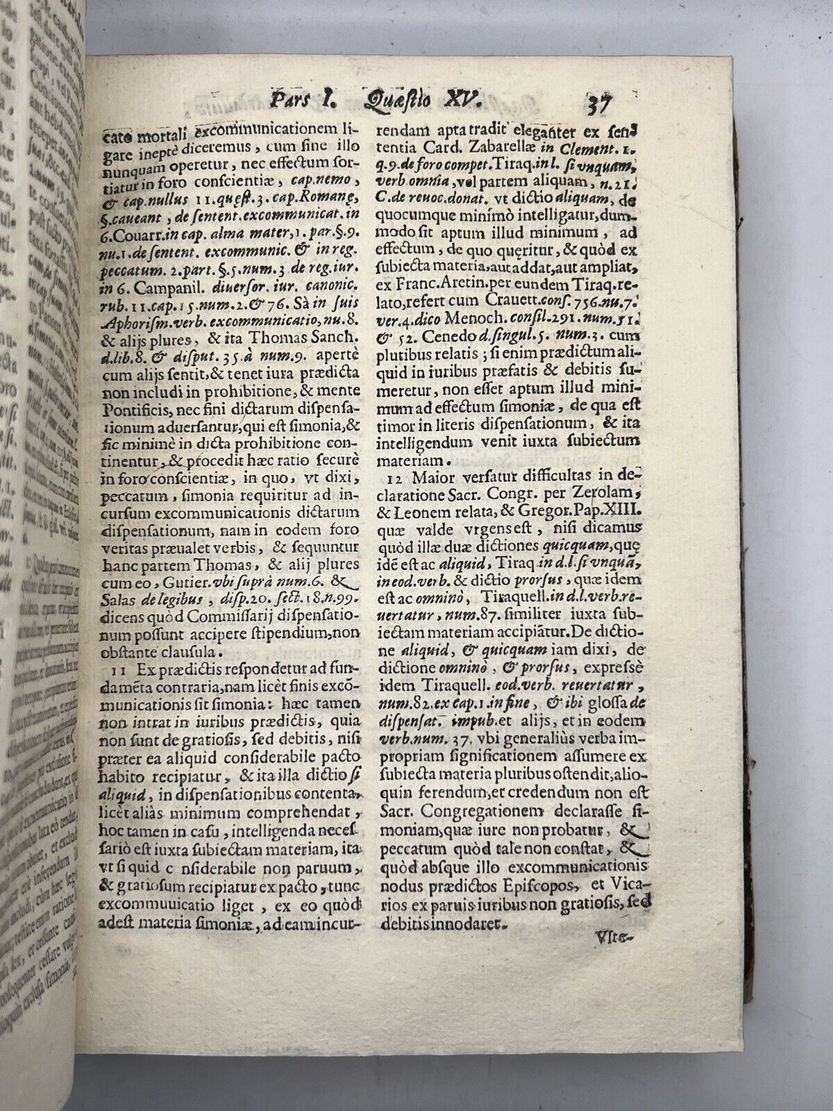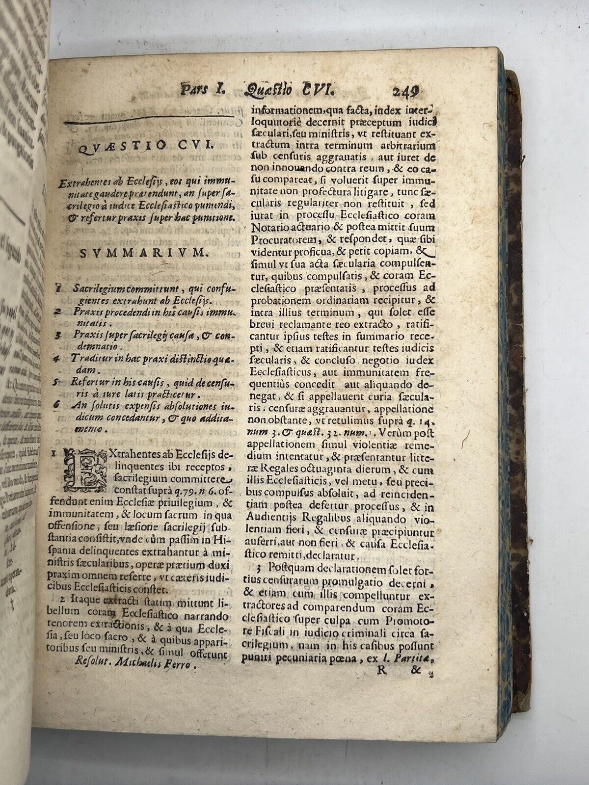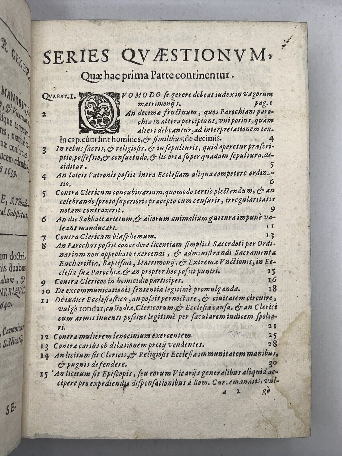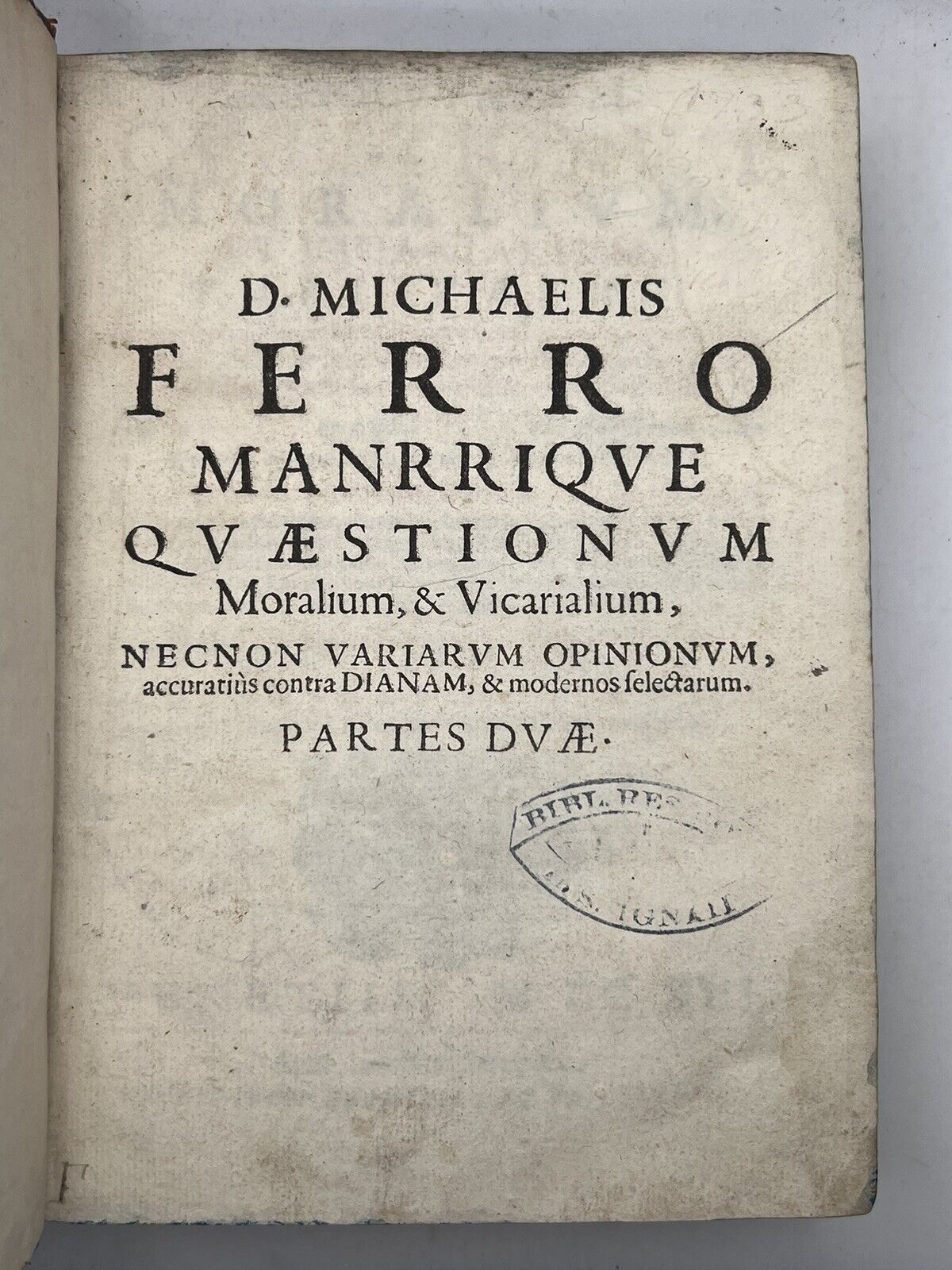 Resolved Moral and Vicarial Questions. In Which Many Matters Pertaining to Vicars and Ecclesiastical Judges, Their Hearings, and Syndicate Matters are Arranged, Along with Certain Questions Pertaining to Visitors. With Summaries and a Triple Index: One of Questions, Another of Laws and Rights, the Third of Rich Matters and Words. By D. Michael Ferro Manrique. First Edition. Venice, 1641.