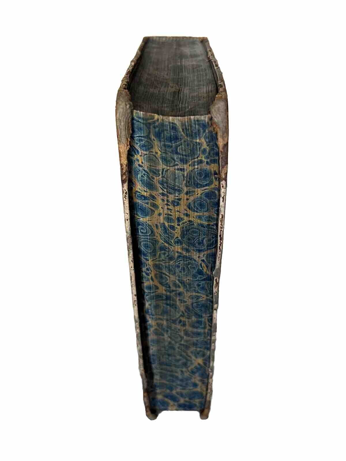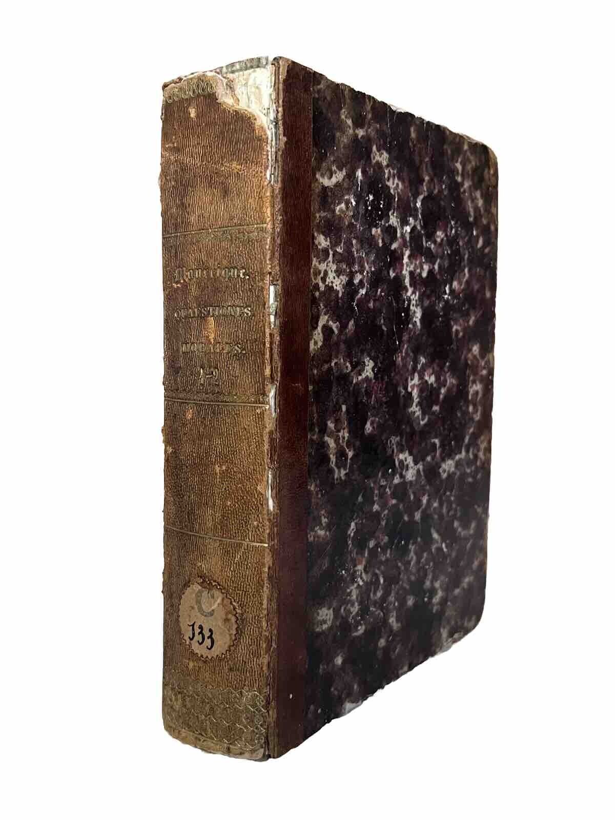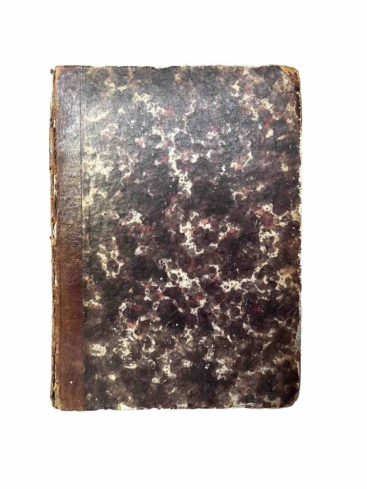 Quarter calf over marbled paper backed boards, with gilt tooled title to spine. Paper library shelf mark sticker with a printed "c" and handwritten "133" to the bottom of the spine. Spine lightly rubbed, more so to extremities, and lacking a section from the top of the backstrip. Both boards attached with mostly cracked joints and secure hinges. Boards with light superficial scratches and scuffing, some rubbing to edges. Shelf and edge wear with some loss. Page edges with a blue marbled design, shows well, some toning when spread out. Some of the page edge colouring has seeped through to the edges of leaves throughout. Library paper sicker to the top of the front pastedown. Library stamps on few pages, mainly half title and title page. Title page in red and black ink. Some light creasing vertically to the centre of the first few leaves. Text block overall very clean with light toning and occasional foxing, though some leaves are heavily toned. Very small tear with loss to the bottom corner of pp.239/240 of the second part (doesn't affect any text). Light damp staining to the bottom corners of the last few leaves of the text block.