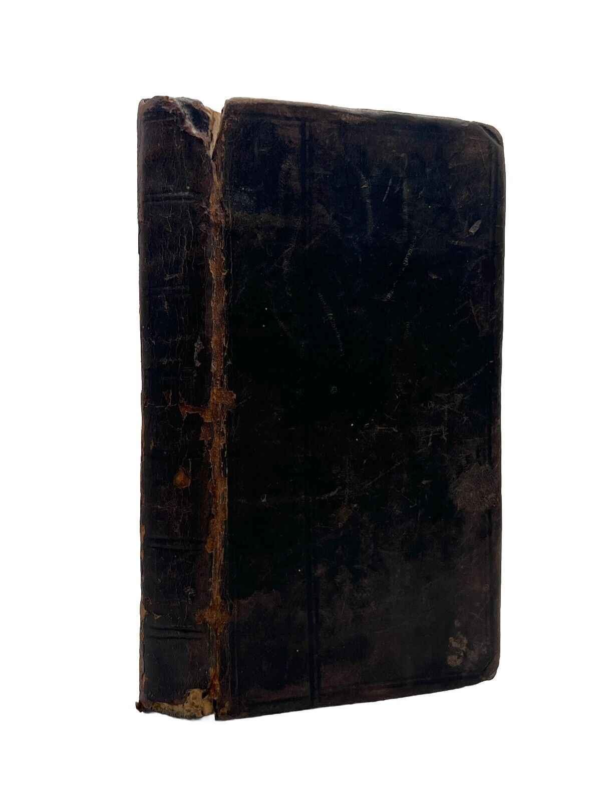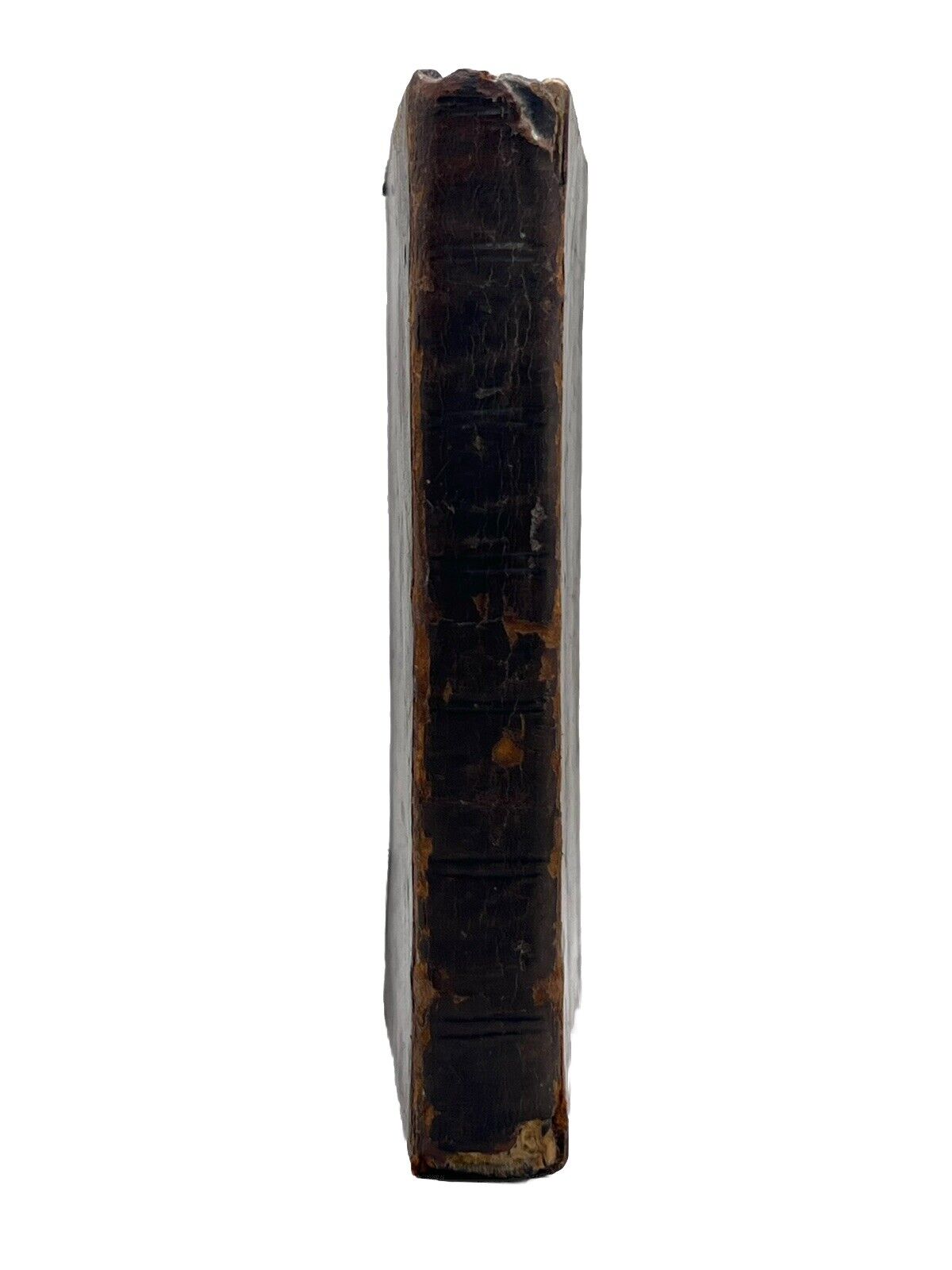 Full dark brown calf binding, rubbed and scuffed with a small fragment of the backstrip lacking from the bottom. Both boards attached with rubbing along joints, hinges worn. Shelf and edge wear. Page edges toned, top edge darkened as often. Ink inscriptions to endpapers and insides of boards. Lacking pastedown and some blanks. Text block very clean with occasional foxing. Edge tears to the top corners of the last two leaves of text following rear blanks, the last leaf of which has ink transferred onto it. Ink inscription to rear blank dated 1674.