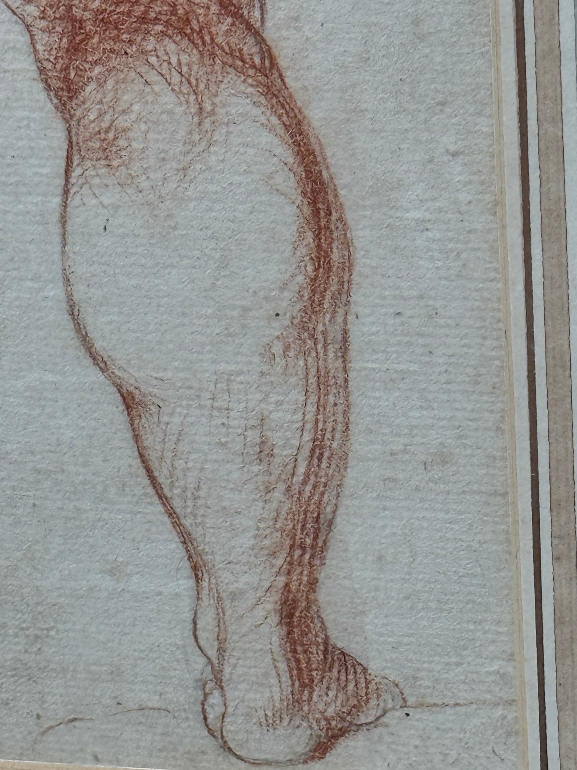 This drawing exemplifies Michelangelo's High Renaissance fascination with anatomical expression and dynamic poise. The choice of red chalk, Michelangelo’s preferred medium for figure studies, and the assured modelling suggest an artist working within his immediate circle, perhaps a follower or studio draughtsman in Rome during the mid-16th century.