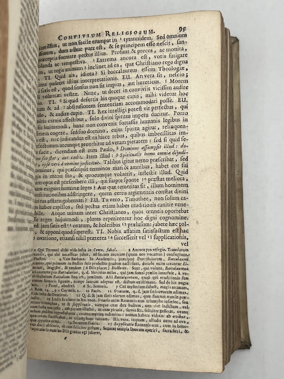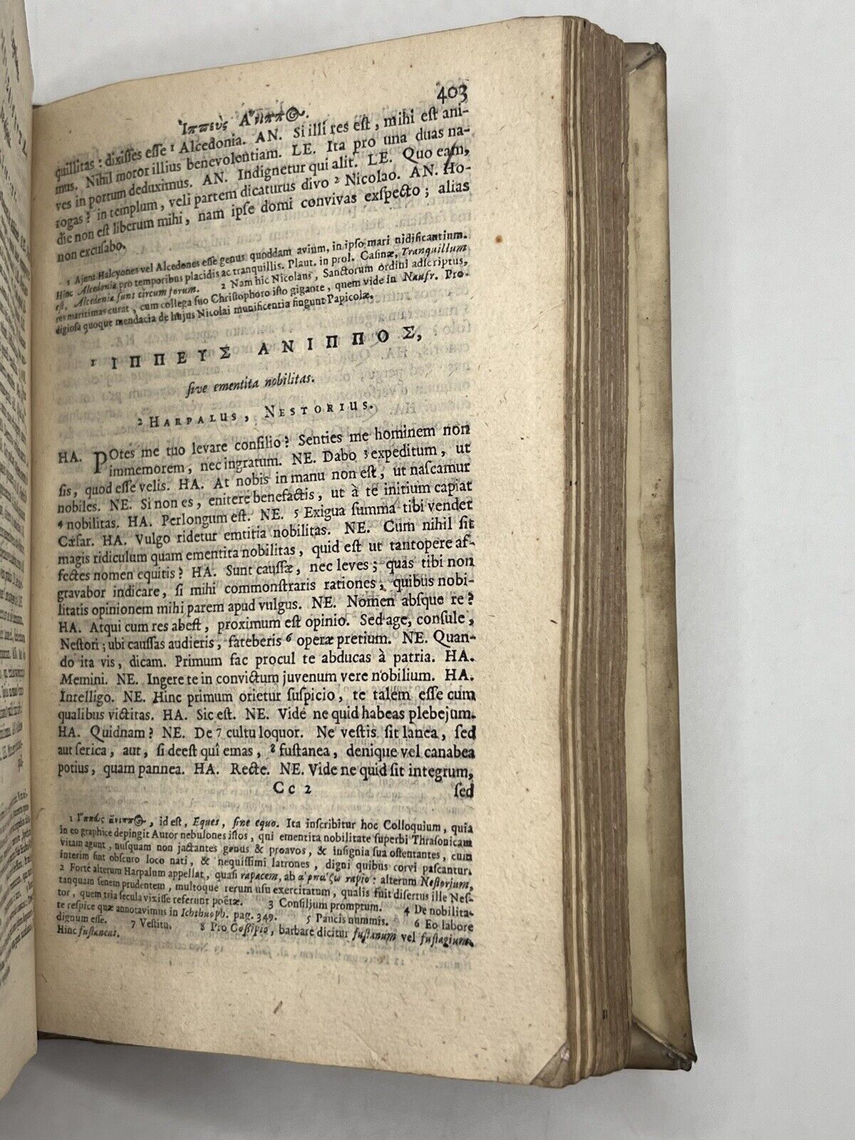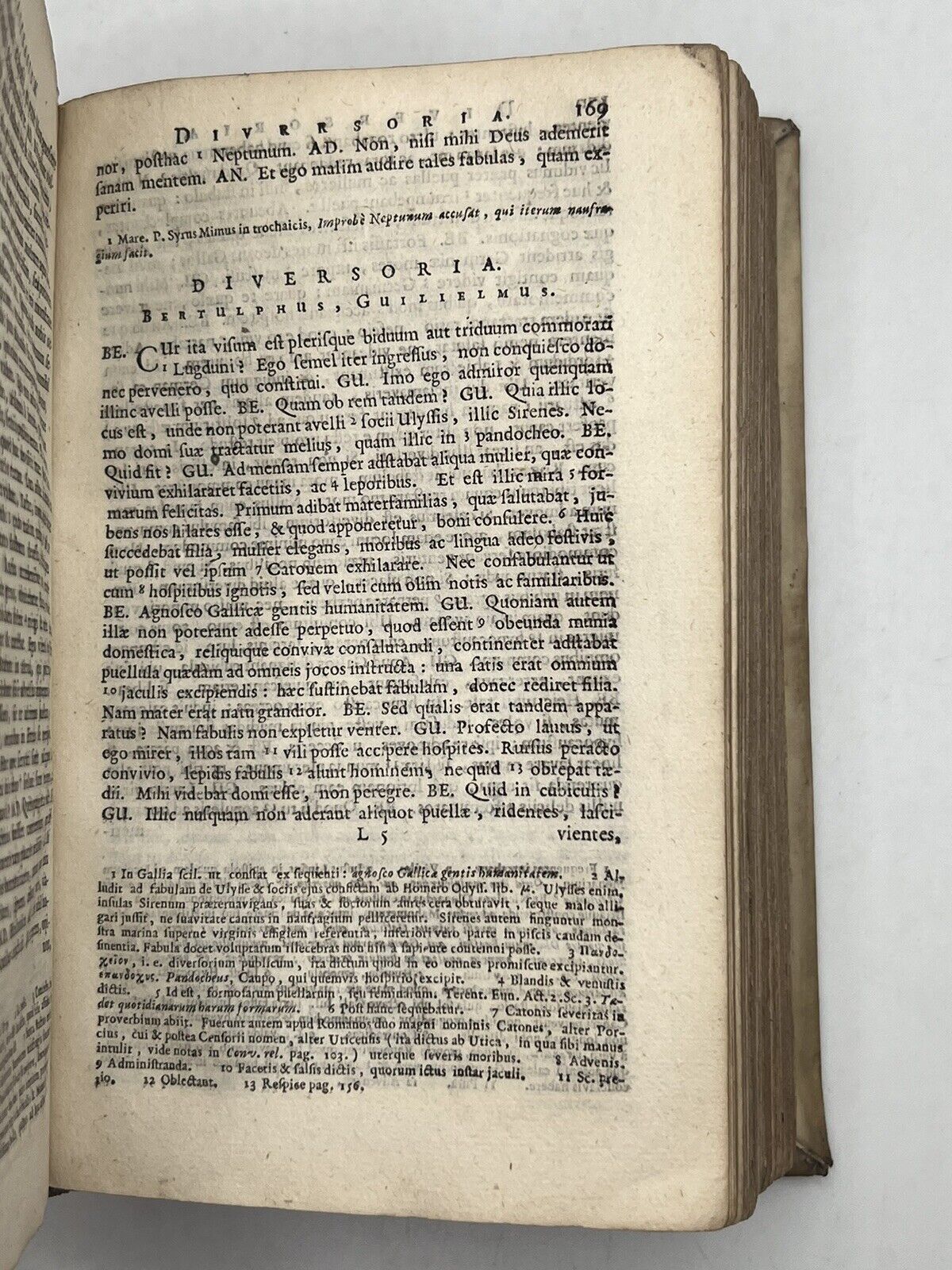 In this 1693 edition, edited by Petrus Rabus of Rotterdam, the Colloquies are added with his notes. Rabus' annotations are invaluable, providing clarity and commentary that enhance understanding of Erasmus' nuanced arguments.