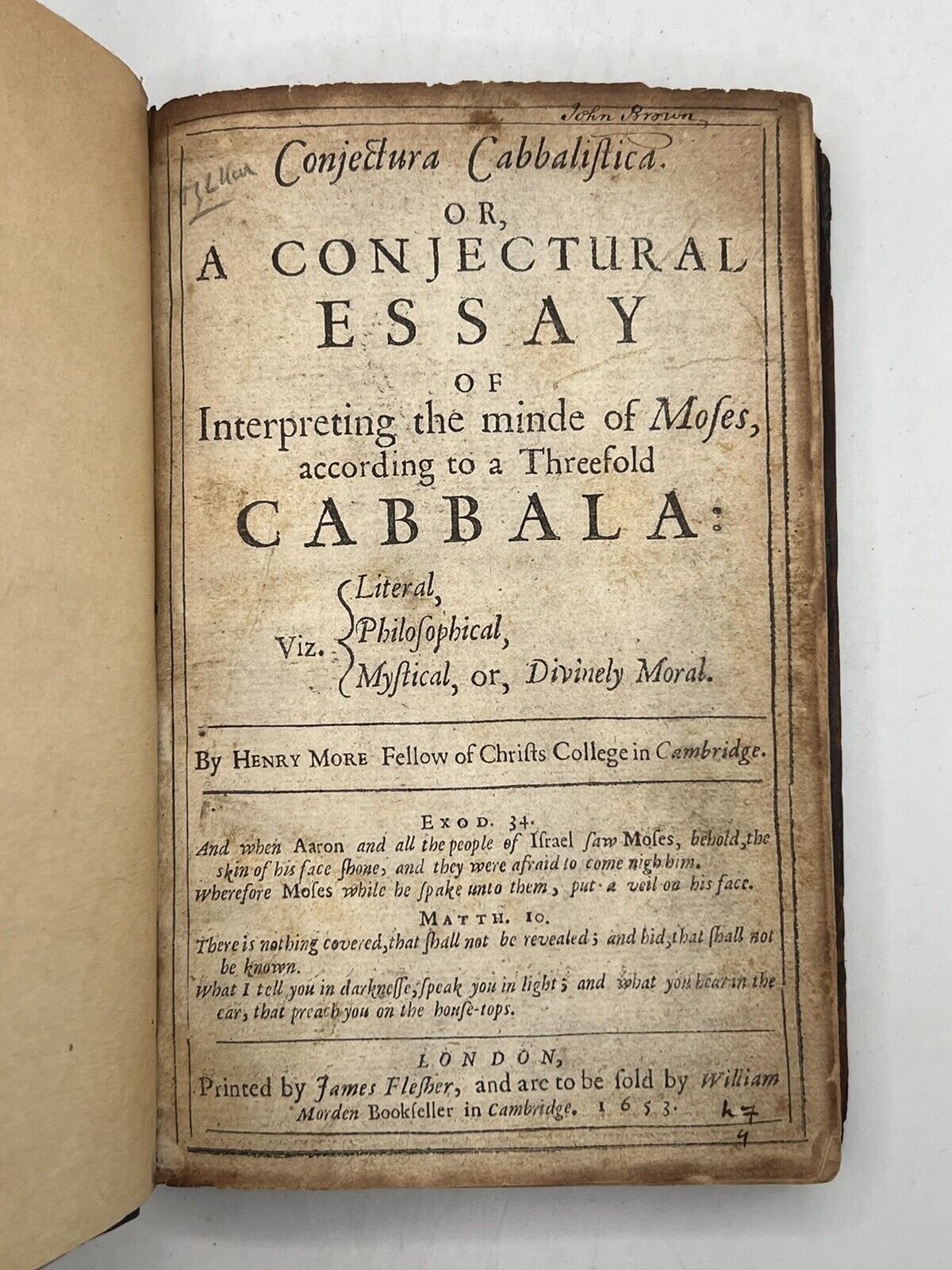 Conjectura Cabbalistica. Or, A Conjectural Essay of Interpreting the minde of Moses, according to a Threefold Cabbala: Viz: Literal, Philosophical, Mystical, or, Divinely Moral. By Henry More. London: James Flesher, 1653.