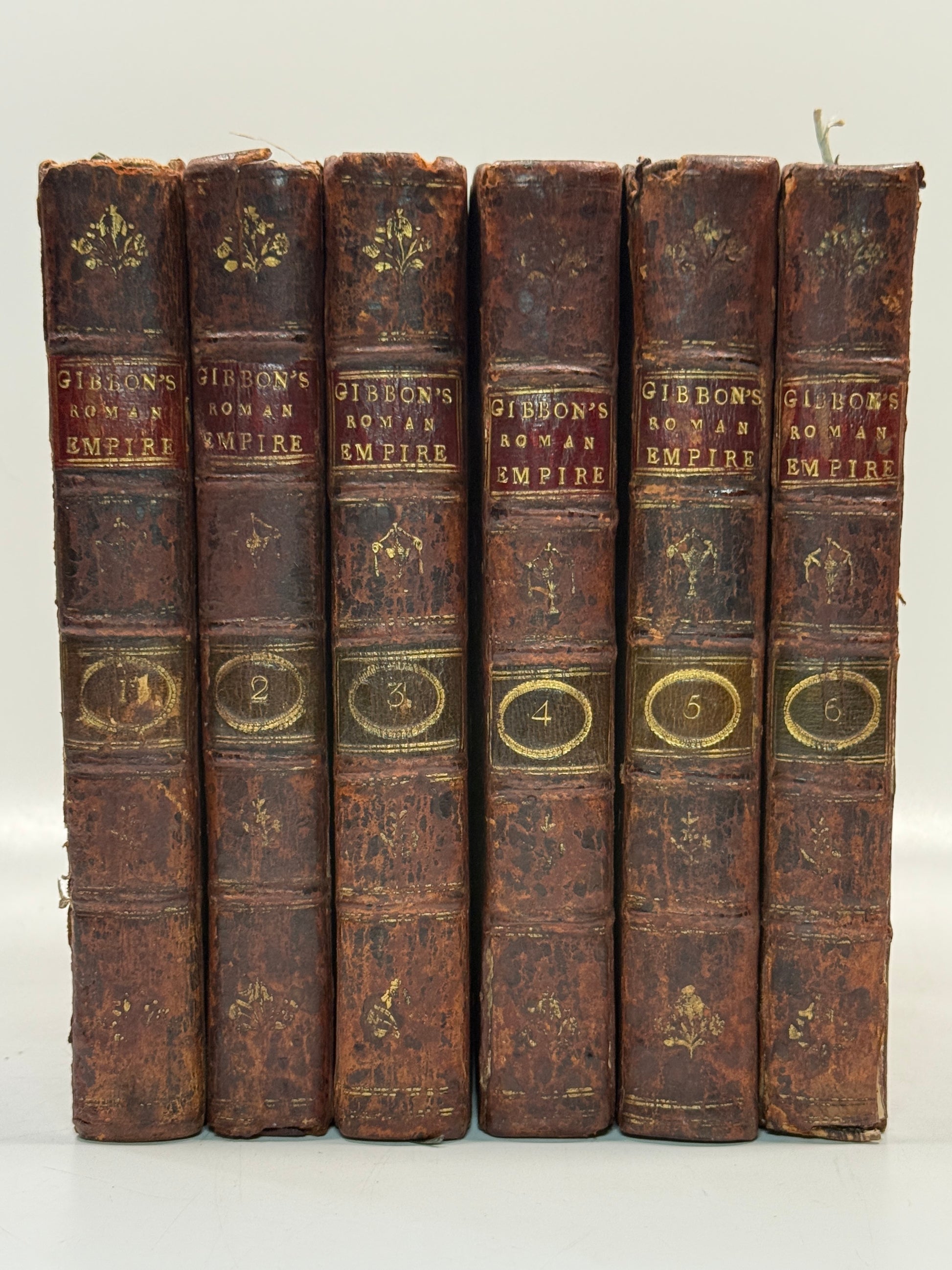 FIRST EDITION THUS, a very rare pirated Dublin edition of Gibbon's magnum opus. A beautiful set in attractive contemporary bindings, very rare in such excellent condition. Volume one is the fourth edition and volumes two through to six are all of the first edition thus and are dated 1781. This set is the first six volumes only, as often, as the later volumes were printed seven years later and so are frequently missing.
