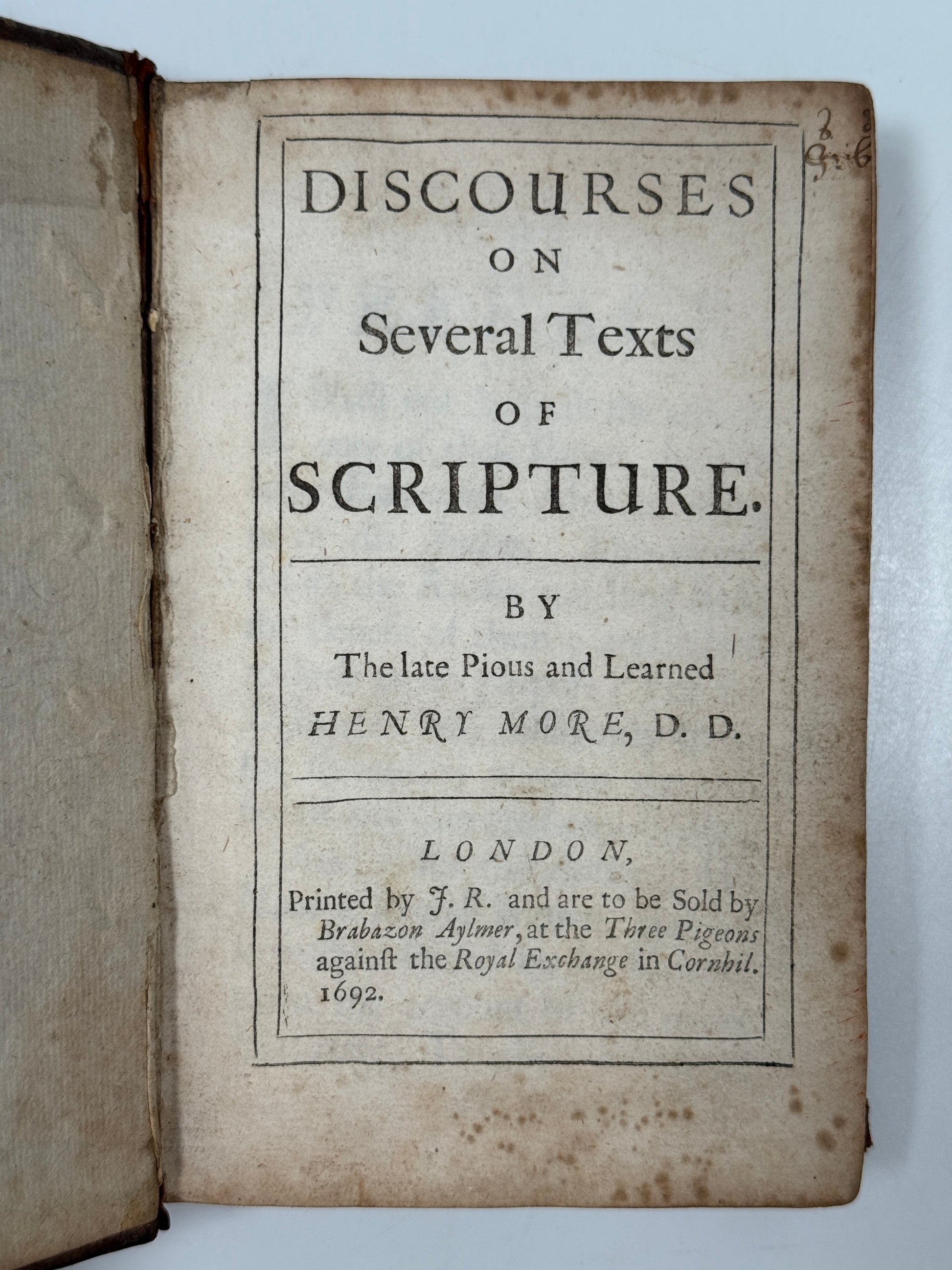 Discourses on Several Texts of Scripture. By the Late Pious and Learned Henry More, D.D. London: Printed by J. R. and are to be Sold by Brabazon Aylmer, 1692.