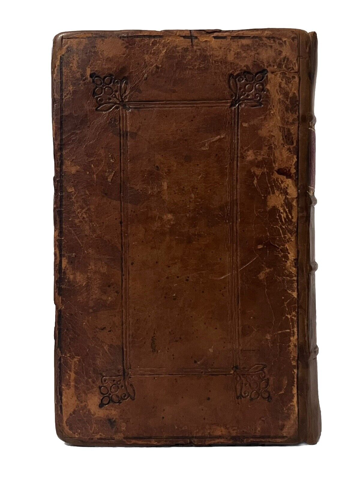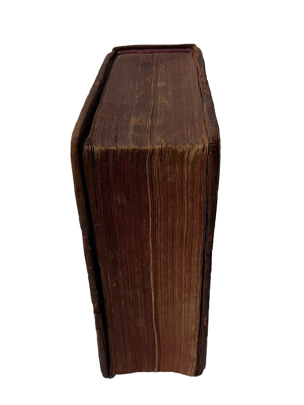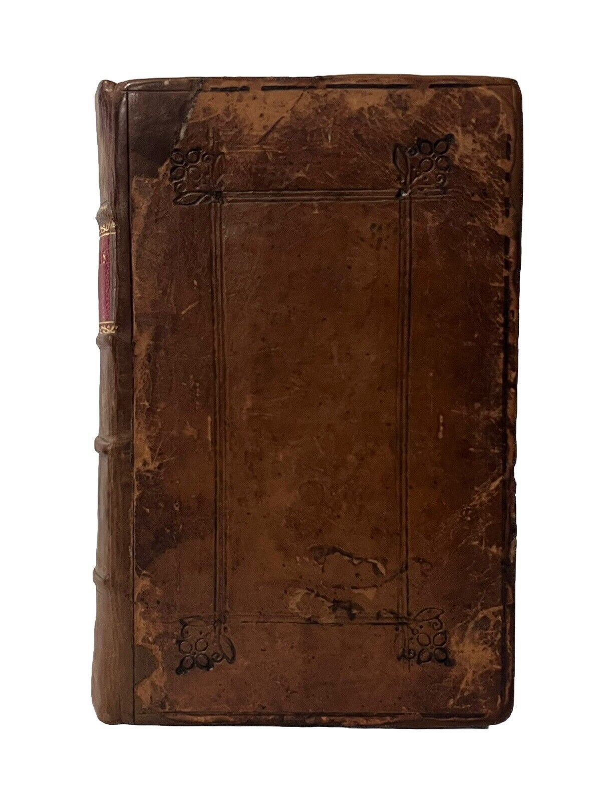 Full brown calf binding, rebacked, with a red tooled label in a compartment to the spine between raised bands, and with decorative blind-stamped borders on both boards. Binding rubbed and scuffed. Shelf and edge wear. Red page edges dulled. No shelf lean. Text block fairly clean with light toning, minor foxing, and occasional very small ink stains. Ink inscriptions to front blank, first title page, pp.432 which is a blank page, the second title page, and on the rear blank. Ink ownership inscription to the paper which would have been underneath the front pastedown, rubbed thus lacking some of the inscription. Lacking pastedowns. Edge tears with minor loss to front blanks.