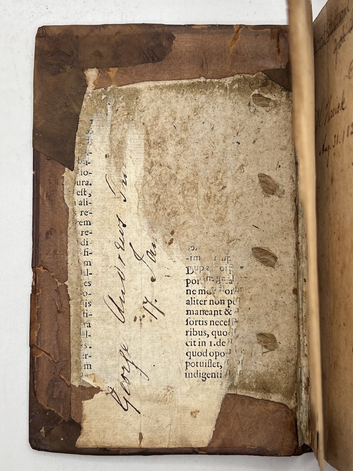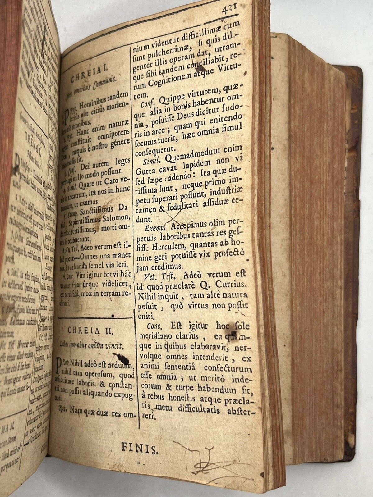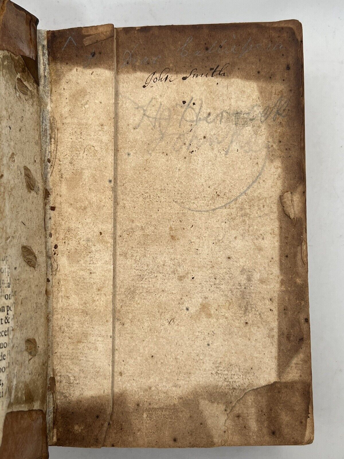 Full brown calf binding, rebacked, with a red tooled label in a compartment to the spine between raised bands, and with decorative blind-stamped borders on both boards. Binding rubbed and scuffed. Shelf and edge wear. Red page edges dulled. No shelf lean. Text block fairly clean with light toning, minor foxing, and occasional very small ink stains. Ink inscriptions to front blank, first title page, pp.432 which is a blank page, the second title page, and on the rear blank. Ink ownership inscription to the paper which would have been underneath the front pastedown, rubbed thus lacking some of the inscription. Lacking pastedowns. Edge tears with minor loss to front blanks.