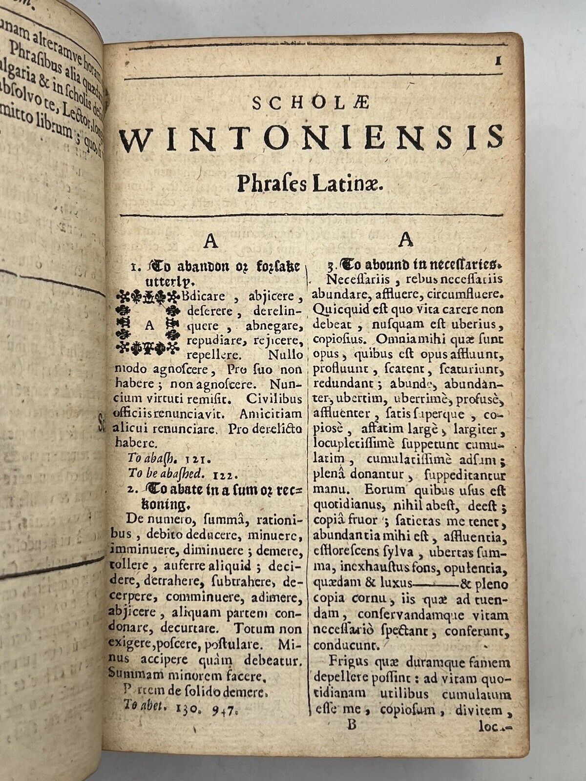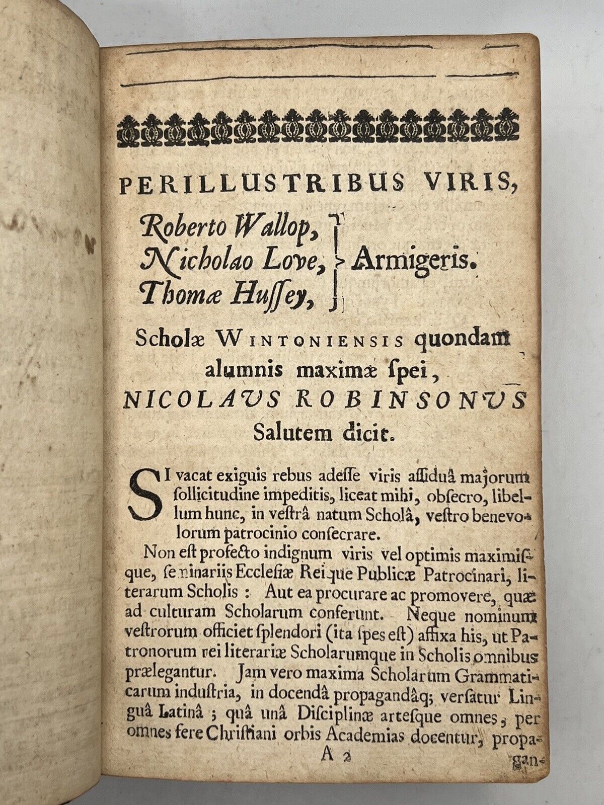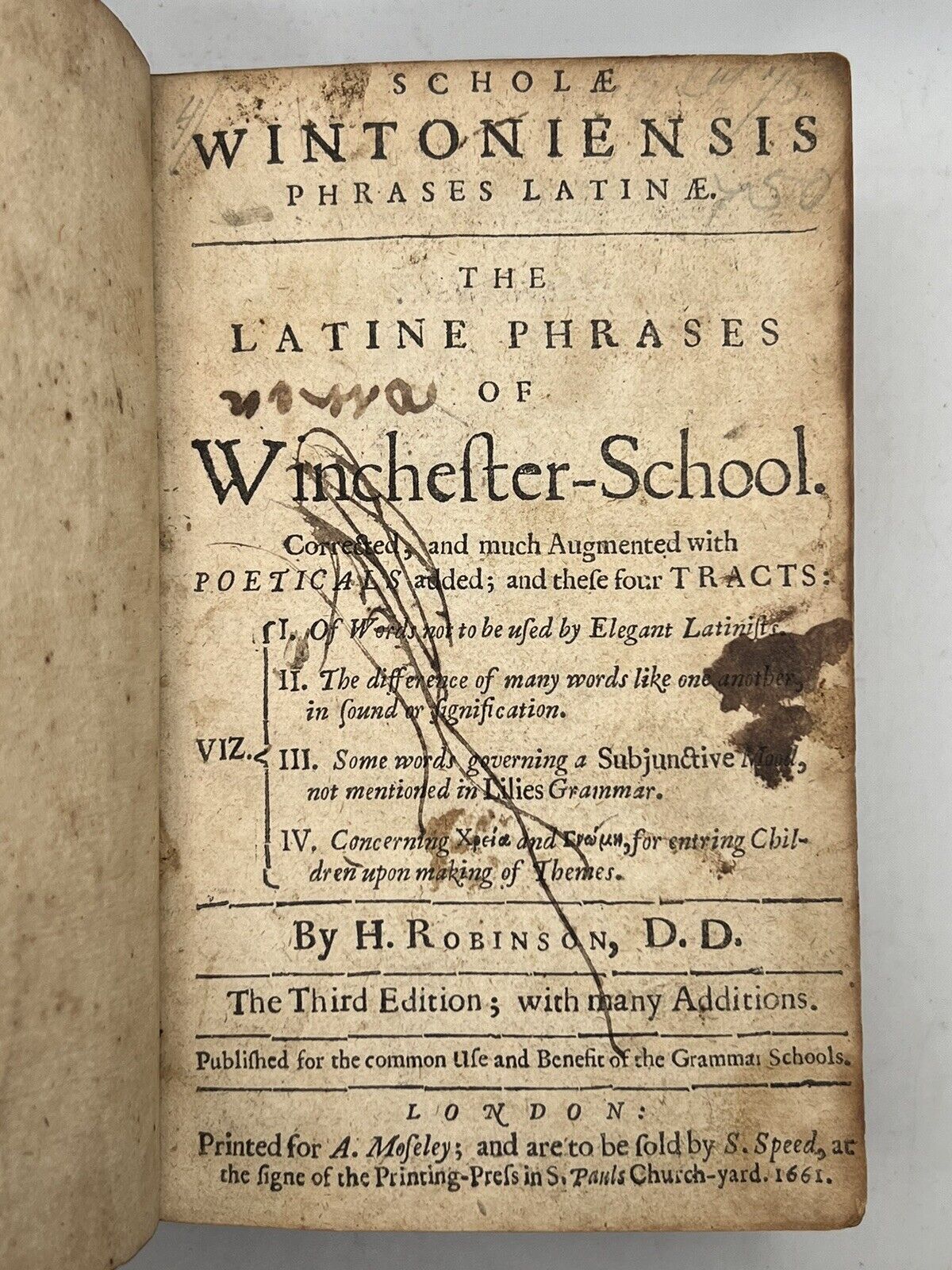 Scholae Wintoniensis Phrases Latinae. The Latine Phrases of Winchester-School. Corrected, and Much Augmented with Poeticals Added; and These Four Tracts: Viz. I. Of Words Not to be Used by Elegant Latinists. II. The Difference of Many Words Like One Another, in Sound or Signification. III. Some Words Governing a Subjunctive Mood, Not Mentioned in Lilies Grammar. IV. Concerning [chreia] and [gnom], for Entring Children Upon Making of Themes. By H. Robinson, D.D. The Third Edition; with Many Additions. Published for the Common Use and Benefit of the Grammar Schools. London: Printed for A. Moseley, 1661.