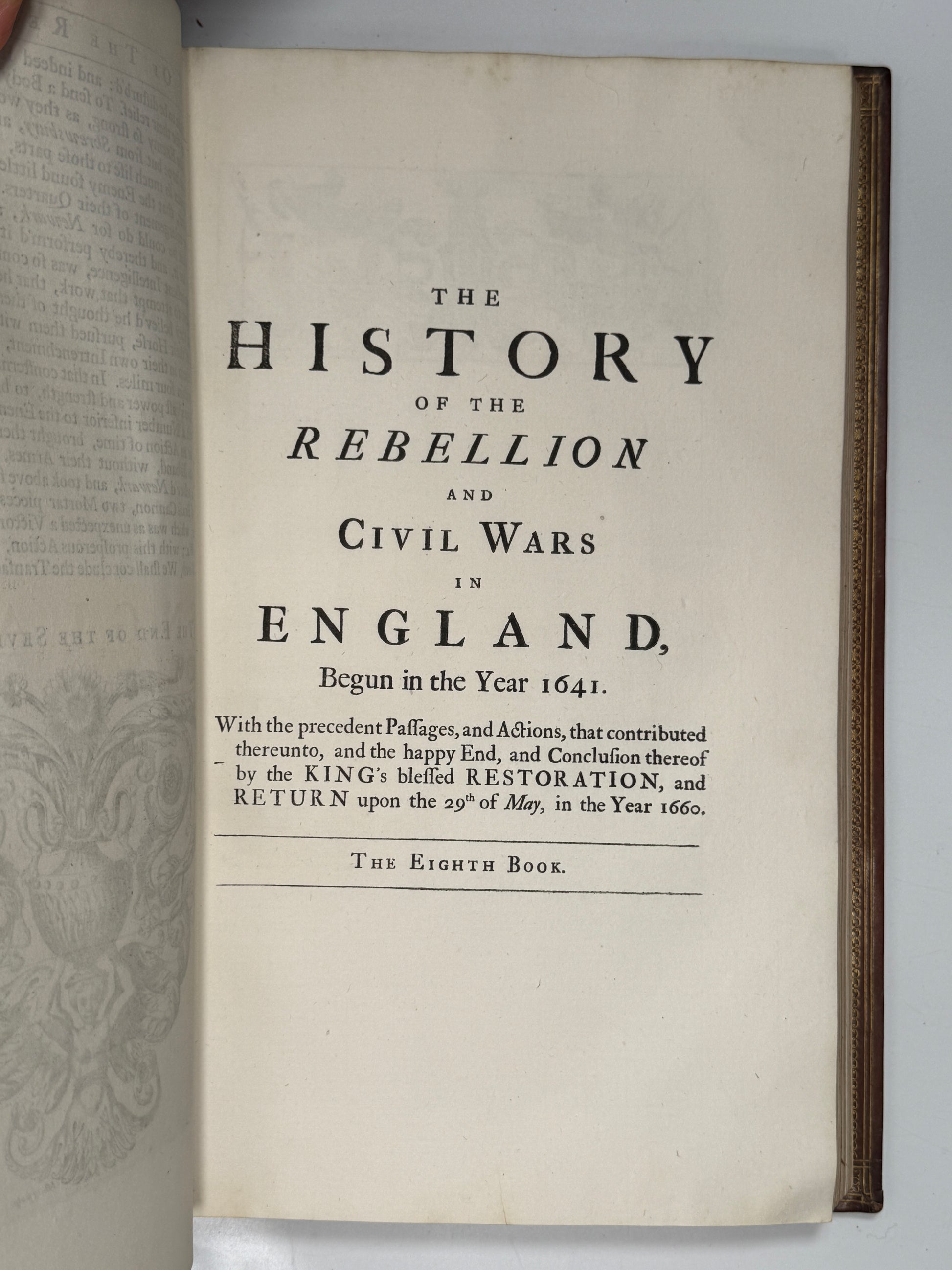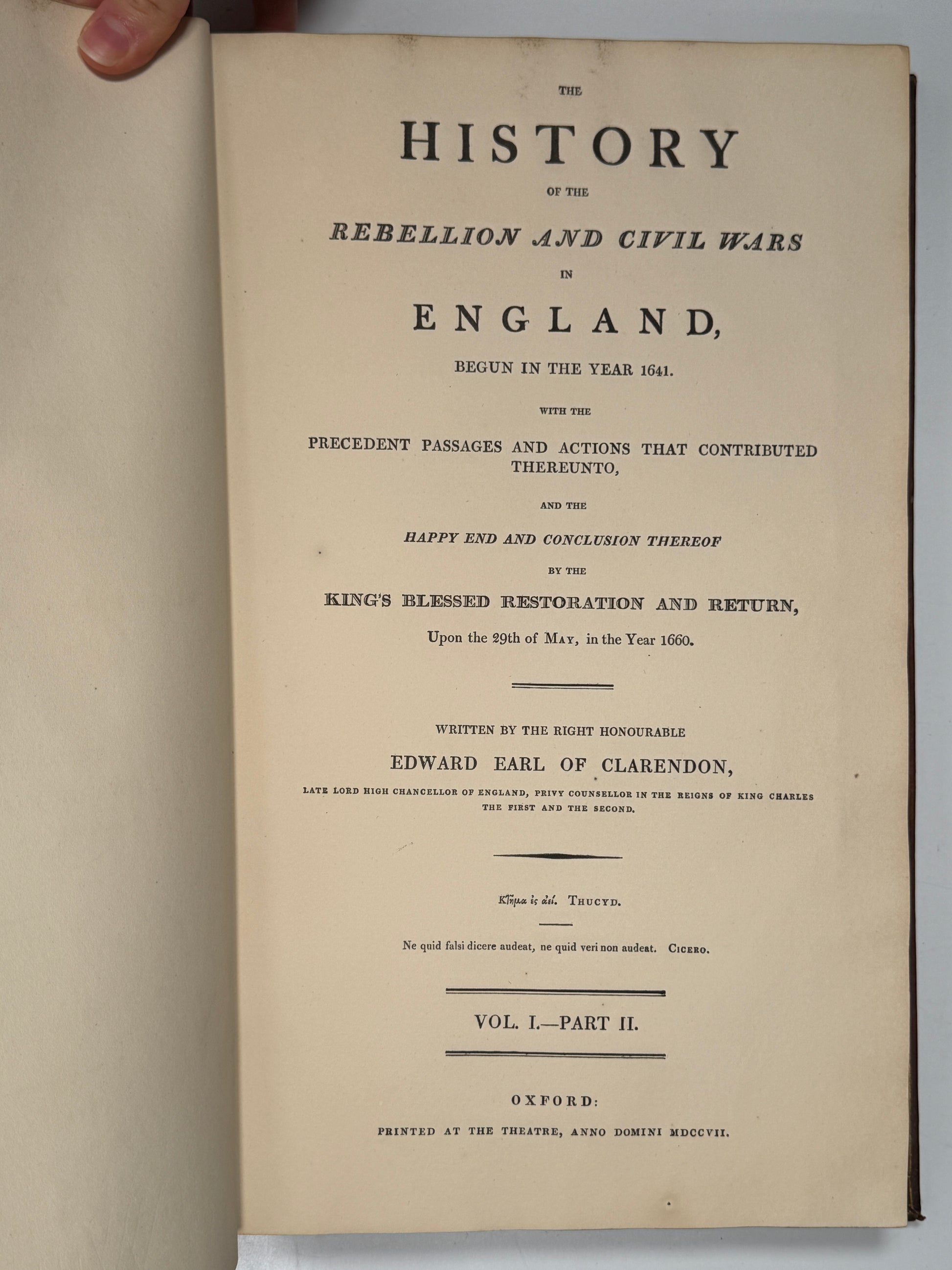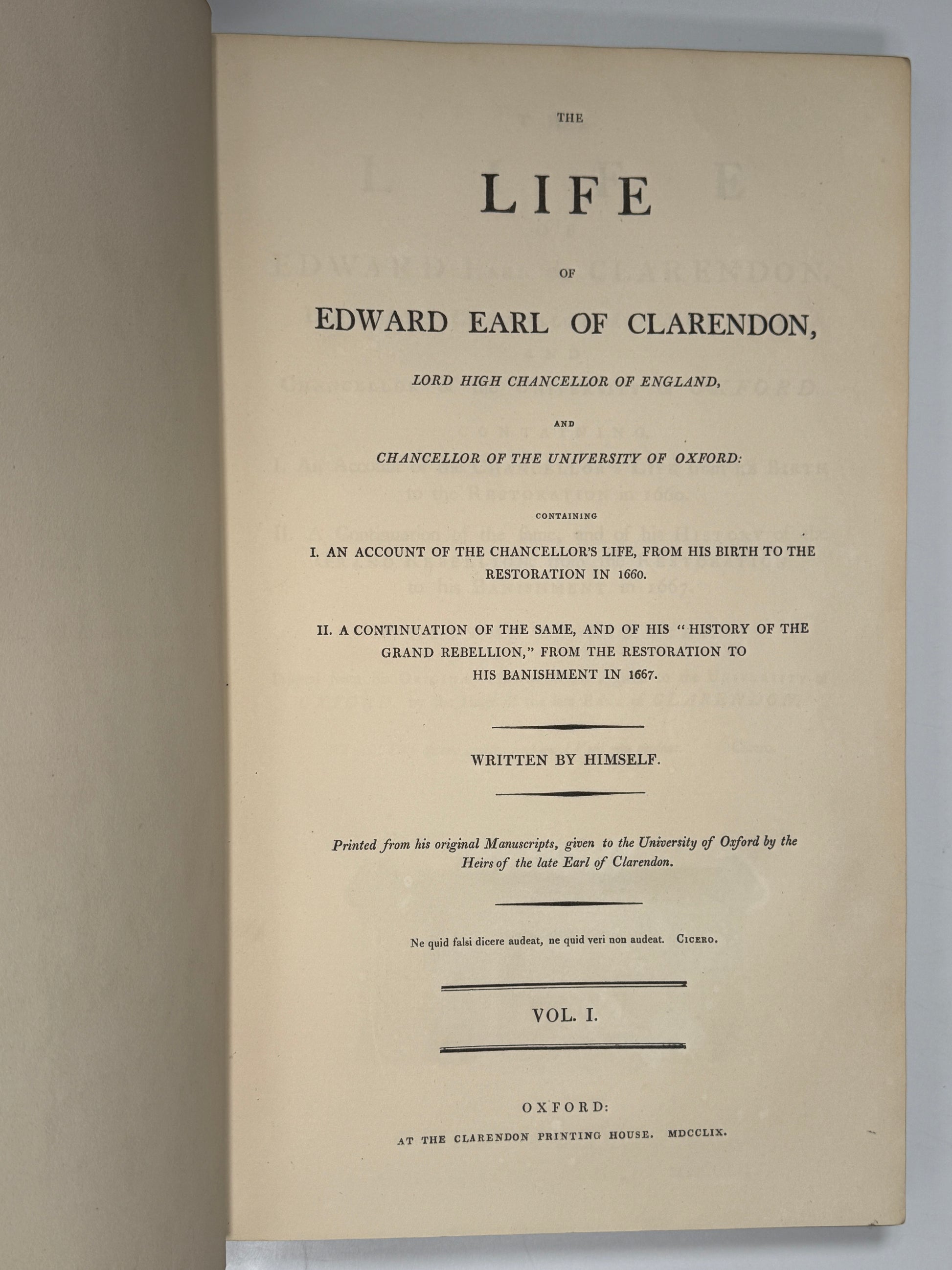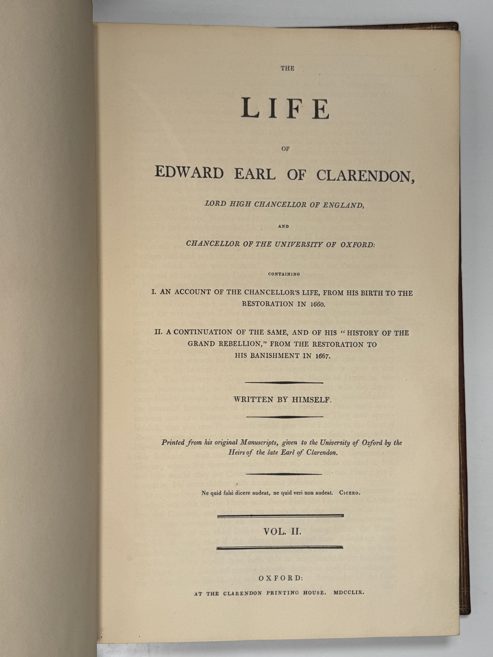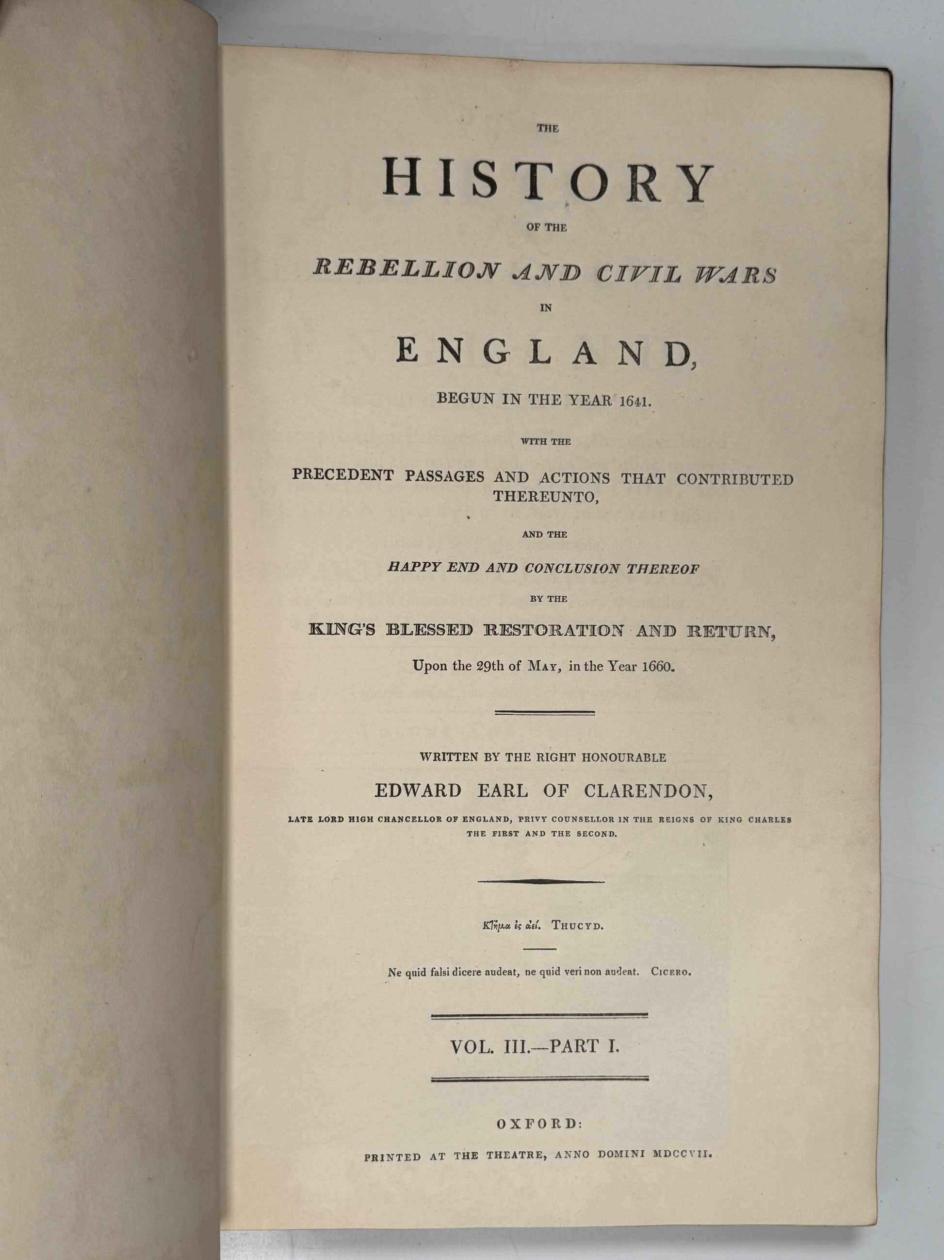 The Life of Edward Earl of Clarendon Containing I. An Account of the Chancellor's Life, From His Birth to the Restoration in 1660. II. A Continuation of the Same, and of His "History of the Grand Rebellion," From the Restoration to His Banishment in 1667. Written by Himself. Oxford: at the Clarendon Press, 1759. [together with] The History of the Rebellion and Civil Wars in England. By the Right Honourable Edward Earl of Clarendon. Oxford: Printed at the Theatre, 1707, folios.