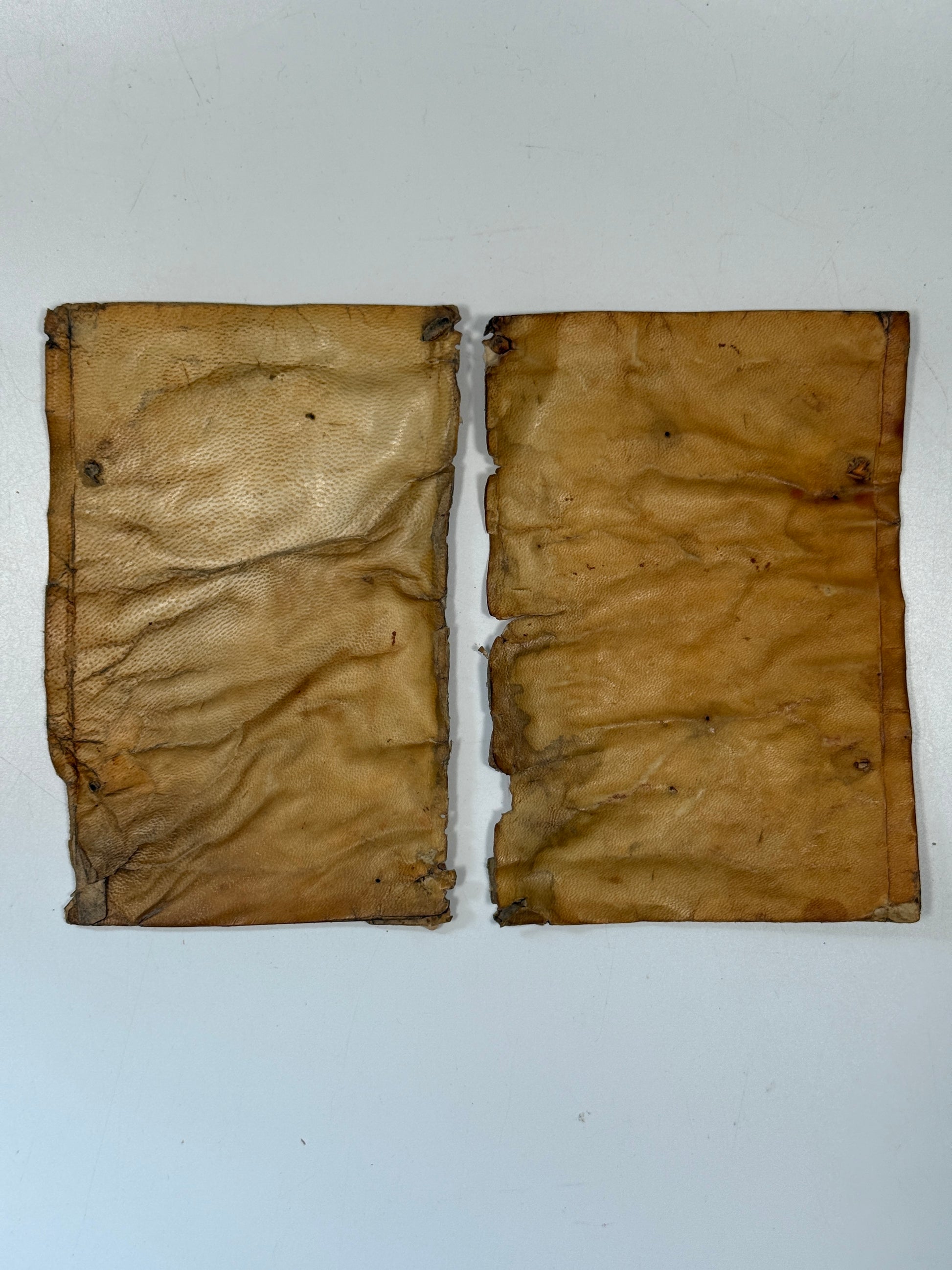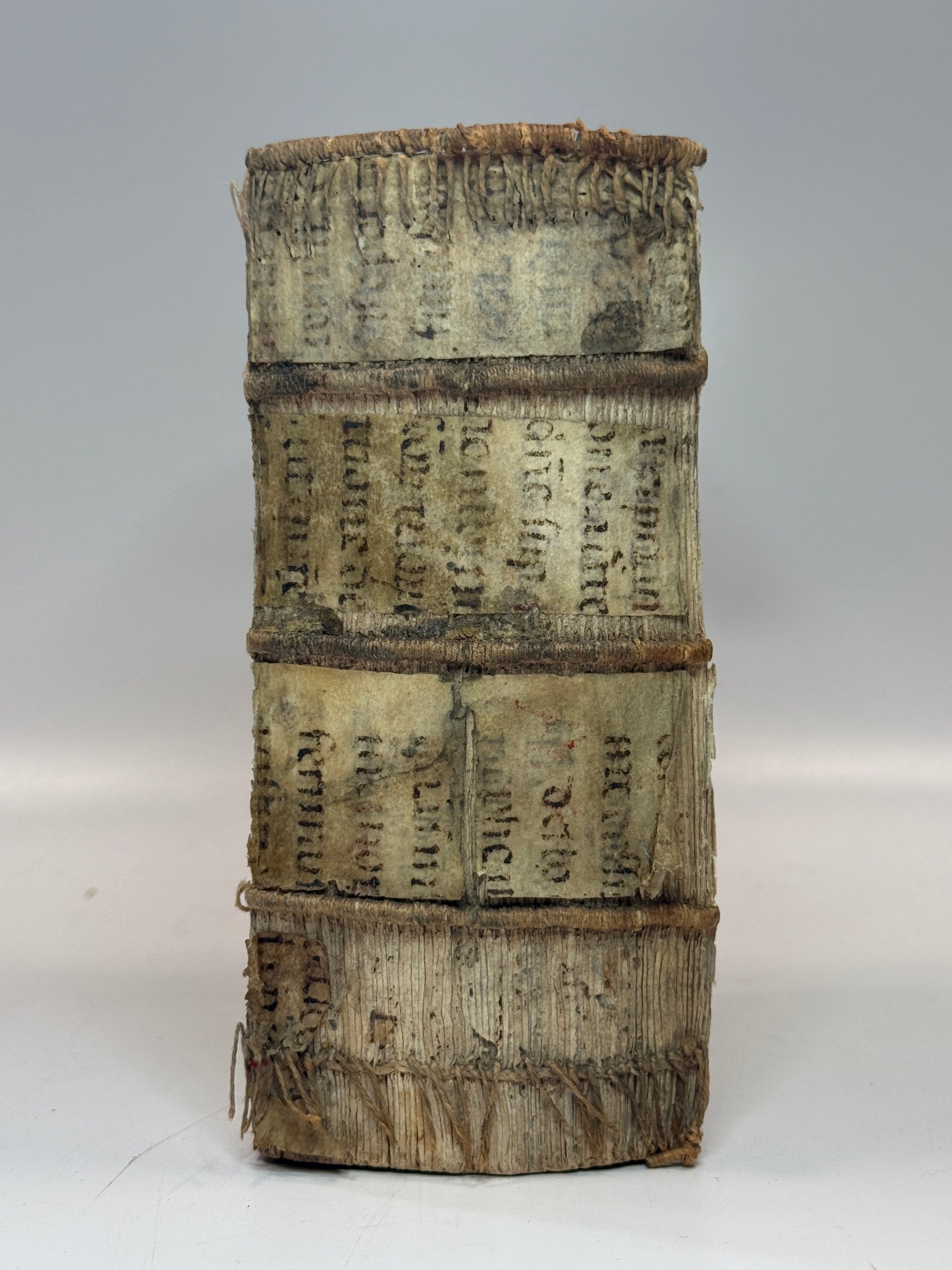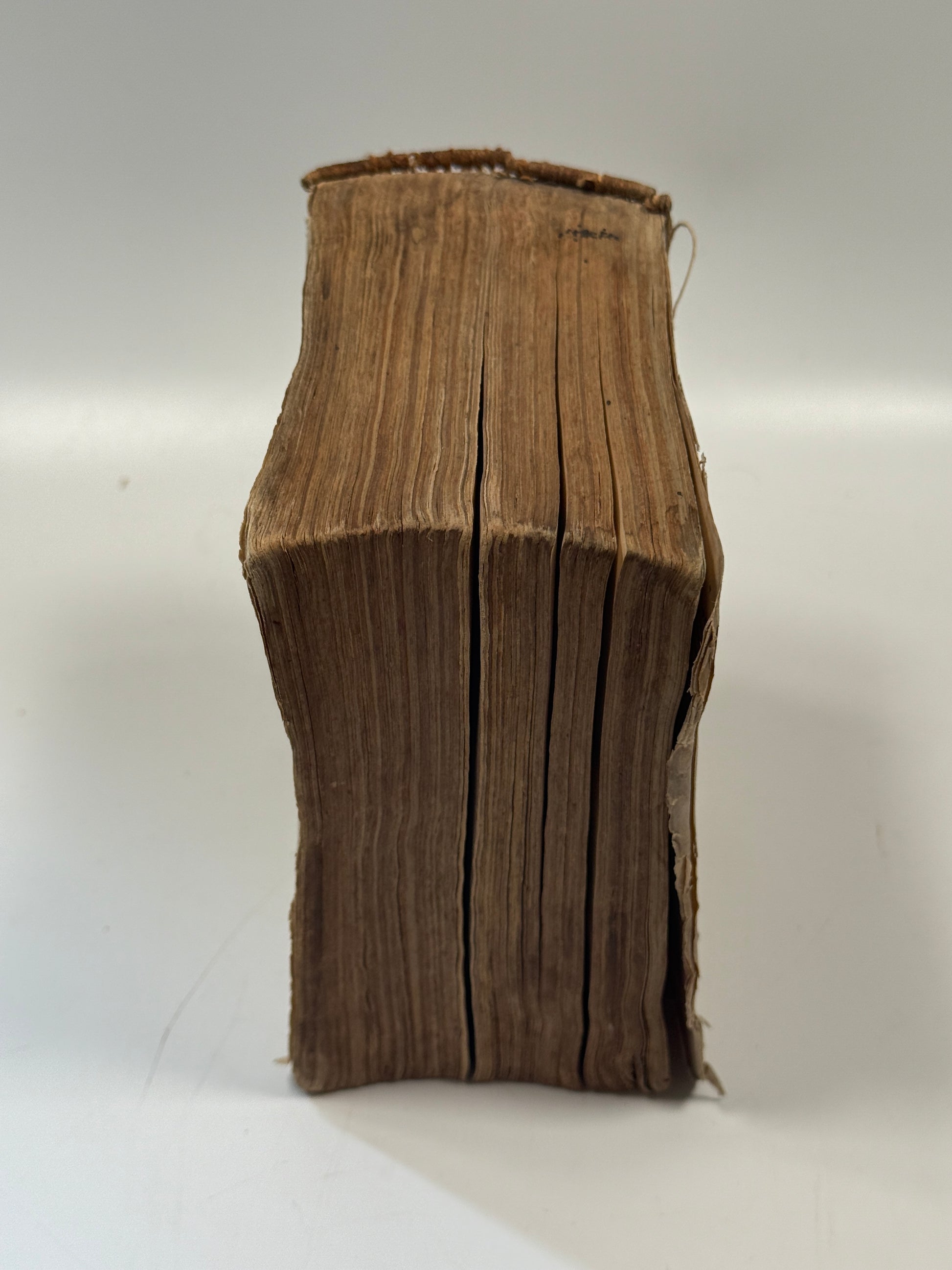 Vellum binding, worn, crinkled, rubbed and with some marks. Backstrip lacking. Both boards detached. Small tear to rear blank. Holes present to both boards from where there used to be ties. Page edges unevenly toned with some marks. Bookplates attached to front and rear pastedown. Ink inscription to front pastedown reading "HH. XXIV. 4." Small holes to the title page. Text block fairly clean with some light toning, occasional foxing, and some damp staining to edges to occasional leaves. Uncollated. Last gathering detached. Ink inscription to rear blank.
