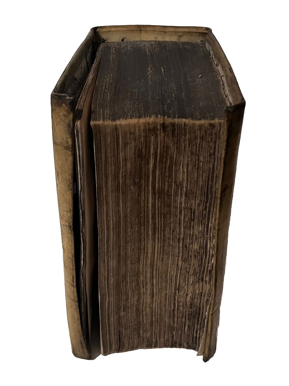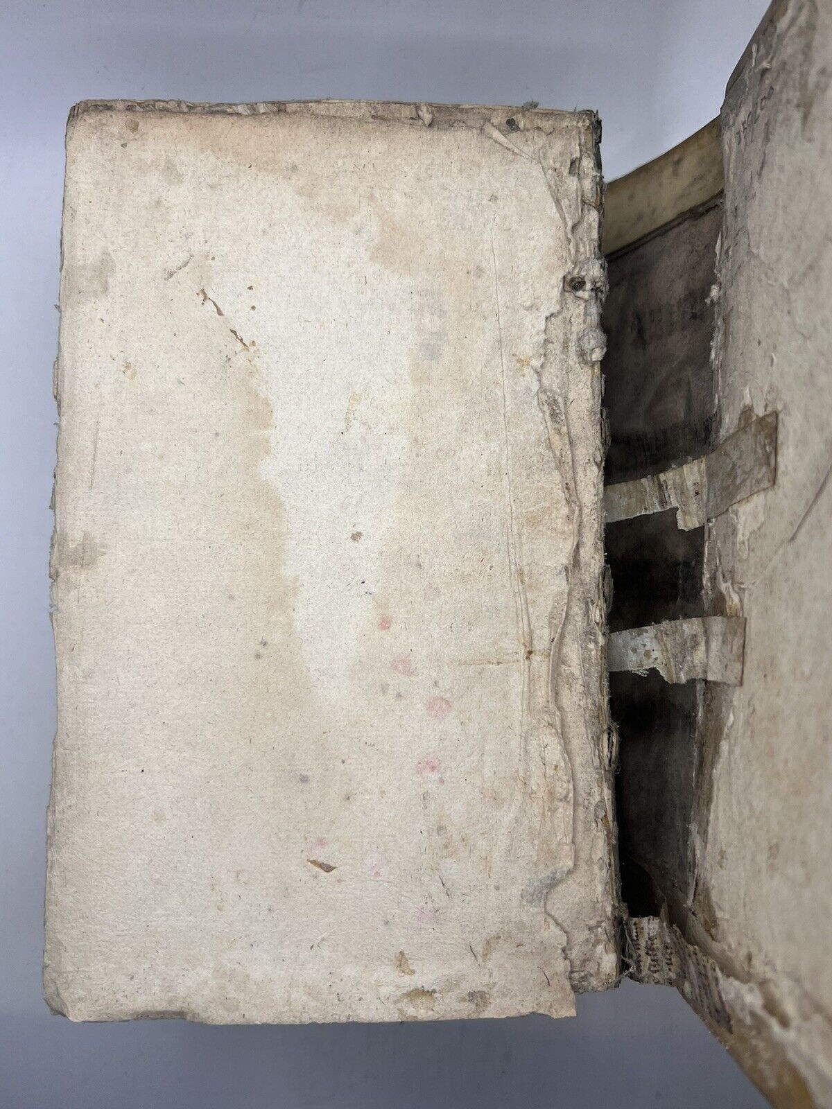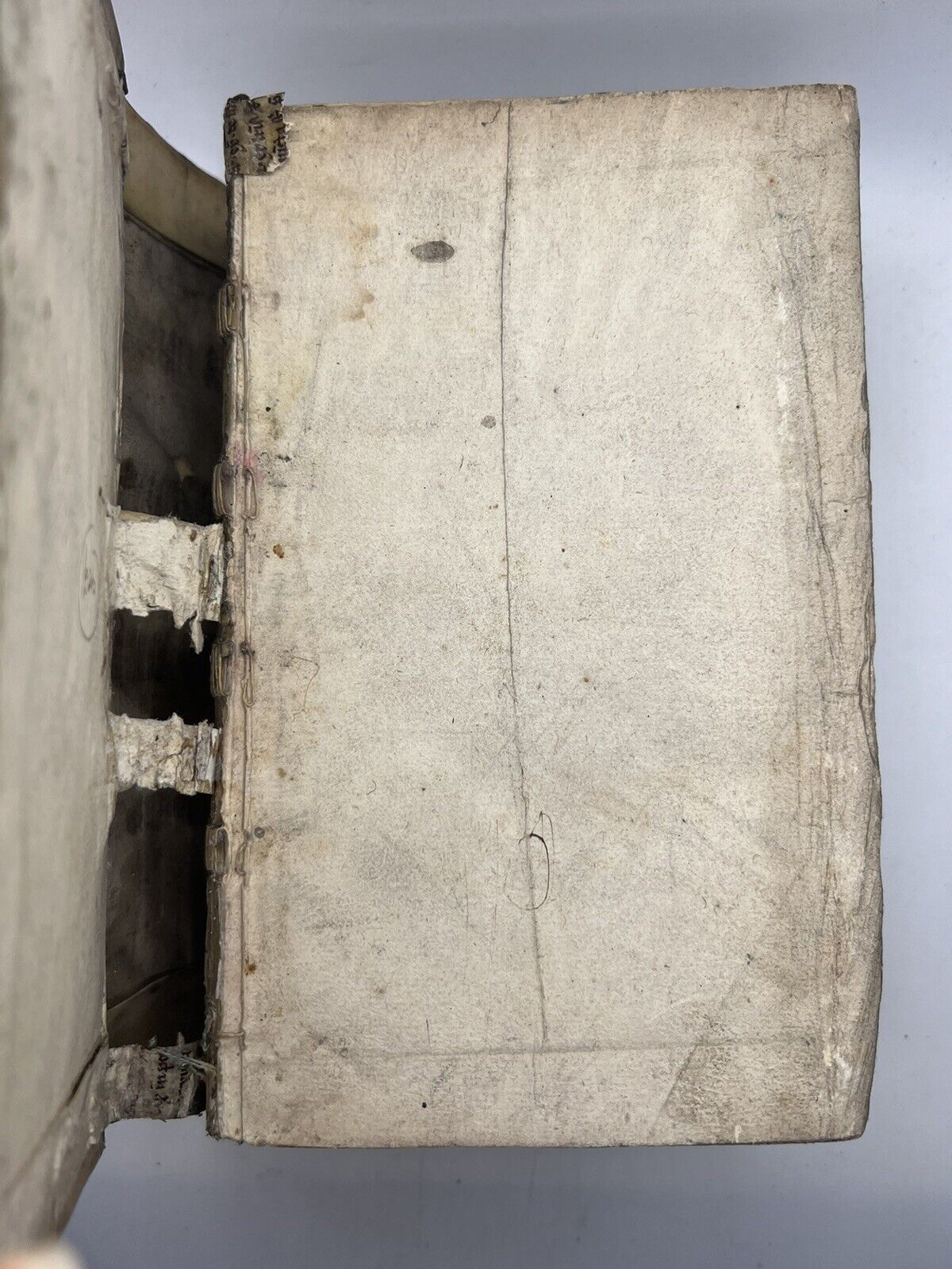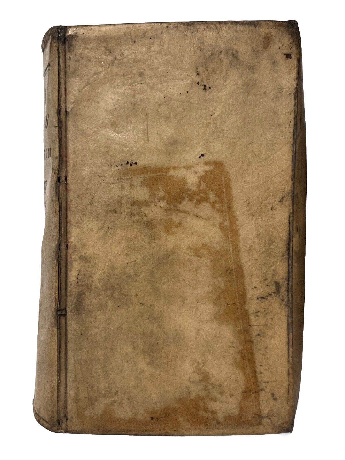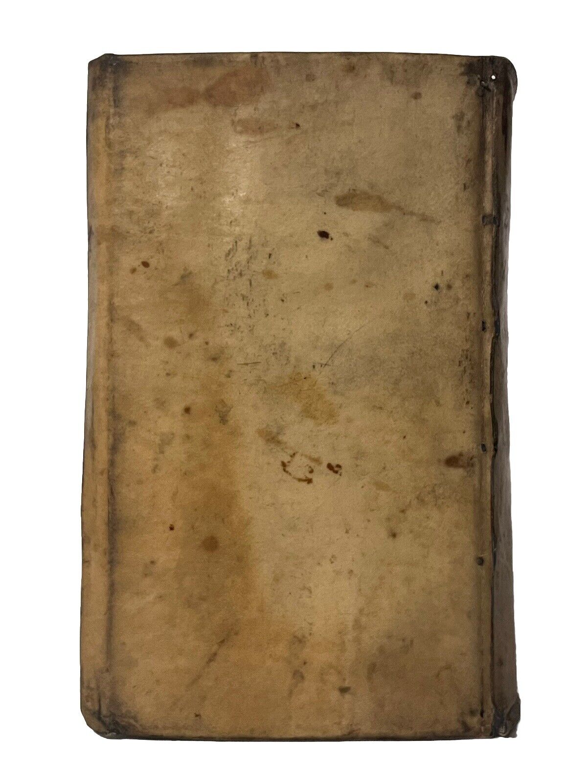 Full vellum binding with a handwritten ink title and date to the spine. Binding lightly rubbed and scuffed with some discolouration and marks. Both boards securely attached. Shelf and edge wear with the side edges turned-in. Page edges toned and discoloured as often. Page block very attached loosely to the binding with spine and page block separation, and only attached with few thin strips of paper; more so detached at the rear; thus very fragile. Text block fairly clean with edge toning and occasional foxing, some leaves more so than others. Rear blank detached but present. Overall a lovely copy, significantly better than typically encountered.