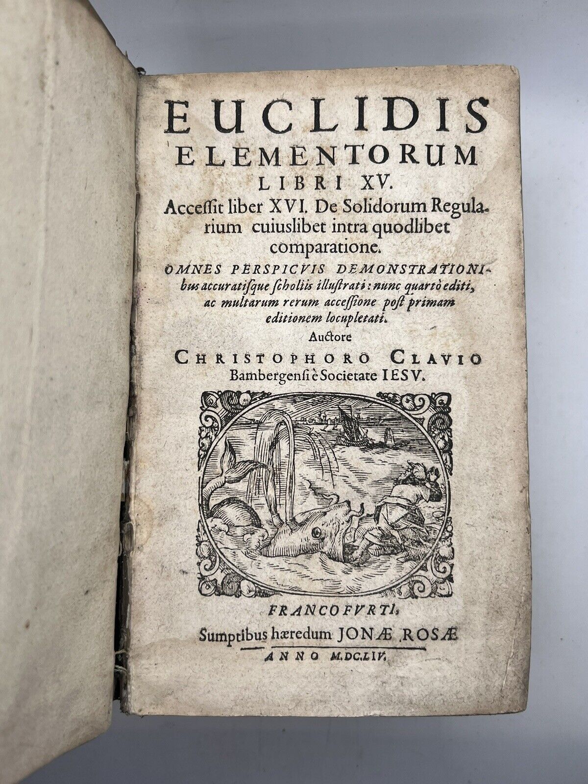 Euclidis Elementorum Libri XV. Accessit Liber XVI. De Solidorum Regularium Cuiuslibet Intra Quodlibet Comparatione. Omnes Perspicuis Demonstrationibus Accuratisque Scholiis Illustrati: Nunc Quarto Editi, Ac Multarum Rerum Accessione Post Primam Editionem Locupletati. Auctore Chistophoro Clavio Bambergensie Societate Iesu. Francofurti, Sumptibus Haeredum Jonae Rosae. Anno MDCLIV.