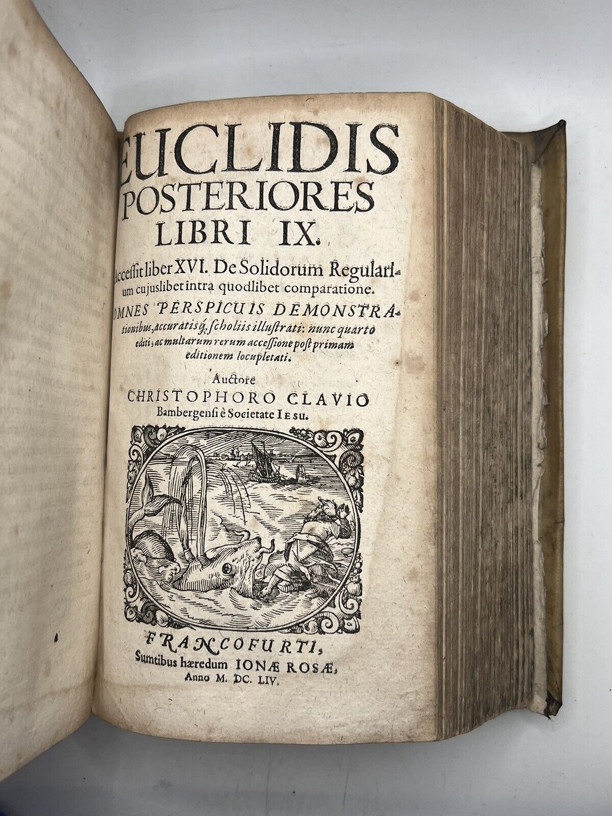 Euclidis Posteriores Libri IX. Accessit Liber XVI. De Solidorum Regularium Cujuslibetintra Quodlibet Comparatione. Omnes Pespicuis Demonstrationibus, Accuratisg, Scholiis Illustrati: Nunc Quarto Editis, Ac Multarum Rerum Accessione Post Primam Editionem Locupletati. Auctore Chistophoro Clavio Bambergensie Societate Iesu. Francofurti, Sumptibus Haeredum Jonae Rosae. Anno MDCLIV.