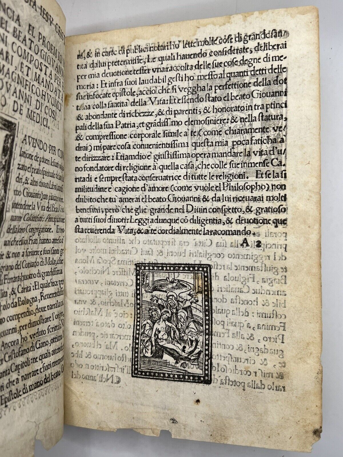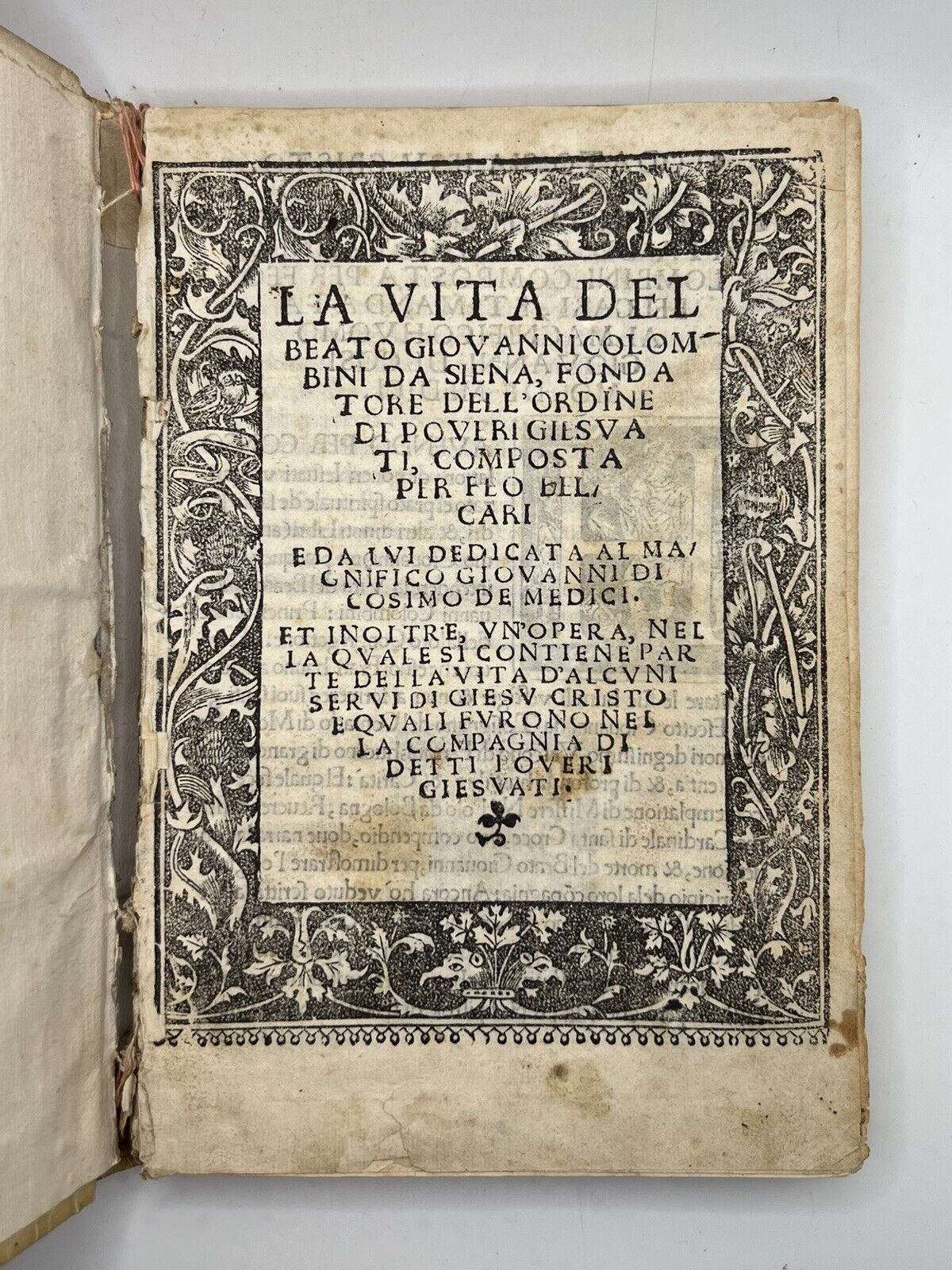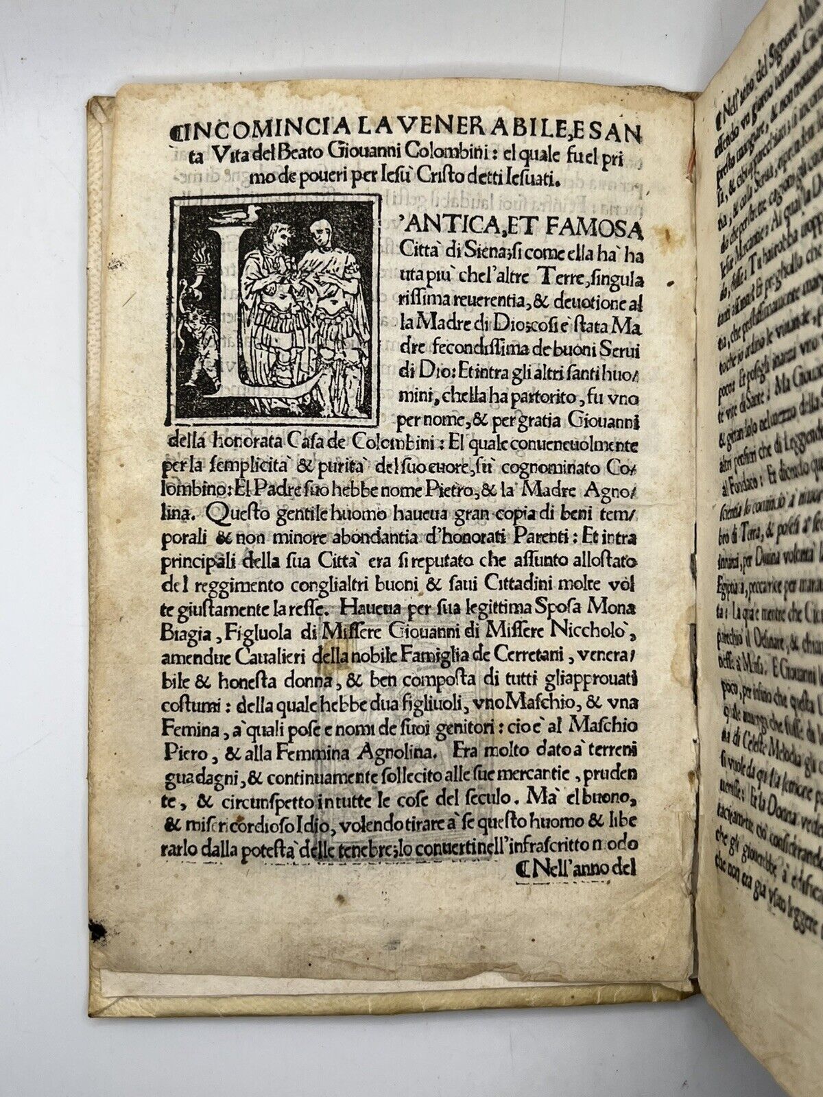 This is the first Sienese edition of The Life of St Giovanni Colombini of Siena by Feo Belcari. Giovanni Colombini was a rich merchant and senator of Siena who abandoned his lifestyle for a life of poverty, Christian service, and evangelism. It was first printed in 1477, this is the third overall edition. There are some very nice historiated woodcut initials to the A1 verso & A2 recto and verso, as well as the fine engraved title page.