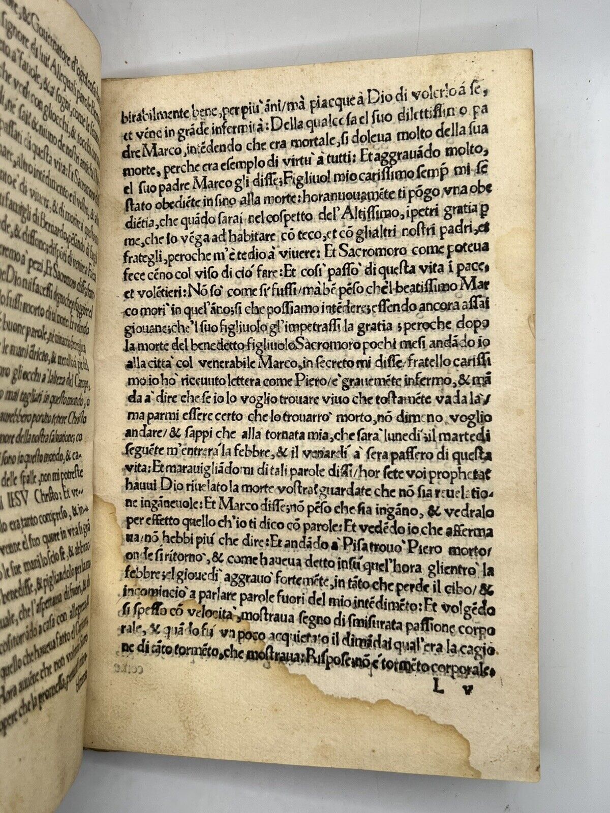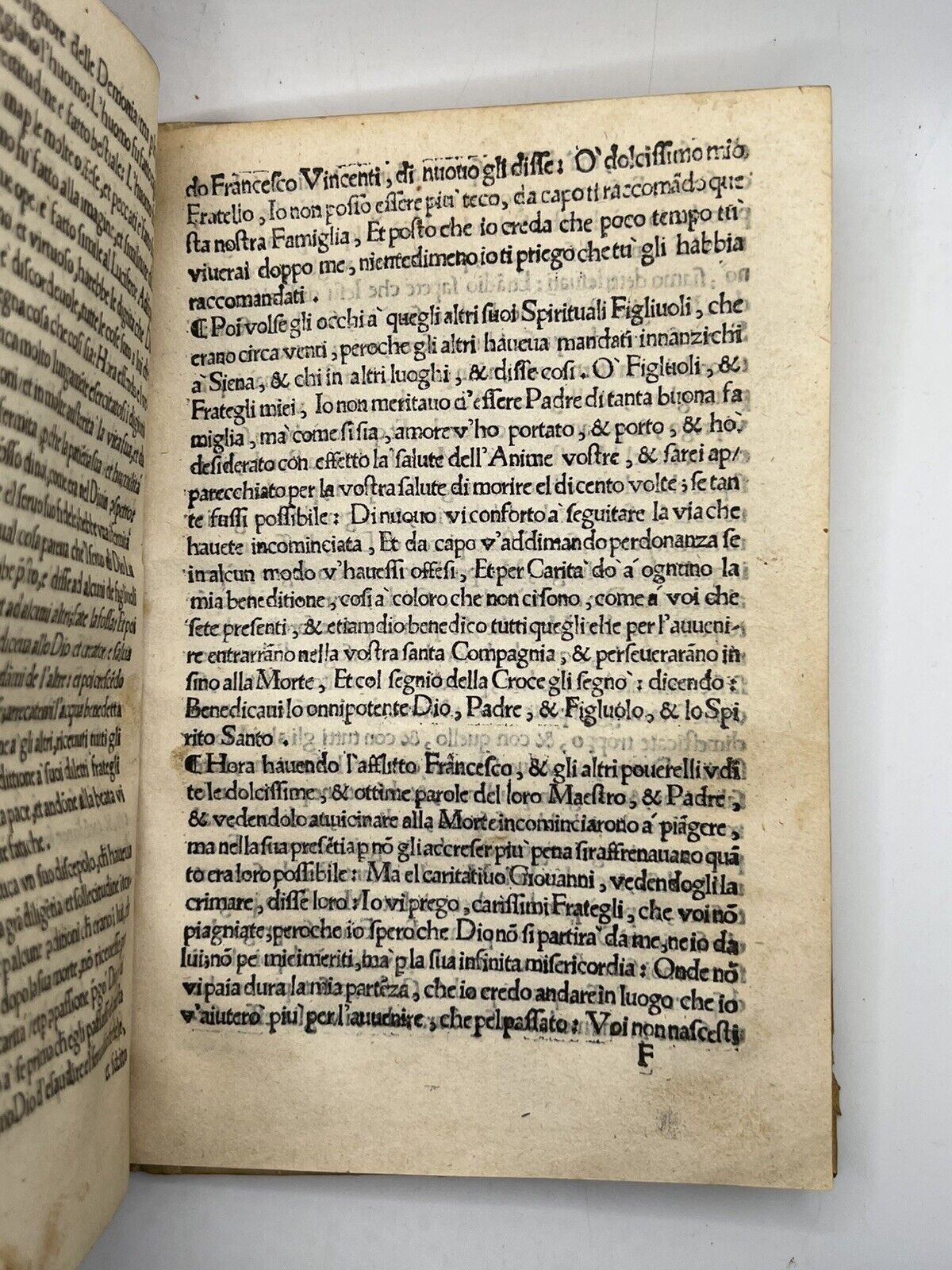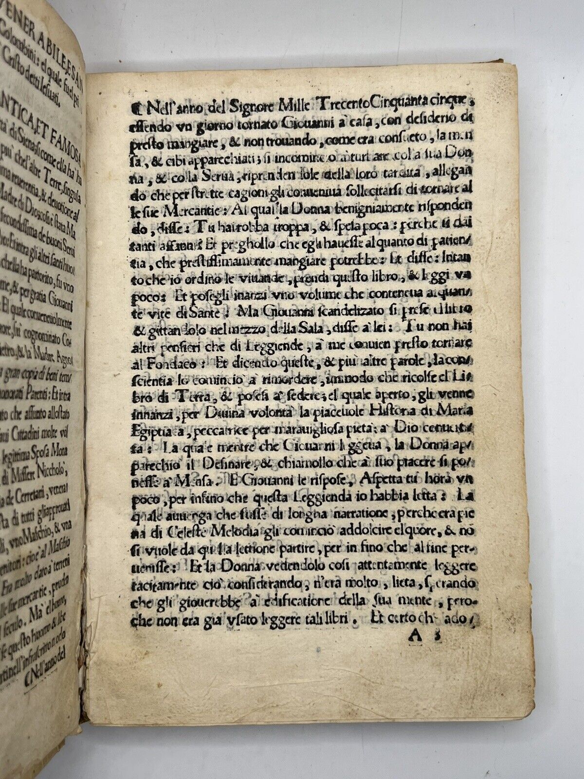 This is the first Sienese edition of The Life of St Giovanni Colombini of Siena by Feo Belcari. Giovanni Colombini was a rich merchant and senator of Siena who abandoned his lifestyle for a life of poverty, Christian service, and evangelism. It was first printed in 1477, this is the third overall edition. There are some very nice historiated woodcut initials to the A1 verso & A2 recto and verso, as well as the fine engraved title page.