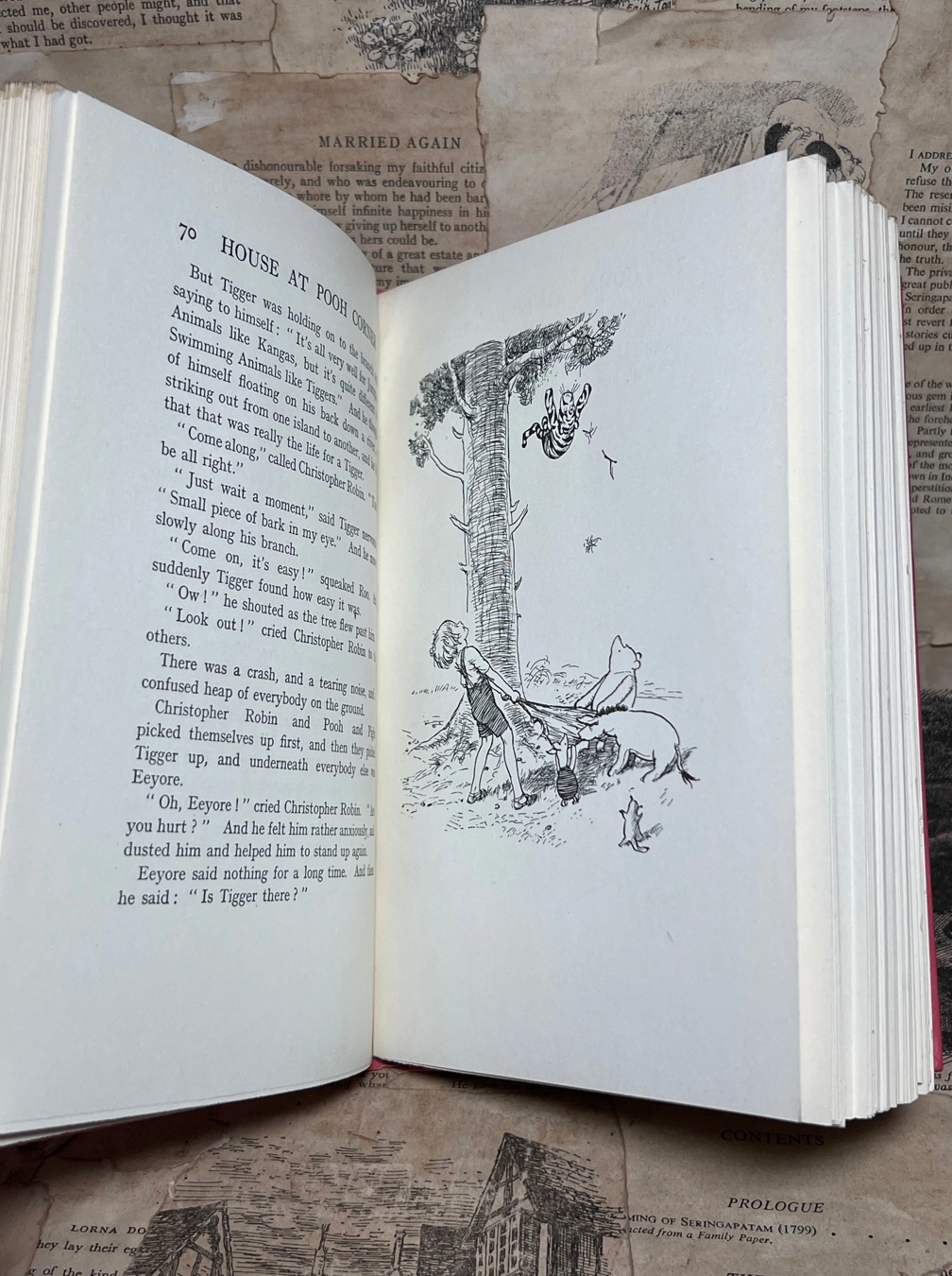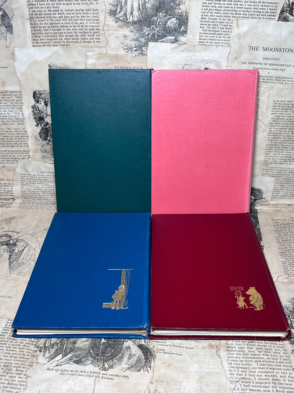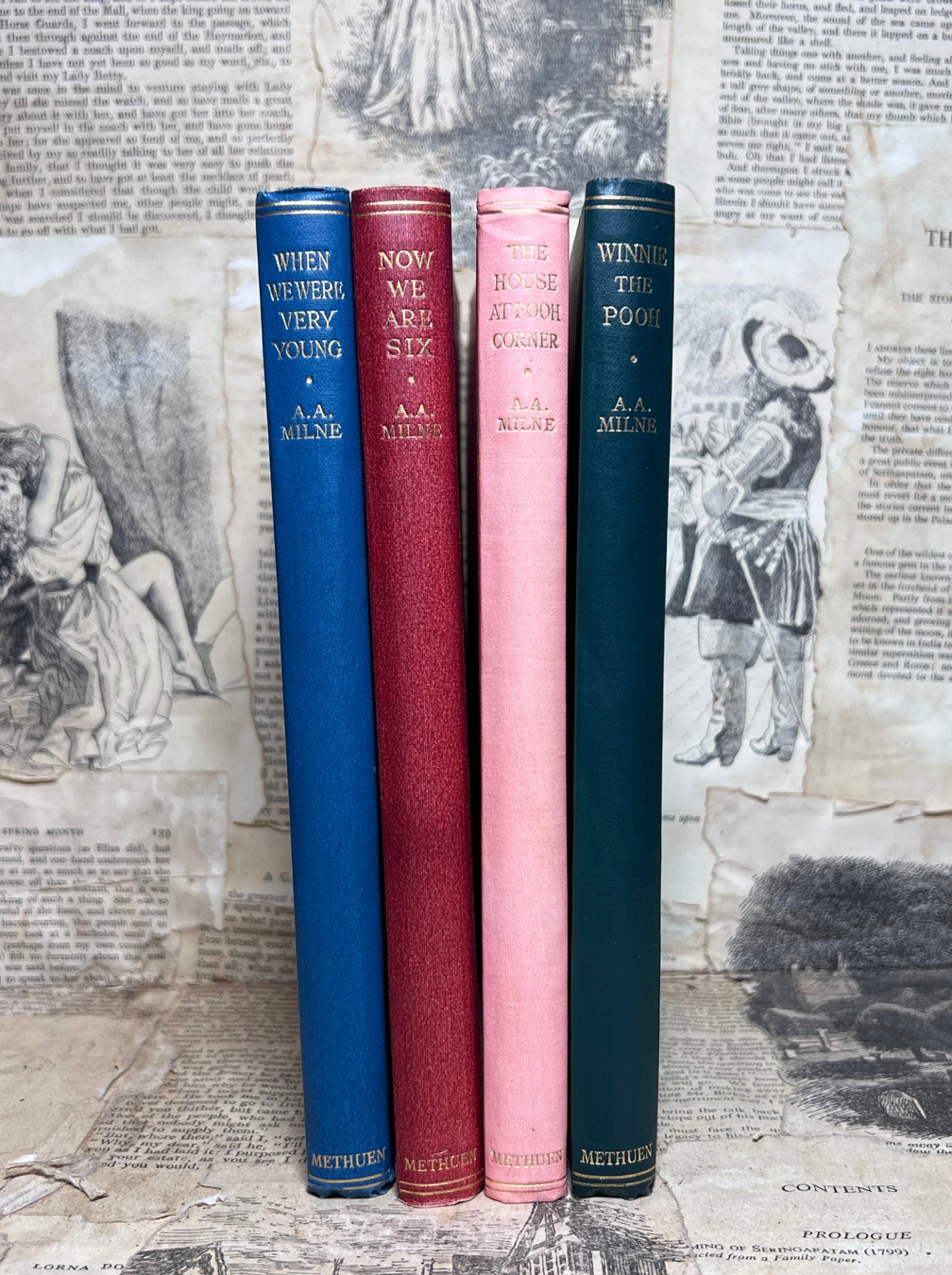 House at Pooh Corner: Text block near fine with very minor marks on the top corner of reverse side of title page to page 36. Spine lightly sunned. Minor creasing to headcap. Minor warping of boards. Very minor line to the top of the front board from being sunned. Very minor marks on boards, only visible upon vert close inspection. Minor dulling to top page edge gilt. Very minor crease to top corner of the rear board. Pastedown with some minor toning and foxing. Very small pencil inscription on the top corner of a preliminary page. Very minor marks on preliminaries.