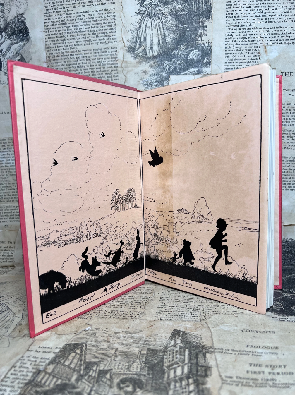 Winnie the Pooh: Text block near fine with very sporadic very minor foxing. Spine fine with very minor warping. Very minor wear to headcap and tail. Very minor superficial scratches on front board. Very minor marks on the top left corner of the rear board. Very minor screaming on the bottom corner of the rear board. Minor dulling to top page edge gilt. Line of toning on pastedown. Pen ownership inscription form 1926 on preliminary page; potentially original owner. Endpapers very lightly toned.