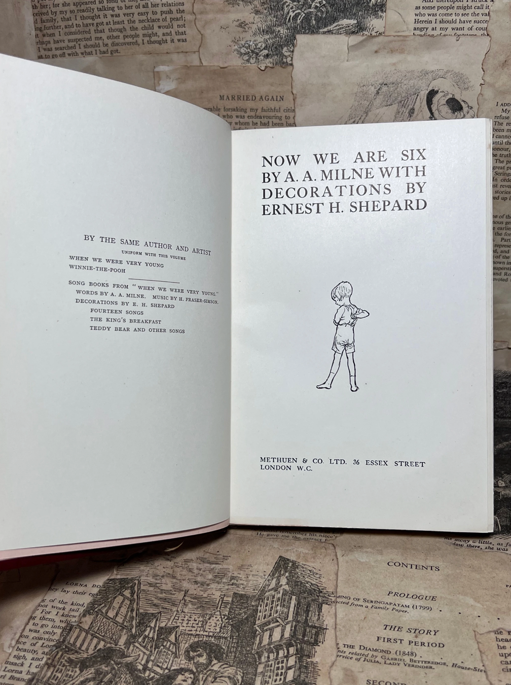 Now We Are Six: Spine sunned very lightly. Very minor warping of the spine. Very minor wear to headcap and tail. Minor shelf lean. Very minor superficial scratches on front board. Minor dulling to top page edge gilt. Very minor toning and foxing to pastedown. Minor toning line to half title. Some pages are unevenly cut (how it was bound by the publisher).