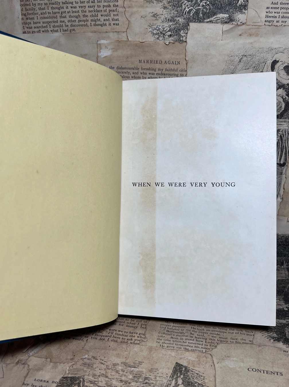 When We Were Very Young: Text block near fine with very sporadic very minor foxing. Spine fine. Very minor wear to headcap and tail. Very minor superficial scratches on both board. Minor dulling to top page edge gilt. Very minor foxing on pastedown. Some toning and foxing on half title and on the last page. Very minor and partial break between page 64 and 65, still securely attached, only significance of light exposure to binding. Small number of pages are very lightly toned.