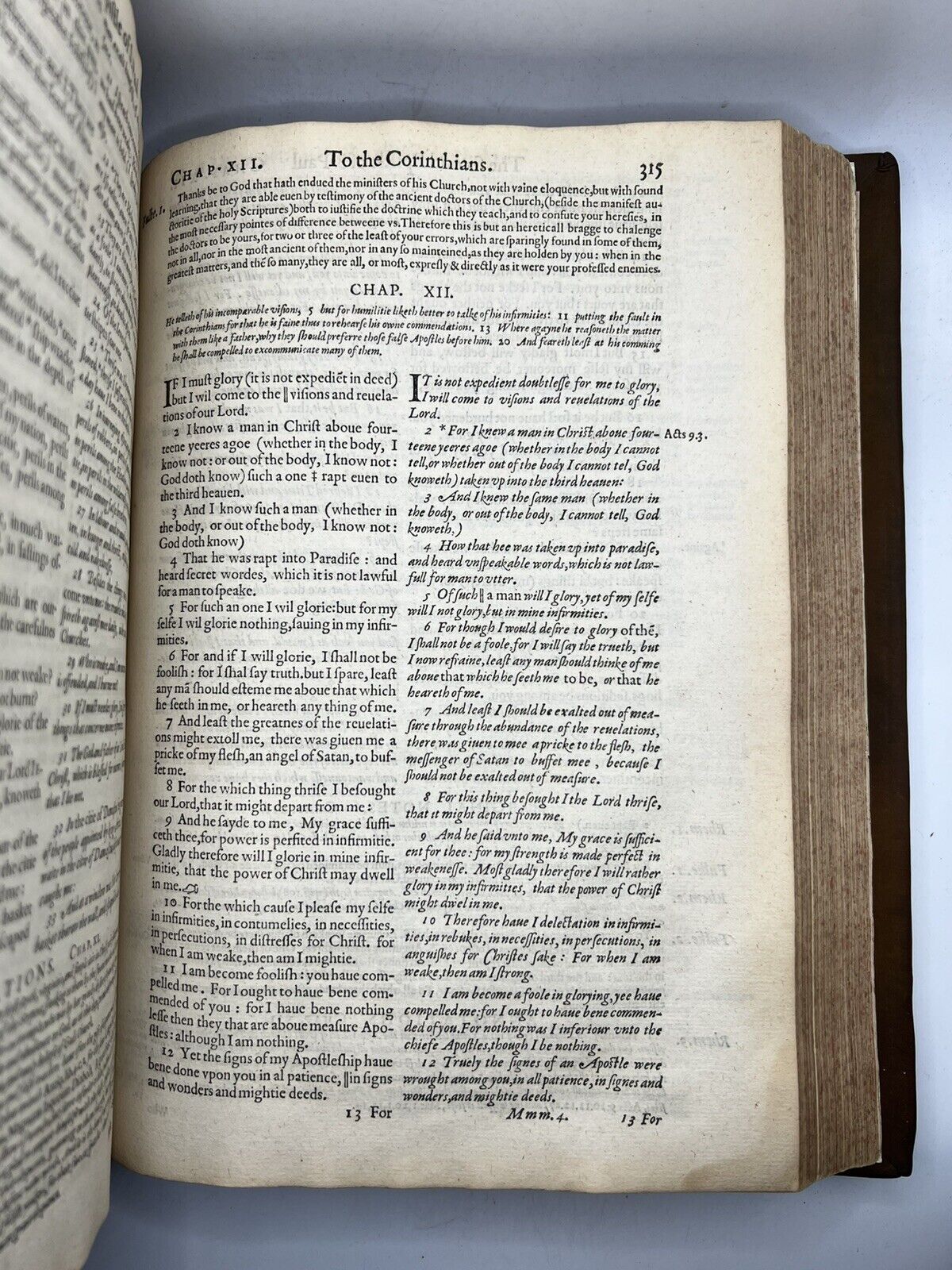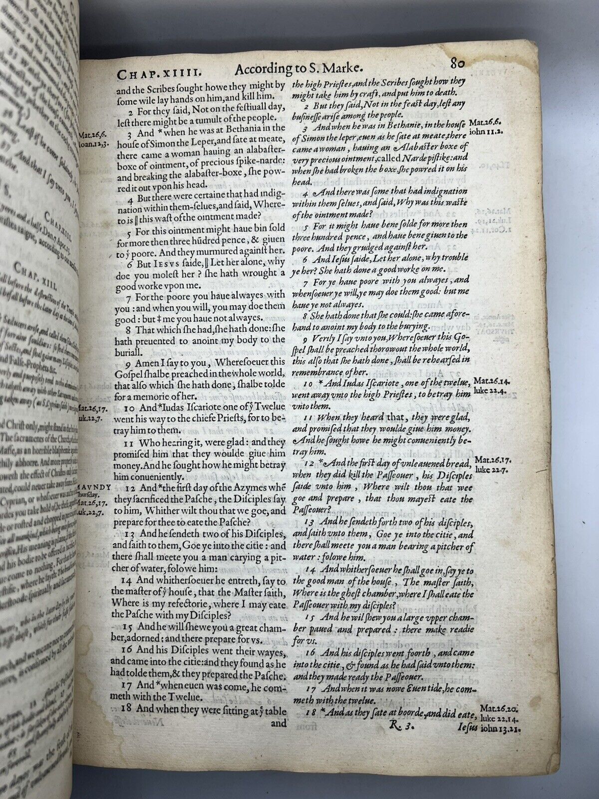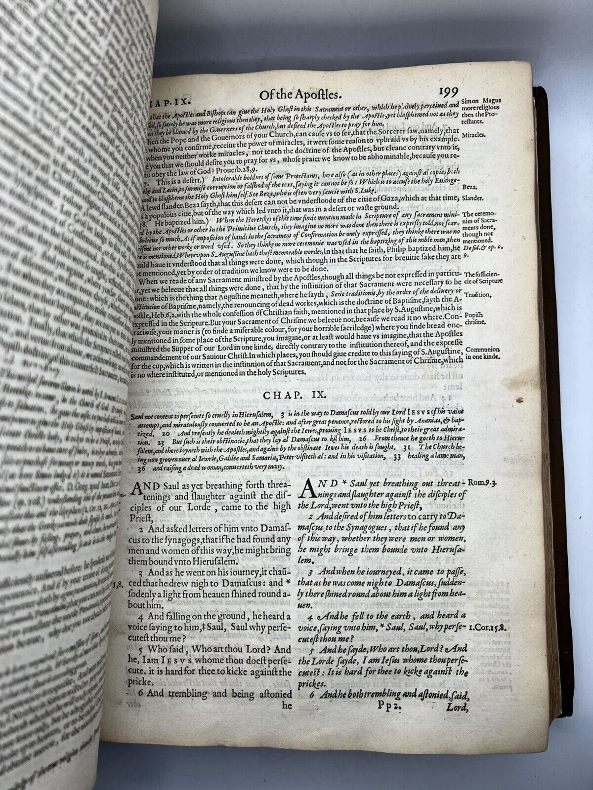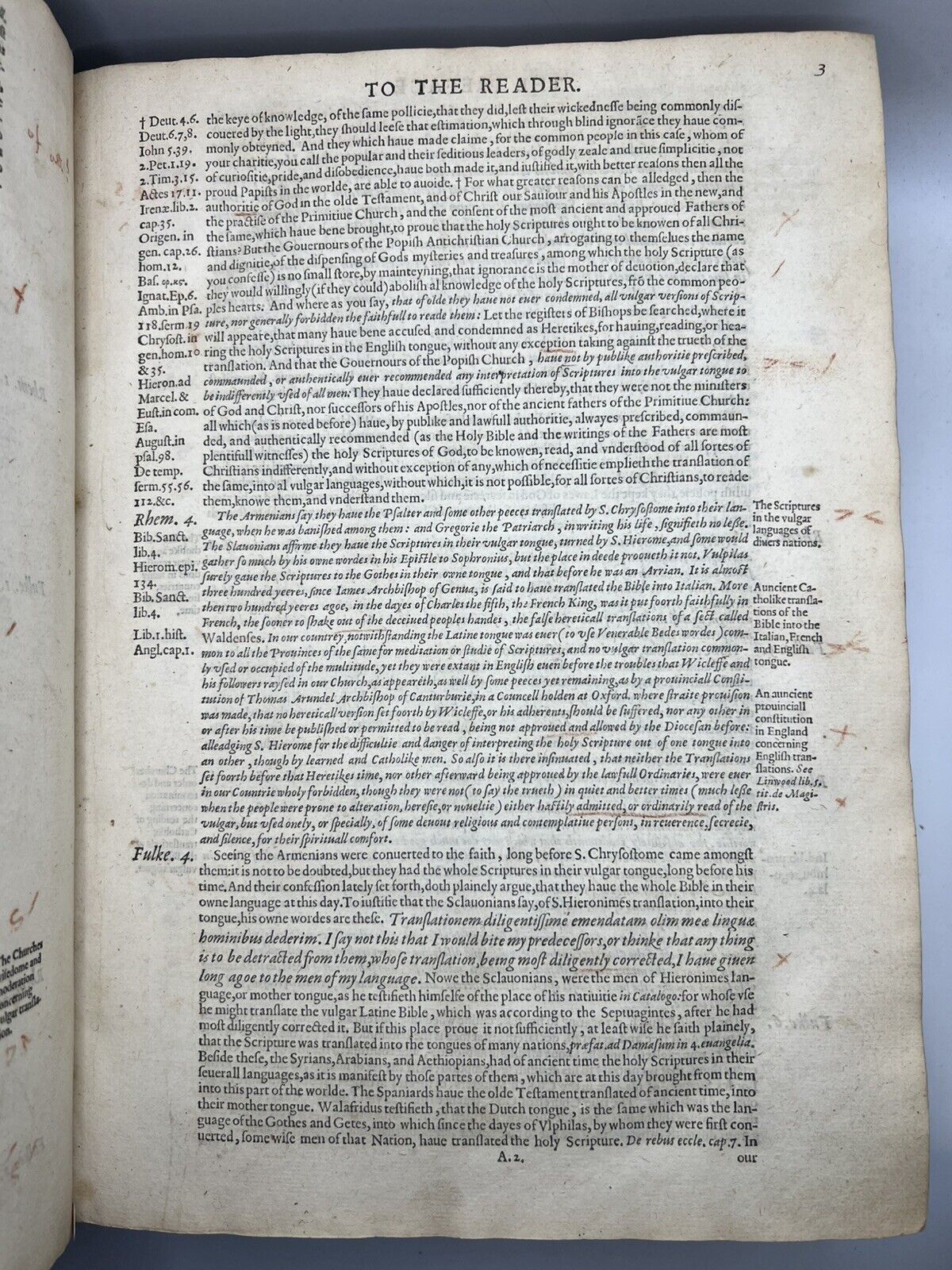 "The title given in full above, and the description below, sufficiently indicate the nature of this book. It was the first systematic and comprehensive attempt to refute the arguments and accusations contained in the Rheims New Testament of 1582... by printing the Rheims New Testament in full, side by side with the Bishops' version, secured for the former a publicity which it would not otherwise have obtained, and was indirectly responsible for the marked influence which Rheims exerted on the Bible of 1611. It was reprinted in 1601, 1617, 1633, and 1843" (Herbert 202)