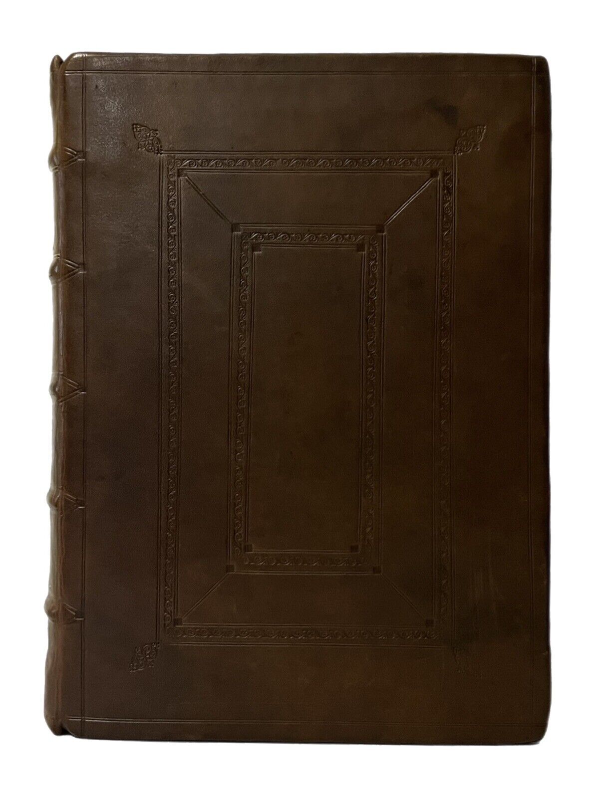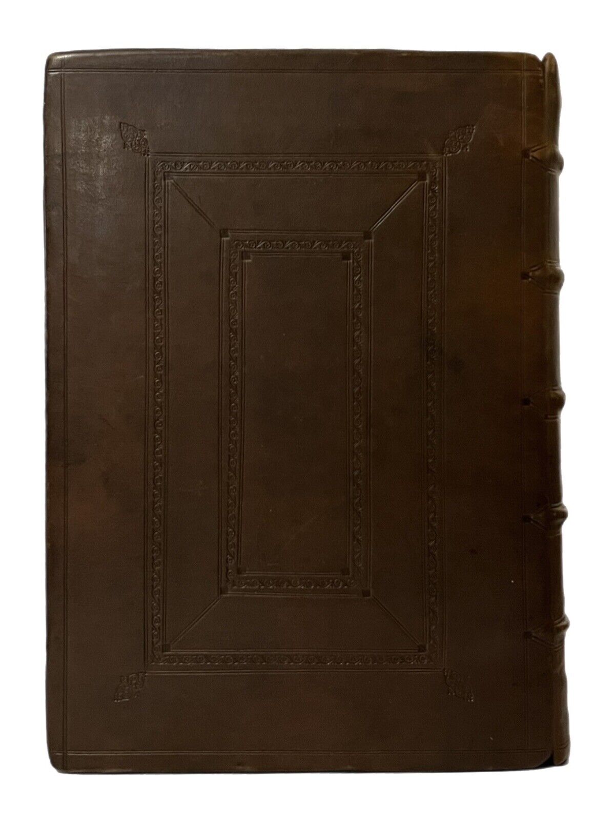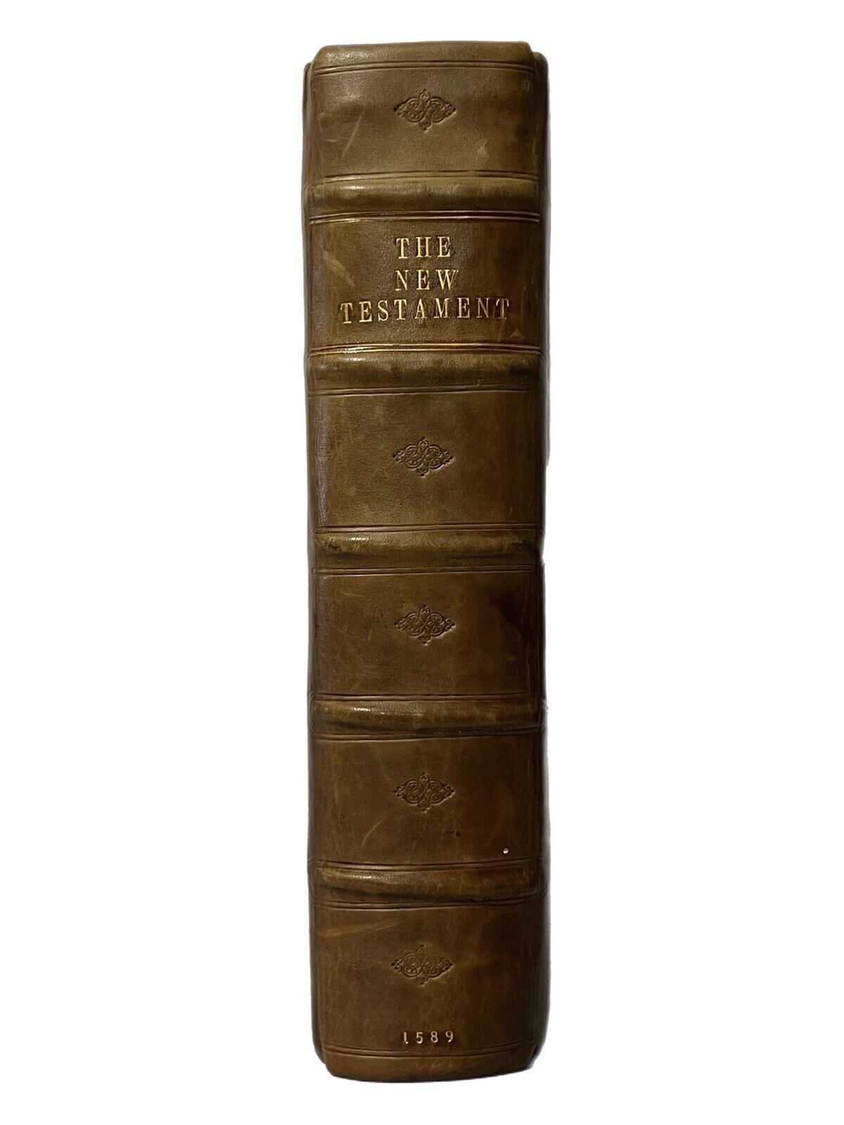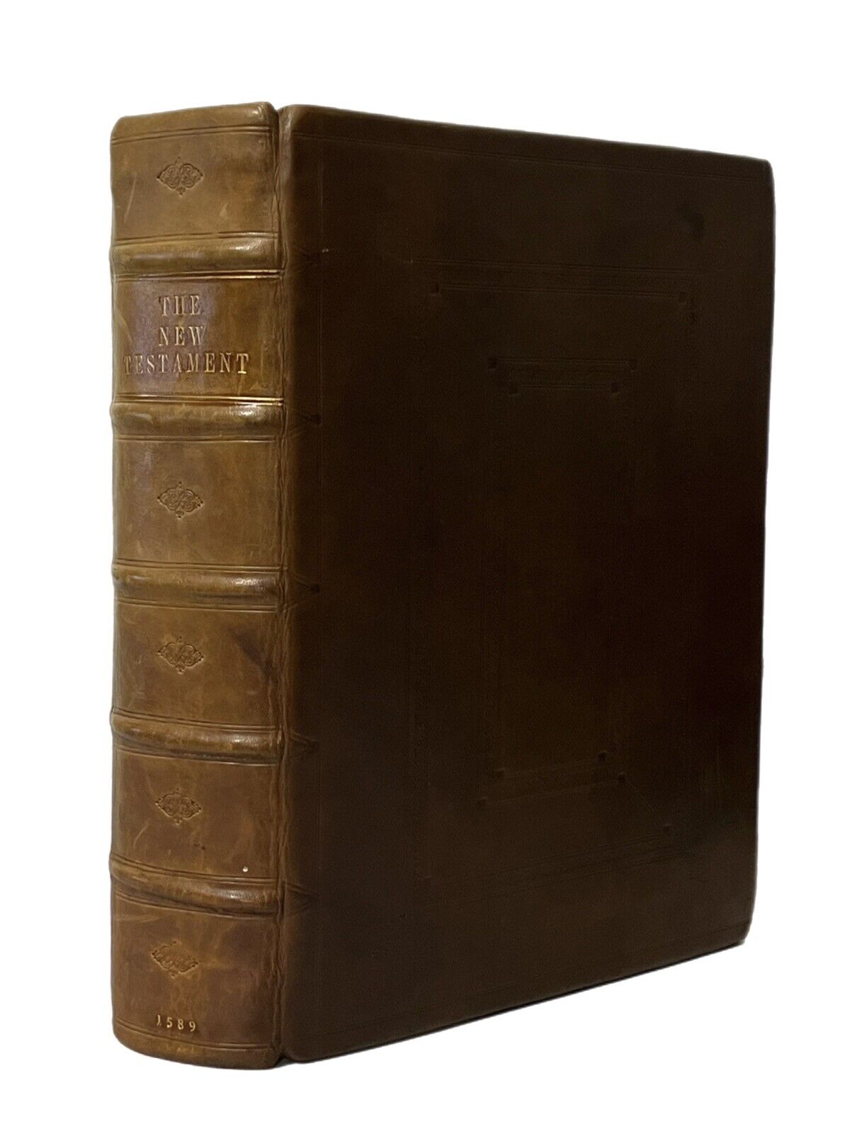 Very attractive recent full panelled full calf with "The New Testament" and "1589" written in gilt to the spine in compartments between raised bands. The binding is structurally fine with both boards securely attached, without shelf lean. Some minor scuffs as typical, else externally near fine. Very attractive on the shelf indeed. Main title in excellent condition, significantly better than typically encountered, very attractive. Some marginalia and underlining in the preface and first few quires, else generally very clean throughout the text, some spotting in places throughout as typical. A very small hole to G5 with the loss of a few letters of text, a few ink spots to L3, and with the bottom right corner of 4H4 with some minor loss in the blank space, not affecting the text. The signatures reset at Y instead of Z as called for. The final four leaves of the index tables are provided in excellent printed facsimile (4X1-4X4), else the text collates as complete, including the blanks which have particularly attractive watermarks visible under strong light which date them as contemporary to the printing. An excellent example of this rare first edition of Fulke's important New Testament, very rare with a text collates as complete as here.