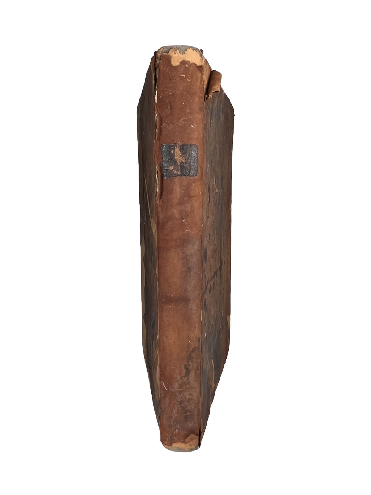 Spine with some marks, primarily to the bottom, and very minor scratches. Some fragments of backstrip are lacking / peeling on the spine. Tooled label present but with prominent wear and small fragments lacking. Both boards attached with joints and hinges starting. Front board with prominent marks and scuffing, as well as fragments of leather lacking and peeling. Rear board with large fragments of leather lacking and with prominent marks and scratches. Shelf and edge wear. Pastedown foxed. Very small holes to the top corner of ffep. Pen ownership inscription on rear pastedown.