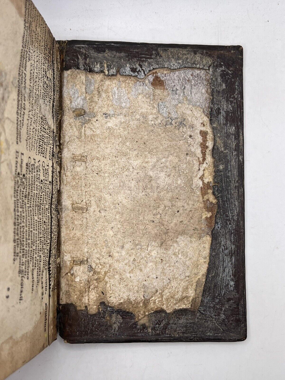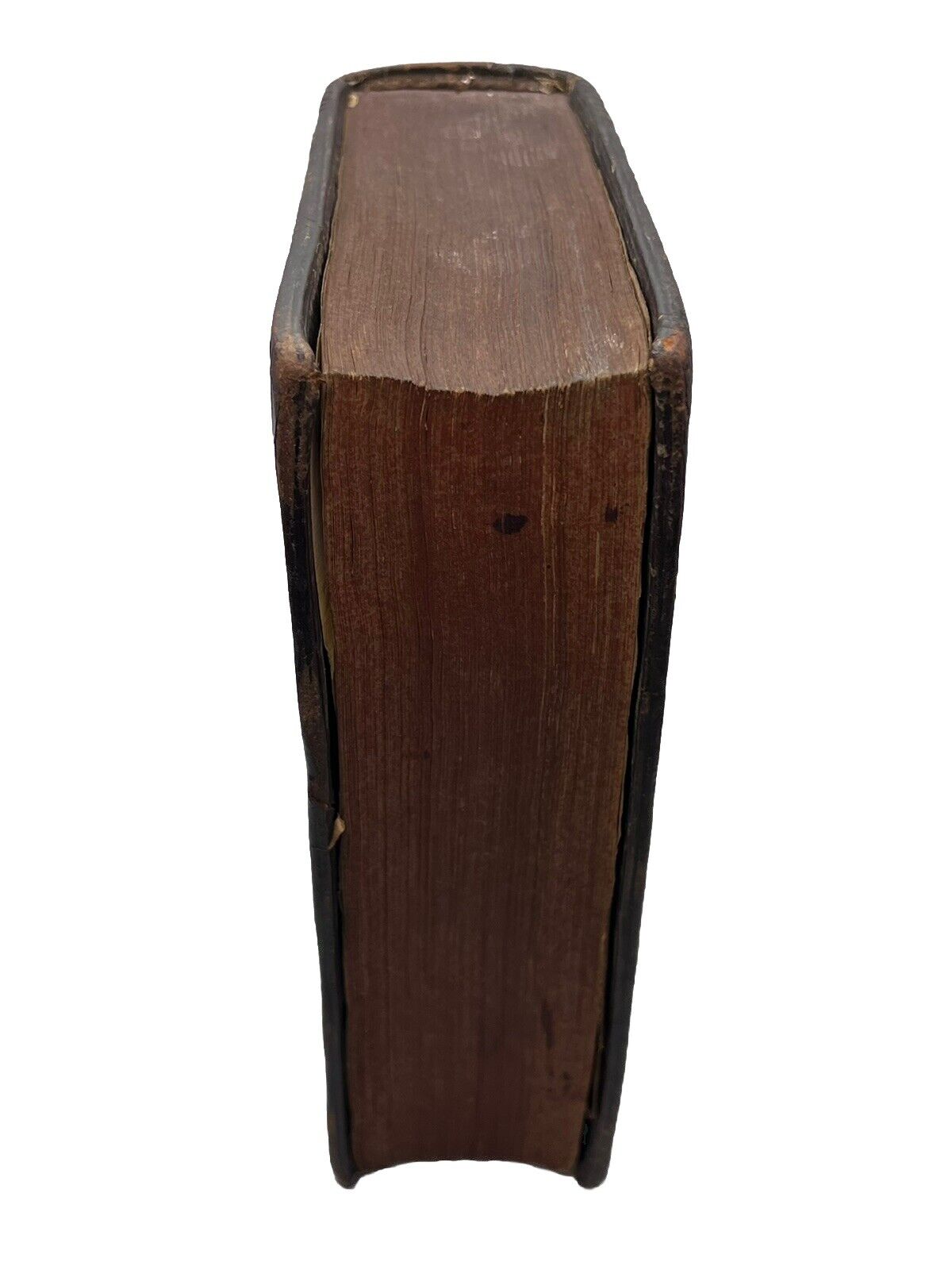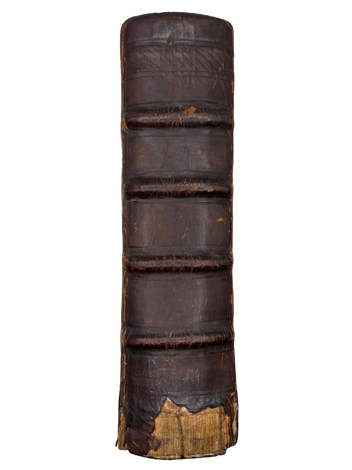 Full brown calf binding, lightly rubbed and scuffed with a small part of the backstrip lacking from the bottom. Both boards attached joints rubbed and starting, and the hinges cracked, thus fragile. Shelf and edge wear. Red page edges dulled, top edge darkened, some minor marks. Pastedowns lacking. Ink inscription to front and rear blank. Text block very clean with occasional foxing and marks.