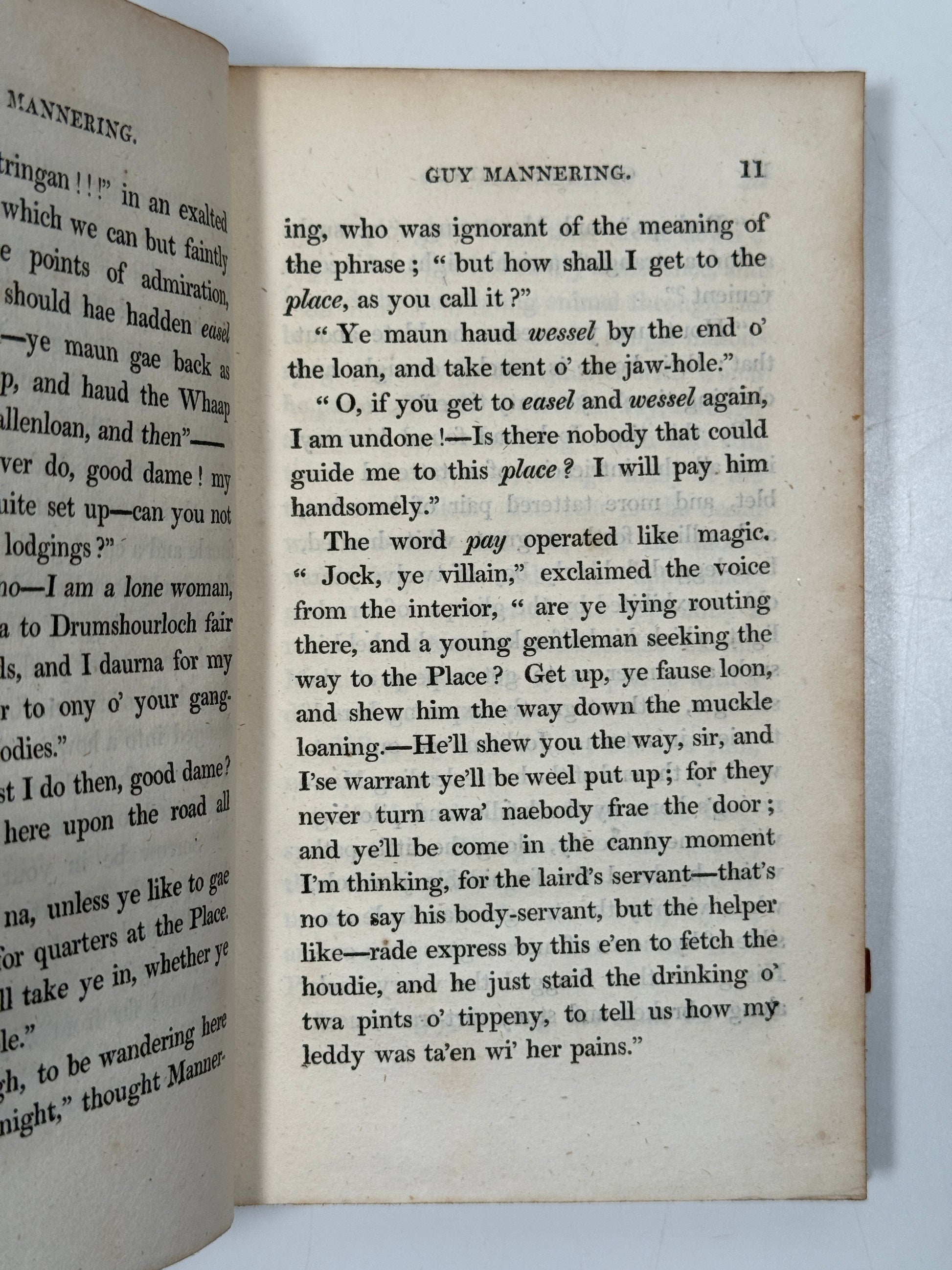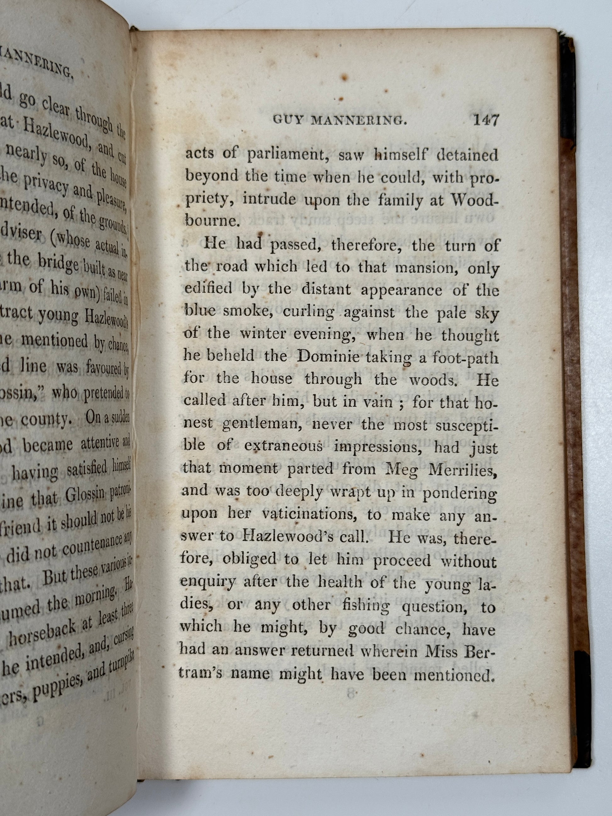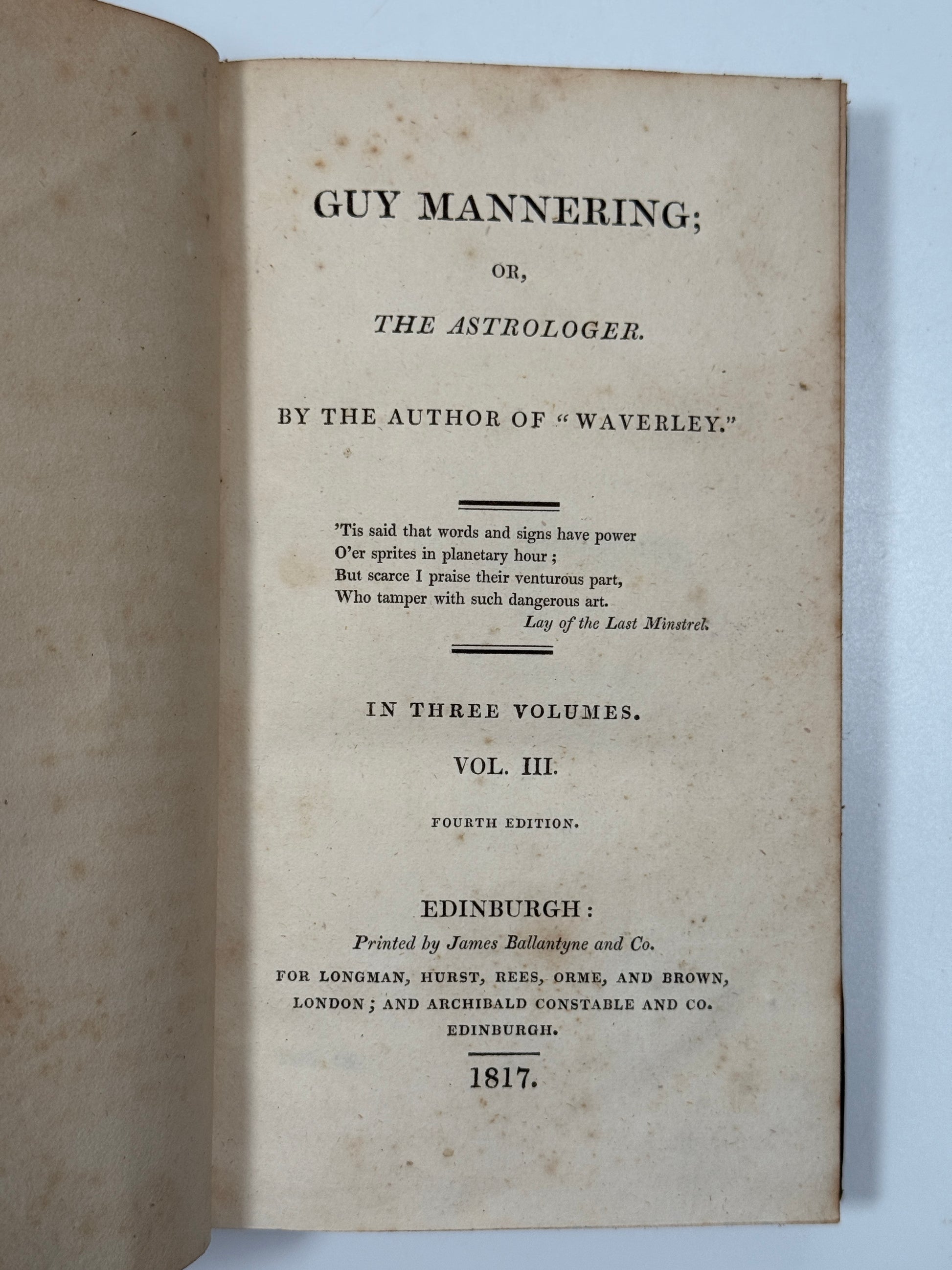 Guy Mannering; or, the Astrologer. By the Author of "Waverley." [Walter Scott]. In Three Volumes. Fourth Edition. Edinburgh: Printed by James Ballantyne and Co., for Longman, Hurst, Rees, Orme, and Brown, London; and Archibald Constable and Co., Edinburgh. 1817.