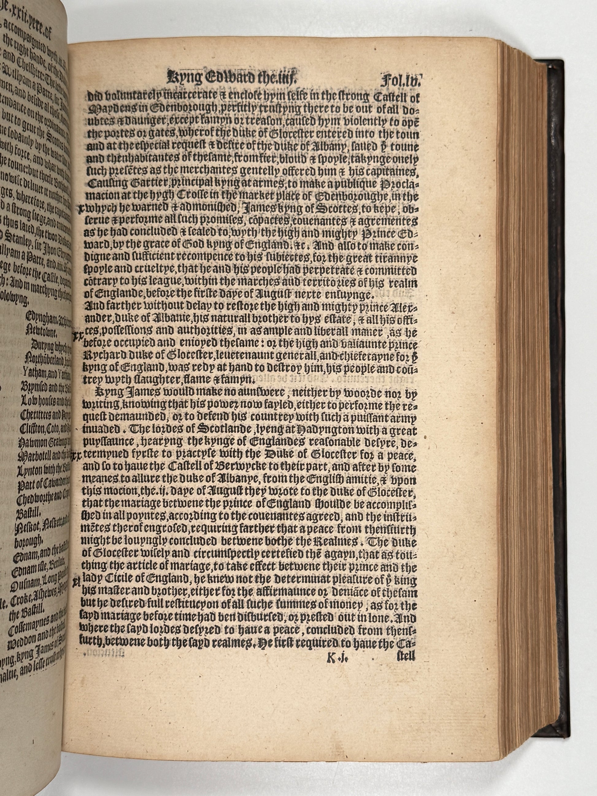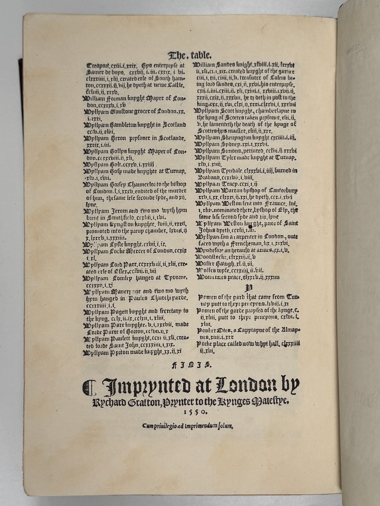 THE VERY RARE MOST DESIRABLE SETTING OF EXTANT COPIES, described by ESTC as "ideal", WITH ALL REQUISITE POINTS: the second leaf is signed "A.ii." and line 2 up has "reson", the third leaf verso mentions a separate table for each king, the fourth leaf recto includes "Englyshe Wryters.", each king has a separate register and foliation and has Roman numeral line numbers in the inner margins, A1 recto last line reads "king henry", B2 recto line 35 has "[and] committed" where "and" uses the Tironian sign rather than printing "and" - this particular typesetting is the rarest variant which ESTC suggests is either a trial setting or a replacement setting for damaged leaves. The indexes to Henry VI and VII are in 64mm textura where the others (printed by Steven Mierdman) are in 78mm.