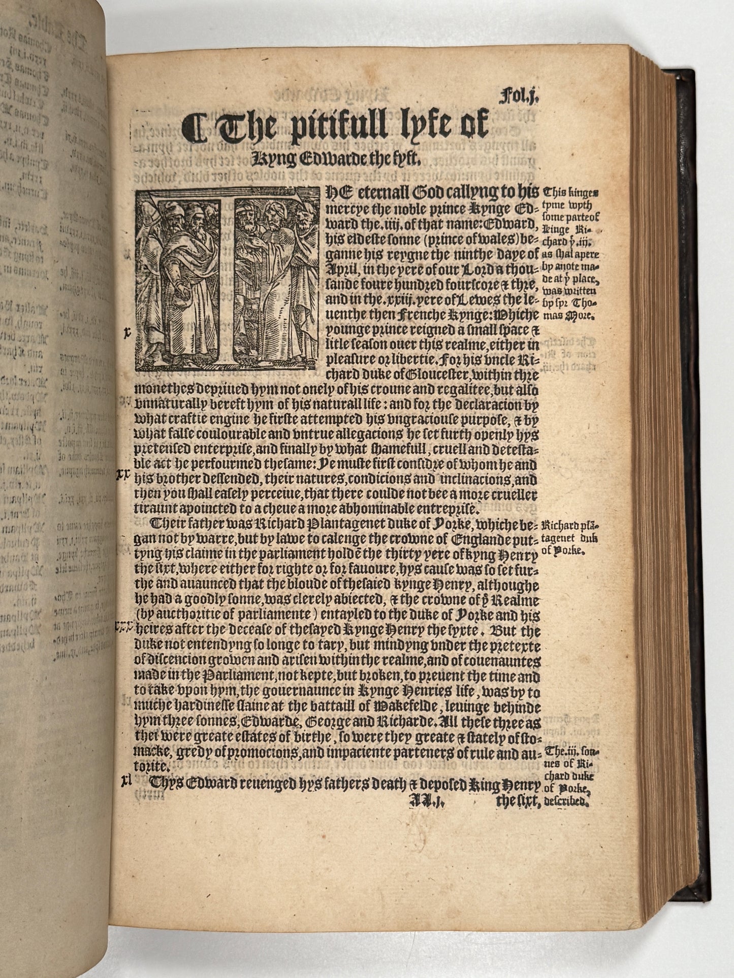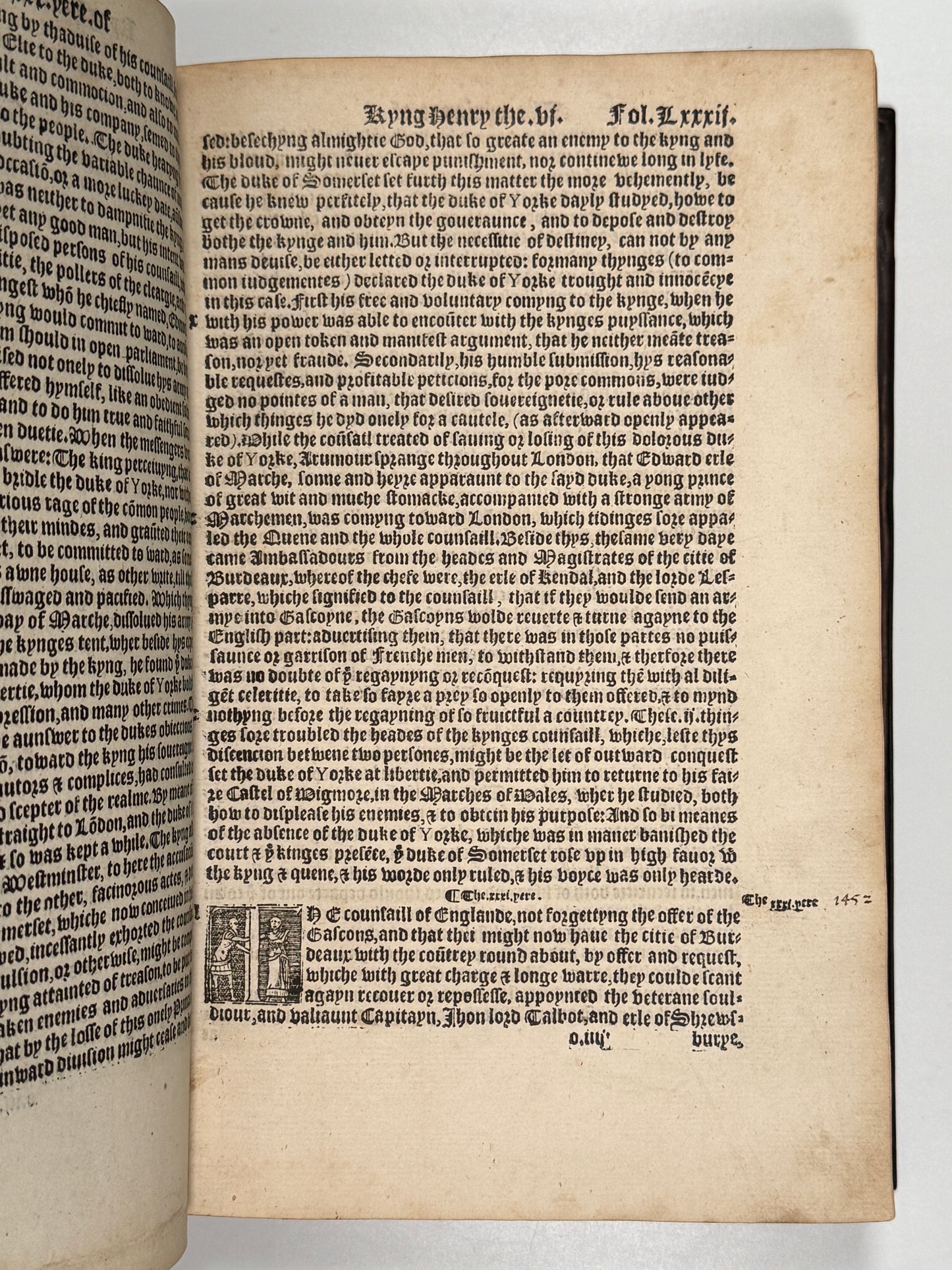 Hall's Chronicle is one of the most significant books covering English history printed during the infancy of the English printing press. Edward Hall, the author, was a strong supporter of the Protestant King Henry VIII and so when the Catholic Queen Mary I came into power, this book was banned by an act of Parliament in 1555 which resulted in the destruction of the majority of the print run. Correspondingly, ESTC remarks that "this is an exceptionally difficult work to grasp." This edition is of particular importance to Shakespearean scholars as it is one of the major sources used by William Shakespeare in the production of his historical plays, notably Richard III and the Battle of Castillon in Henry VI.