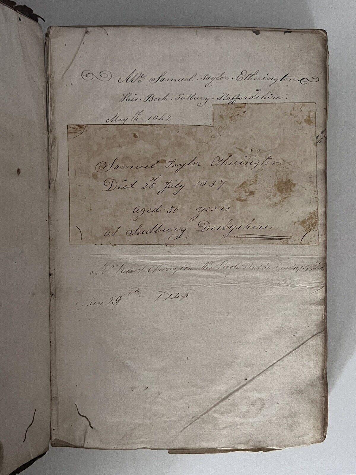Death record of Samuel Taylor Etherington dated 25th July 1837 pasted to front endpaper verso, aged 50 years in Sudbury, Derbyshire.