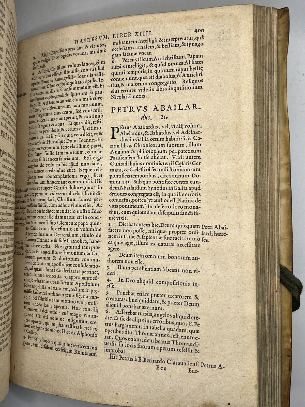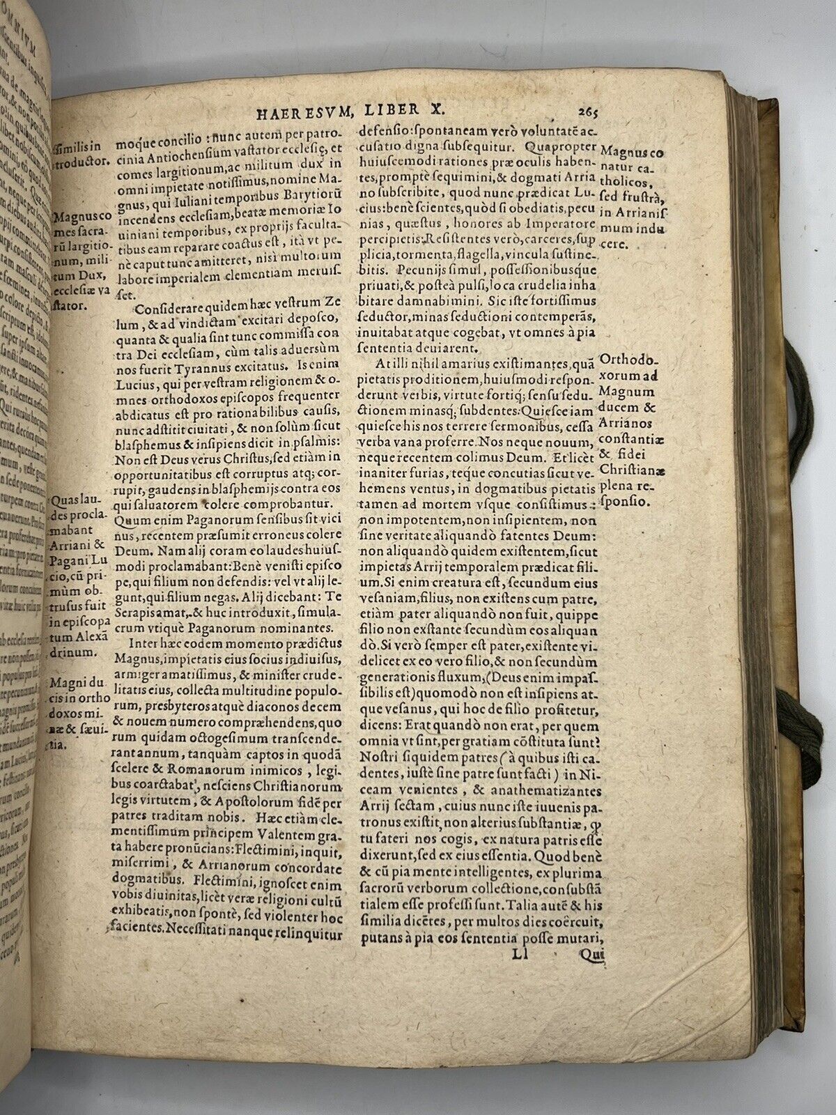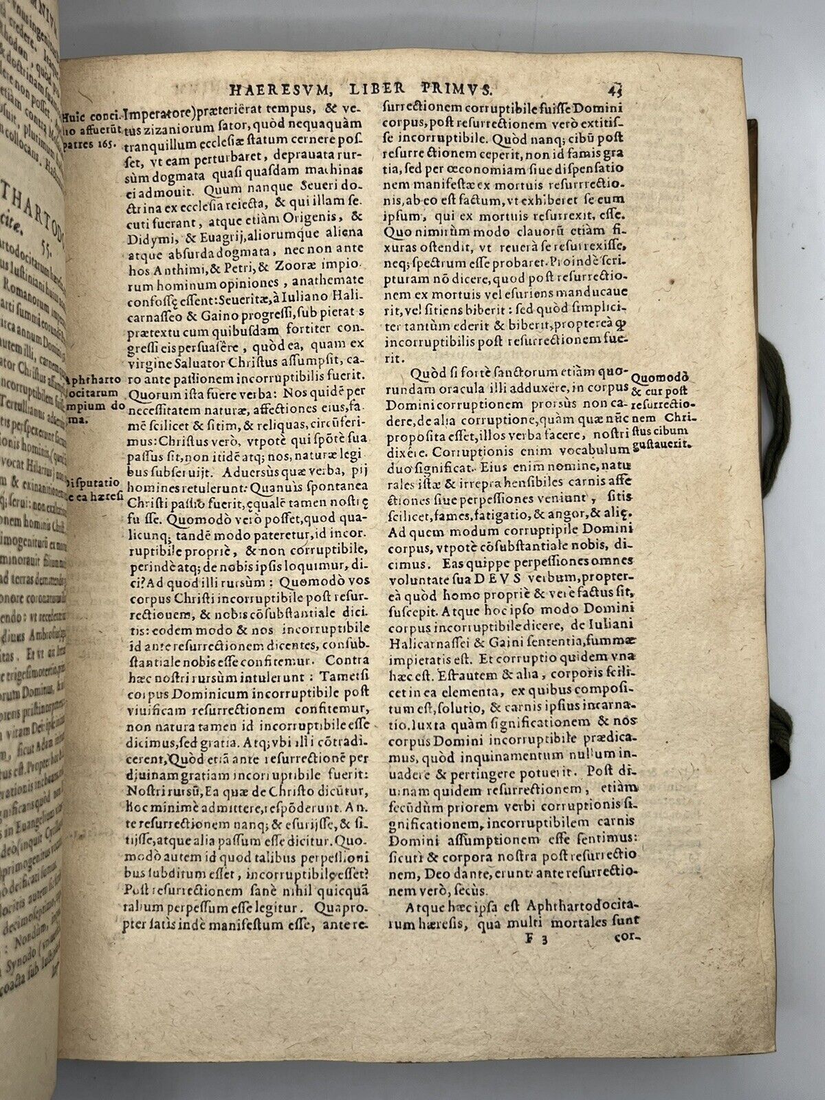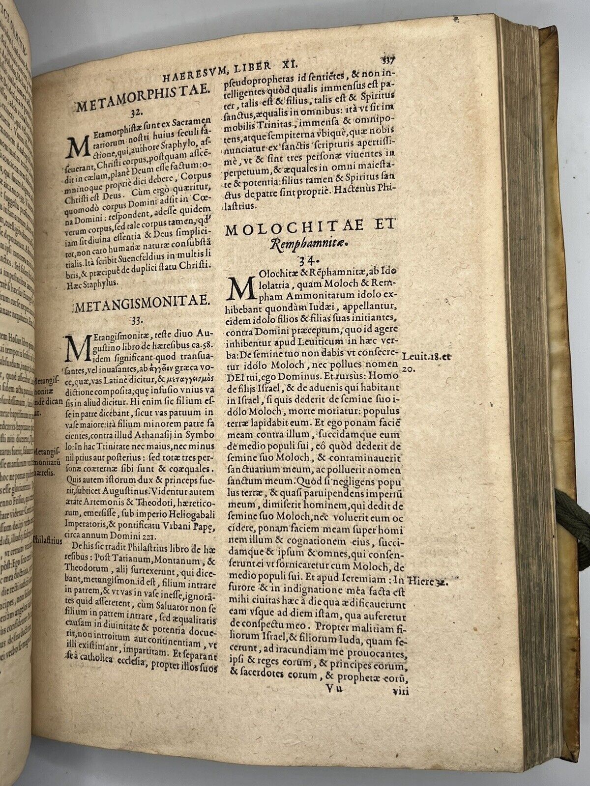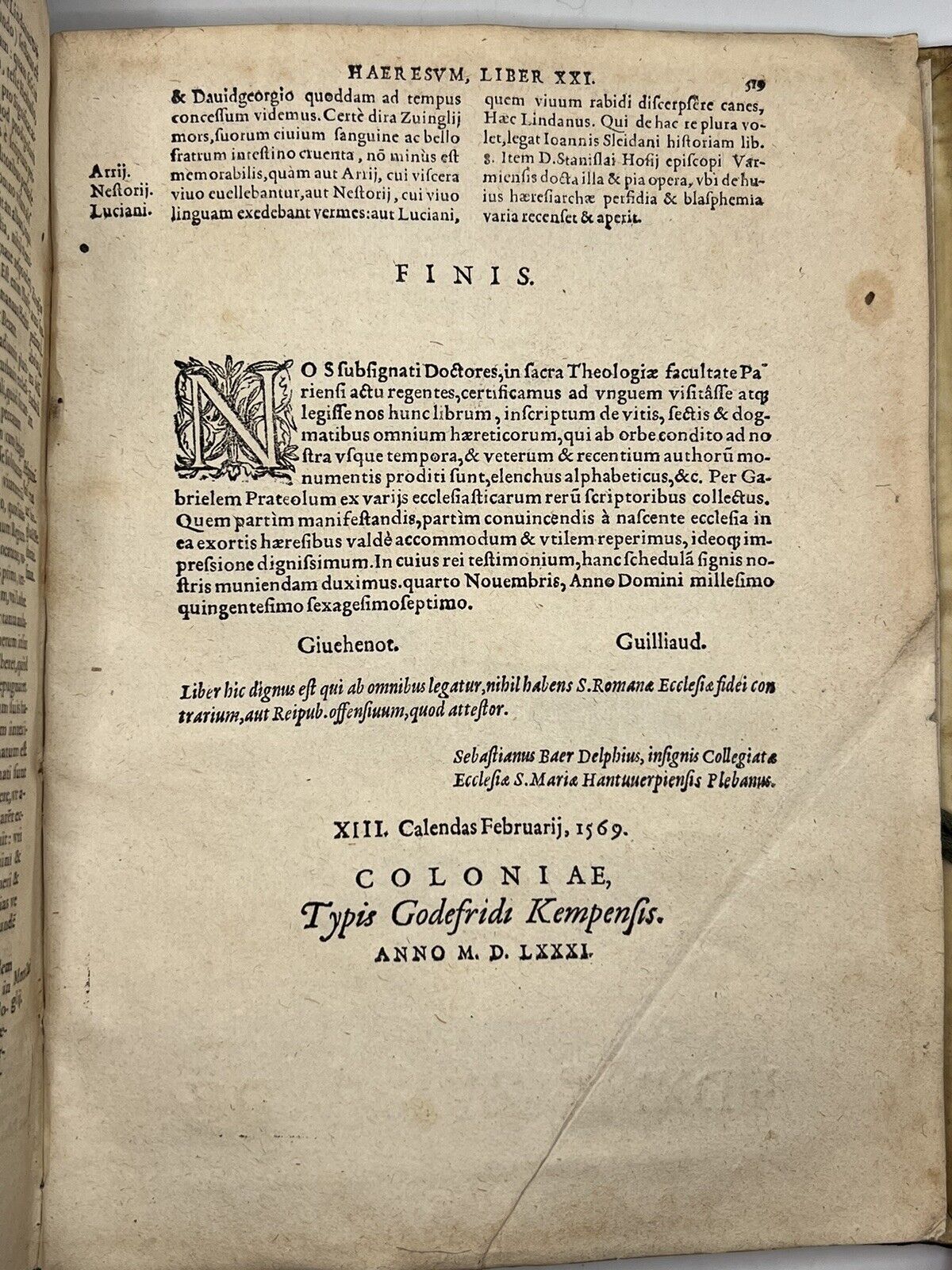A beautiful copy of the very rare 1581 second edition of Gabriel du Preau's dictionary of heresies and heretics, printed during the height of the counter-reformation era. The author taught theology at the Sorbonne, and in this work, he actively addresses not just the earlier heresies in opposition of ecumenical councils etc, but Calvinists, Muslims, Satanists, Zwinglians, Jews, Lutherans, Mennonites, and many other groups. He sought to condemn the heresies of Protestantism by comparison to ancient philosophical systems, though his methods are today regarded as erroneous.