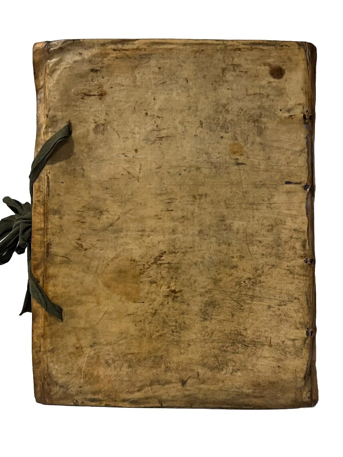Contemporary full vellum with title supplied in manuscript to the head of the spine. Vellum discoloured and a little worn as often, but generally very attractive. Ties replaced circa the 20th century and are functional. No attached bookplates, pencil inscriptions to both pastedowns and ffep verso, presumably from a previous bookseller, circa 2000 (?). Contemporary inscription to title page (a¹), and one contemporary manicule in text, else exceptionally clean throughout, bright and crisp. A very well preserved copy of this very rare edition. Consistent margin throughout, untrimmed; this binding is original to the book.