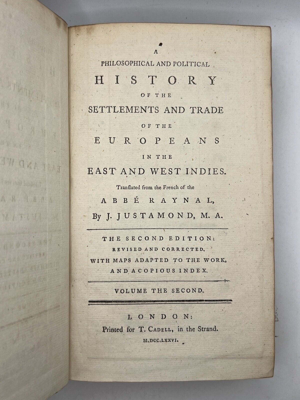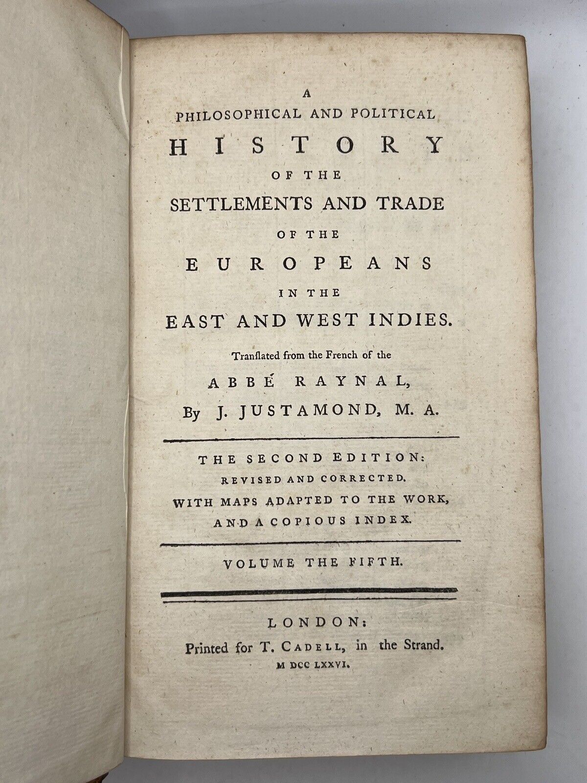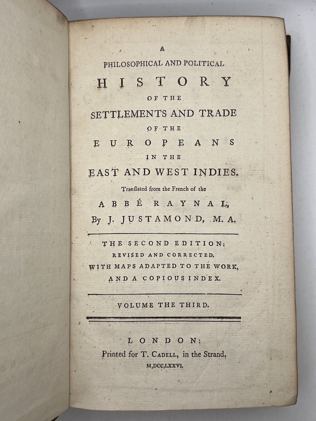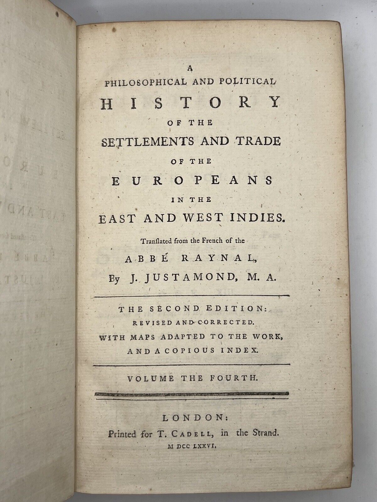 Philosophical and Political History of the Settlements and Trade of the Europeans in the East and West Indies [Vol. IV: ... on the Continent of North America]. Translated from the French of the Abbe Raynal, by J. Justamond, Dublin: John Exshaw and William Halhead, 1776. 4 volumes, 8vo.