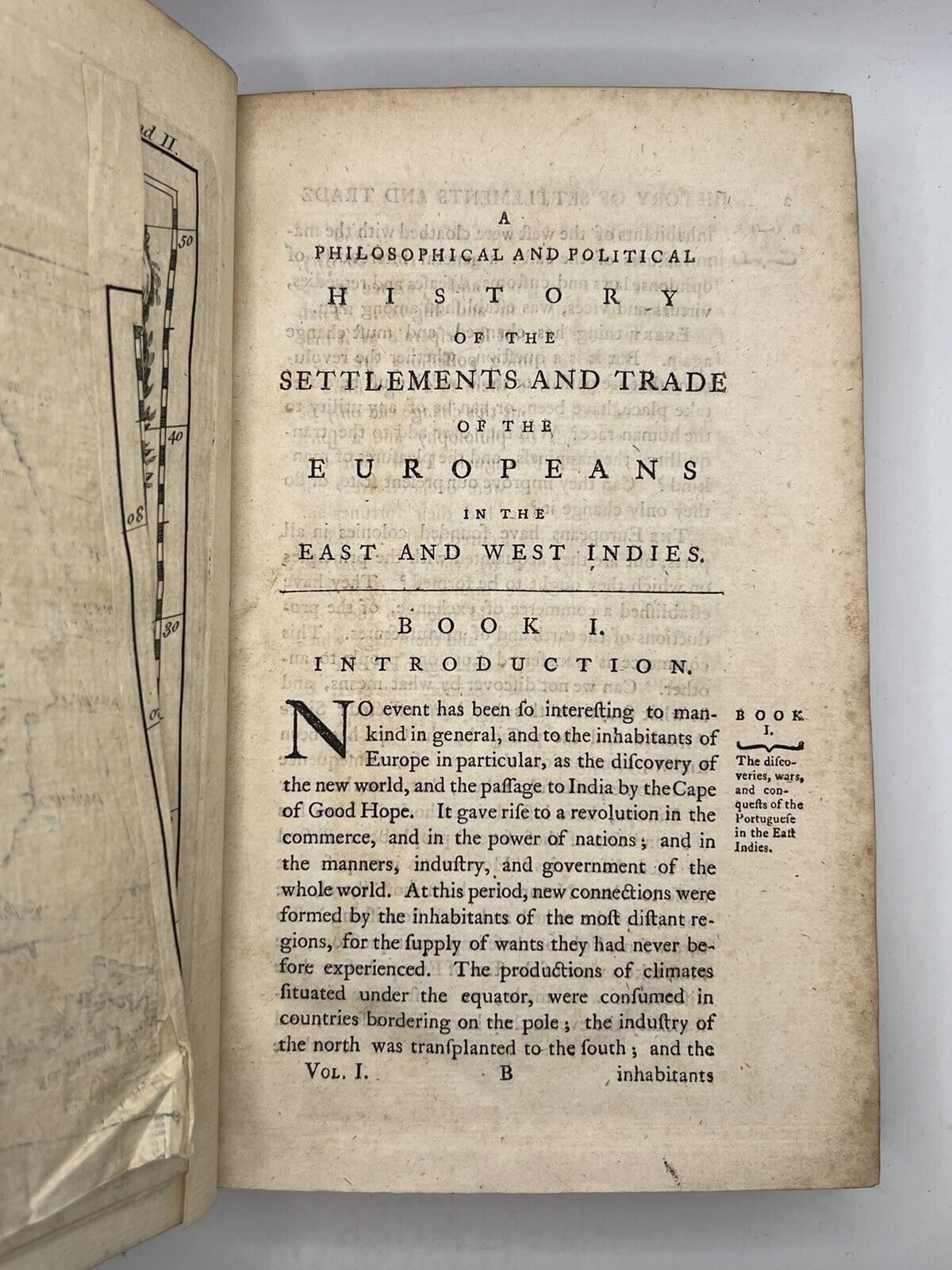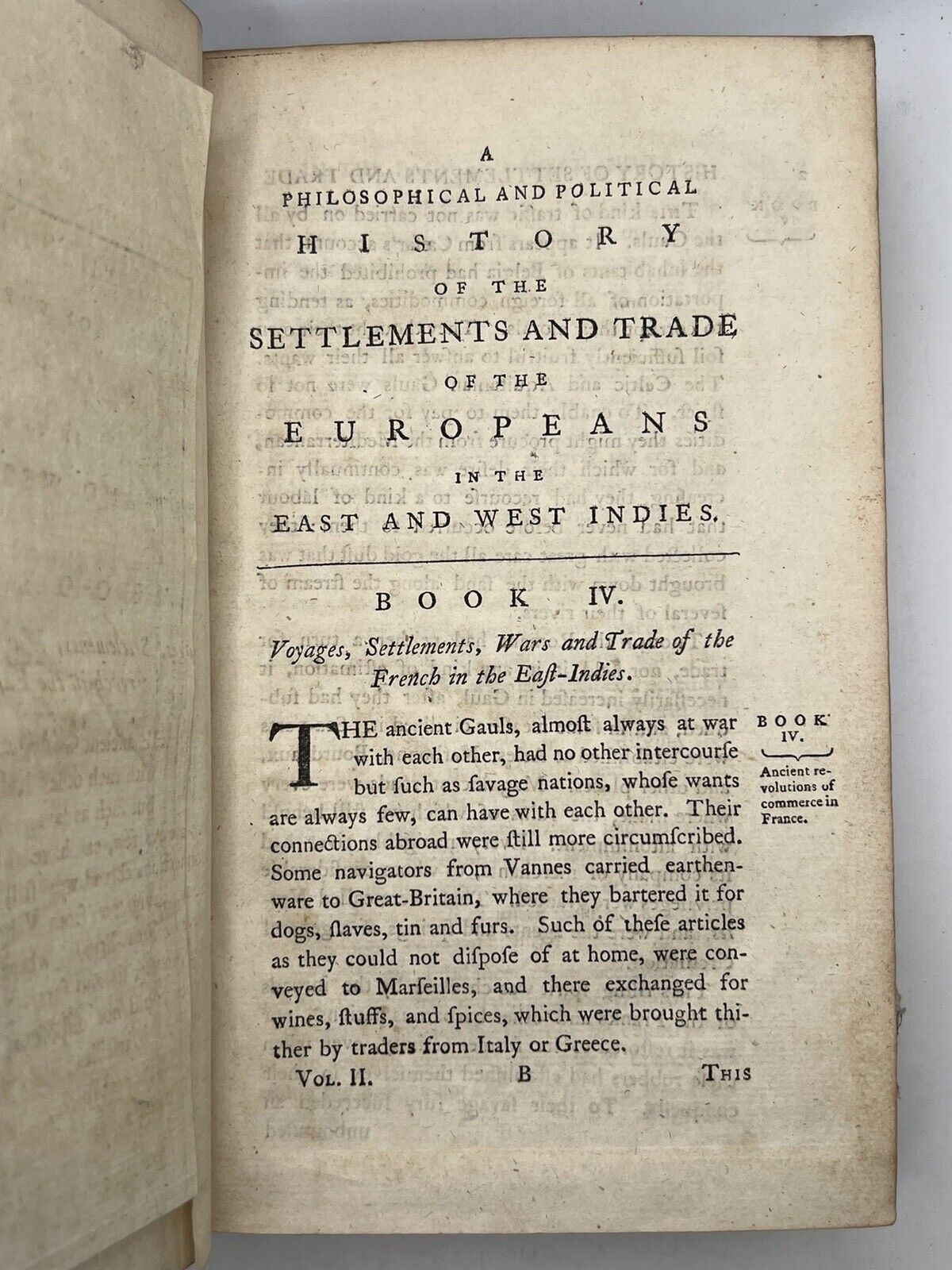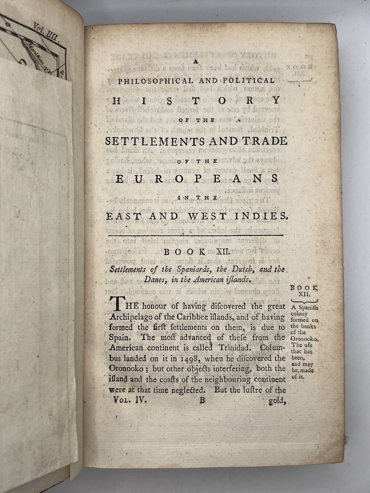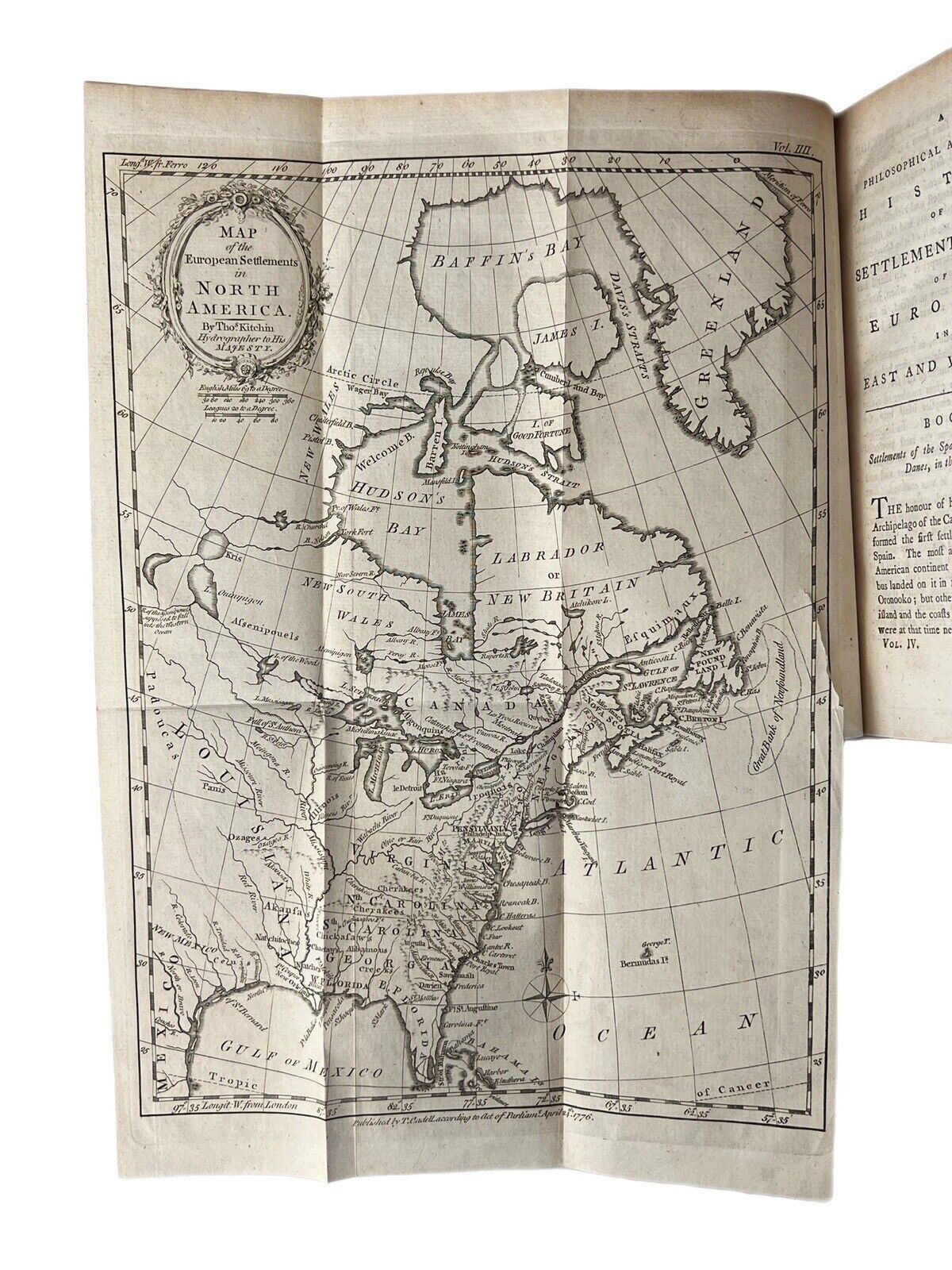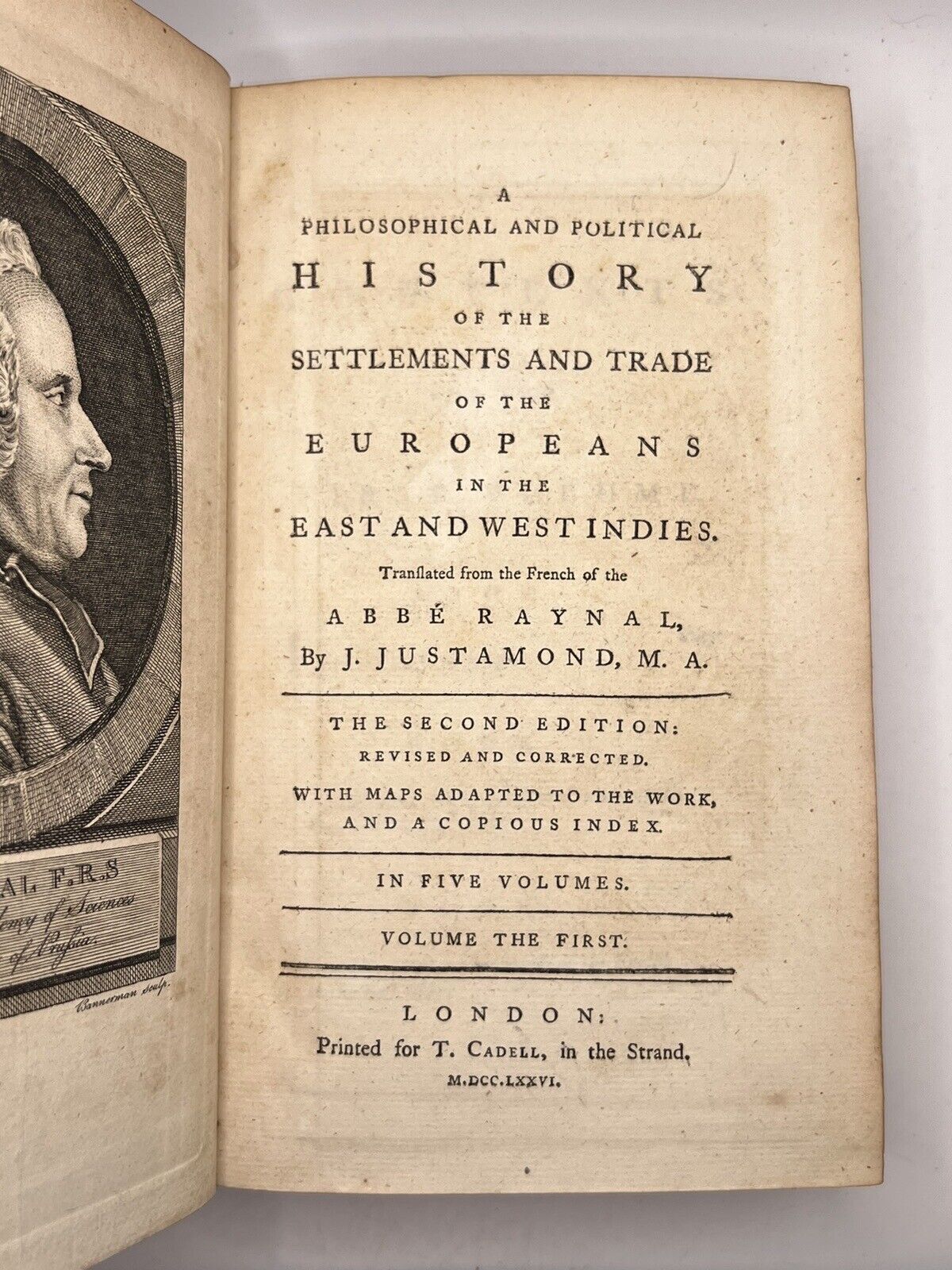 Philosophical and Political History of the Settlements and Trade of the Europeans in the East and West Indies [Vol. IV: ... on the Continent of North America]. Translated from the French of the Abbe Raynal, by J. Justamond, Dublin: John Exshaw and William Halhead, 1776. 4 volumes, 8vo.