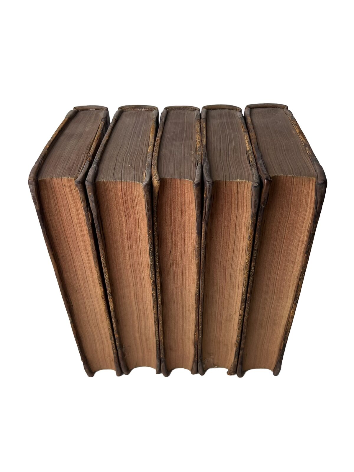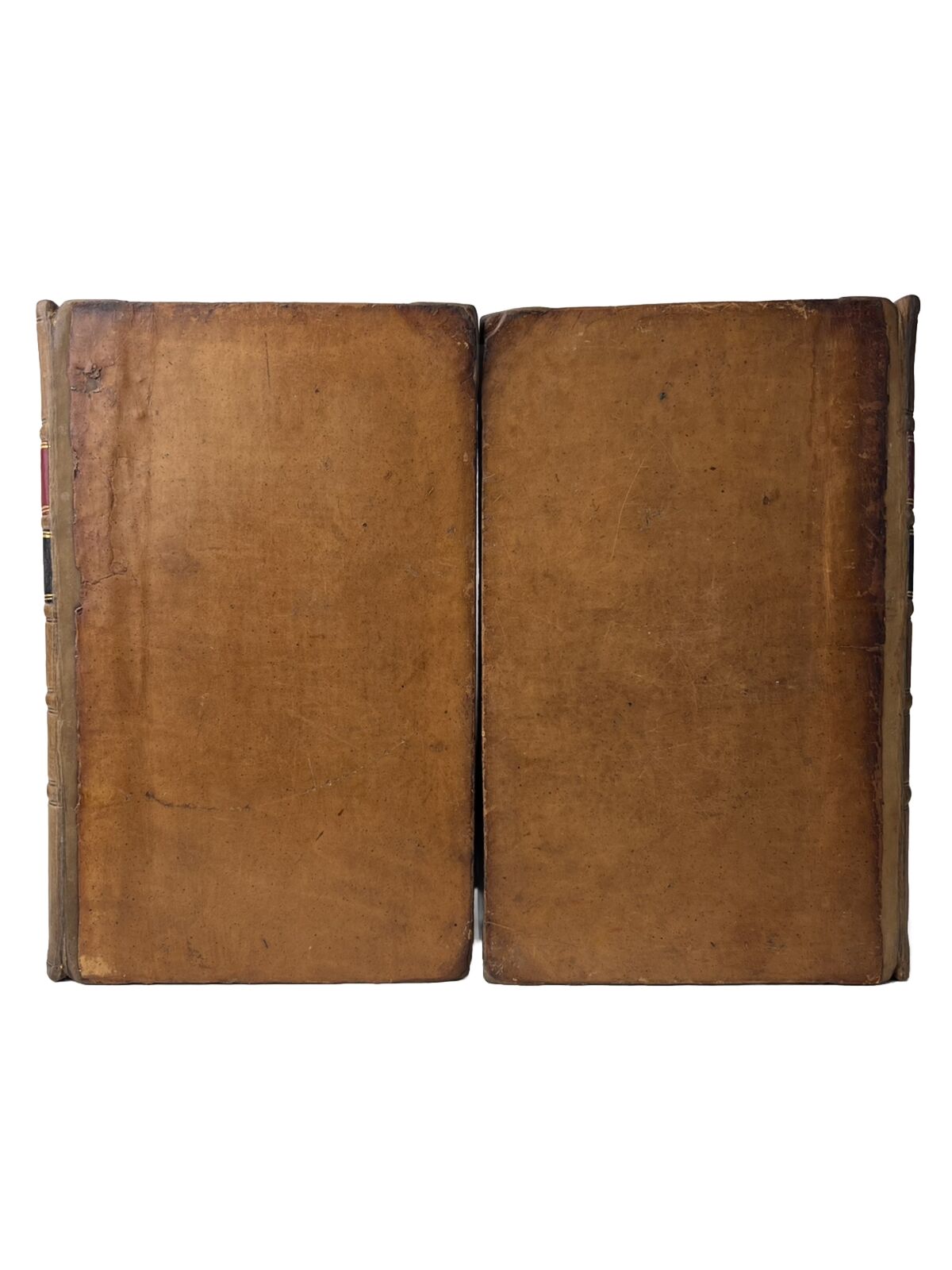 All volumes uniformly rebacked with new tooled morocco labels with the gilt date 1776 to the foot of each spine, also with some repair to the corners in a similar very neat manner and thus very attractive on the shelf. A bit of discolouration to the fifth volume and less so to the others, but this is not particularly aesthetically intrusive. All boards securely attached with hinges fine. No shelf lean as the set is placed on the shelf, but with a slight lean to the fourth volume when placed separately. Boards with some wear but generally very good. Rear board of the fourth volume with a small dented area with some loss to the leather which does not affect the text block. 3 foldout maps (of 4), lacking the map called for in volume three. First and second volume's rather large foldout maps torn slightly at the join to the book but with the majority of the maps in excellent condition, third smaller map in the fourth volume in near fine condition. No foxing. Internally very clean throughout with edge toning to the endpapers as commensurate with the calf bindings.