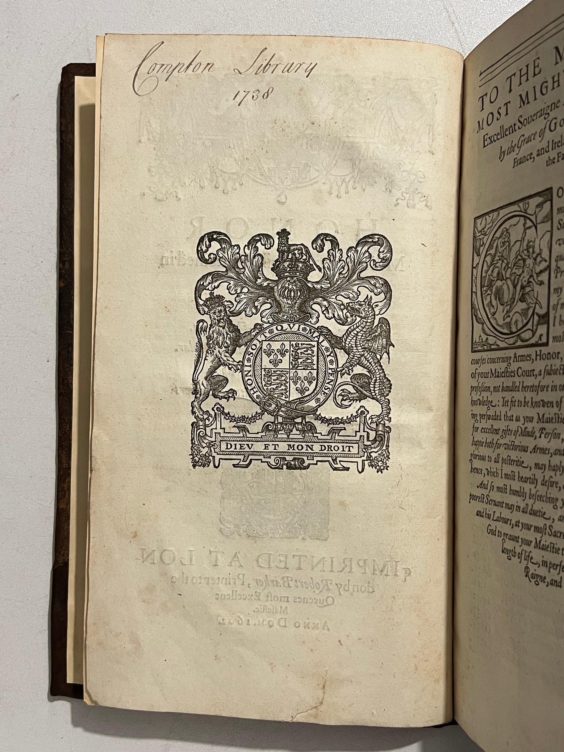 Inscription from Compton Library dated 1738 to the verso of the title page, most likely relating to the 6th Earl of Northampton, George Compton (1692-1758).