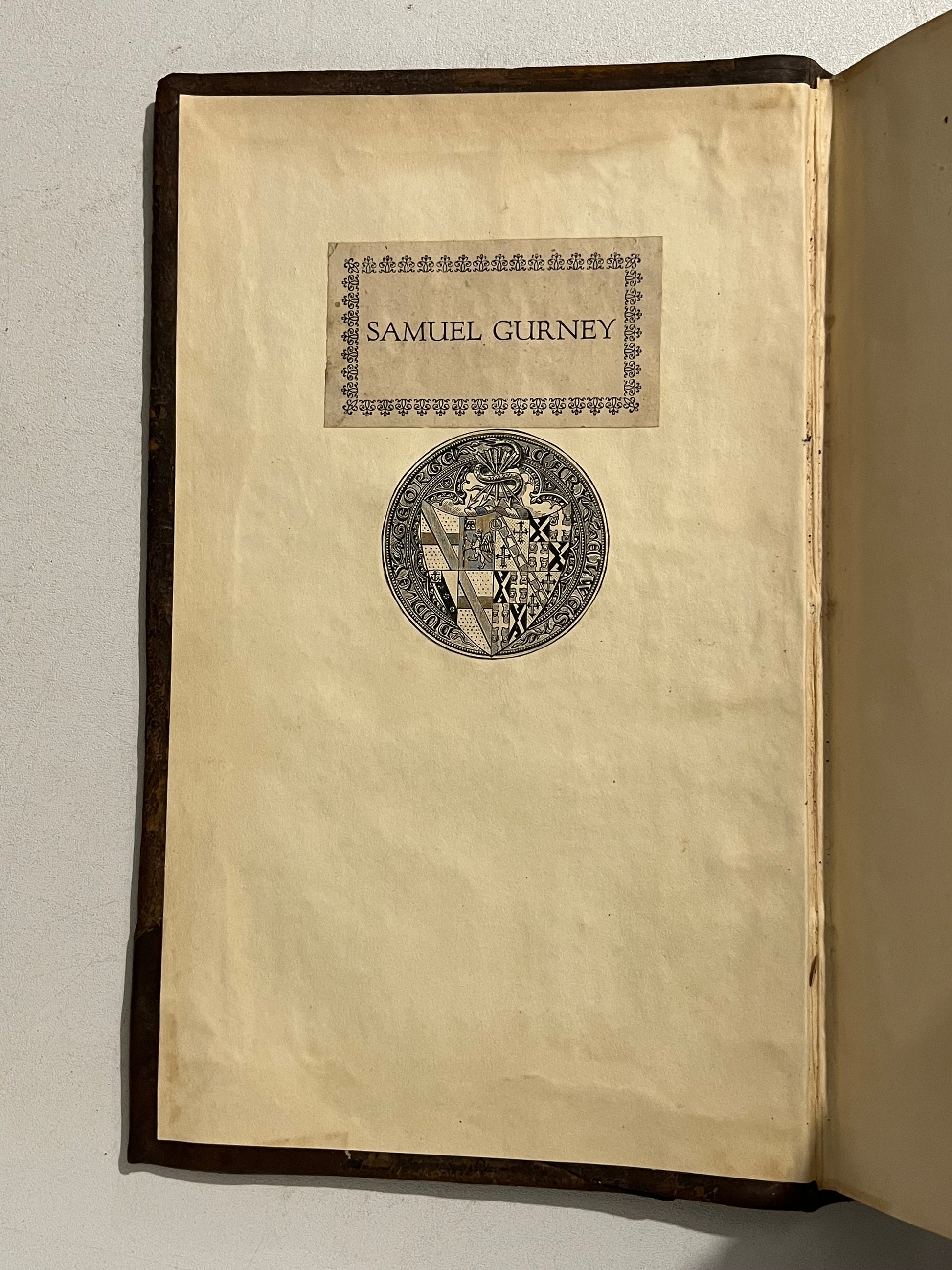Bookplate of Samuel Gurney (1885-1968) of Compton Beauchamp, Oxfordshire. He was an influential member of the Anglo-Catholic movement and a co-founder of the Society of St Peter and St Paul. He purchased a Victorian Rectory in 1925 next to which he restored a medieval church. He was a friend and neighbour of the famous English poet & writer John Betjemen. He was described in his obituary in The Times (8 July 1968, pp.10) as "one of the best-known and best-loved laymen of the Church of England." This book was most likely acquired by Samuel Gurney for a return back into the Compton Library as it was in 1738. A fascinating circular provenance!