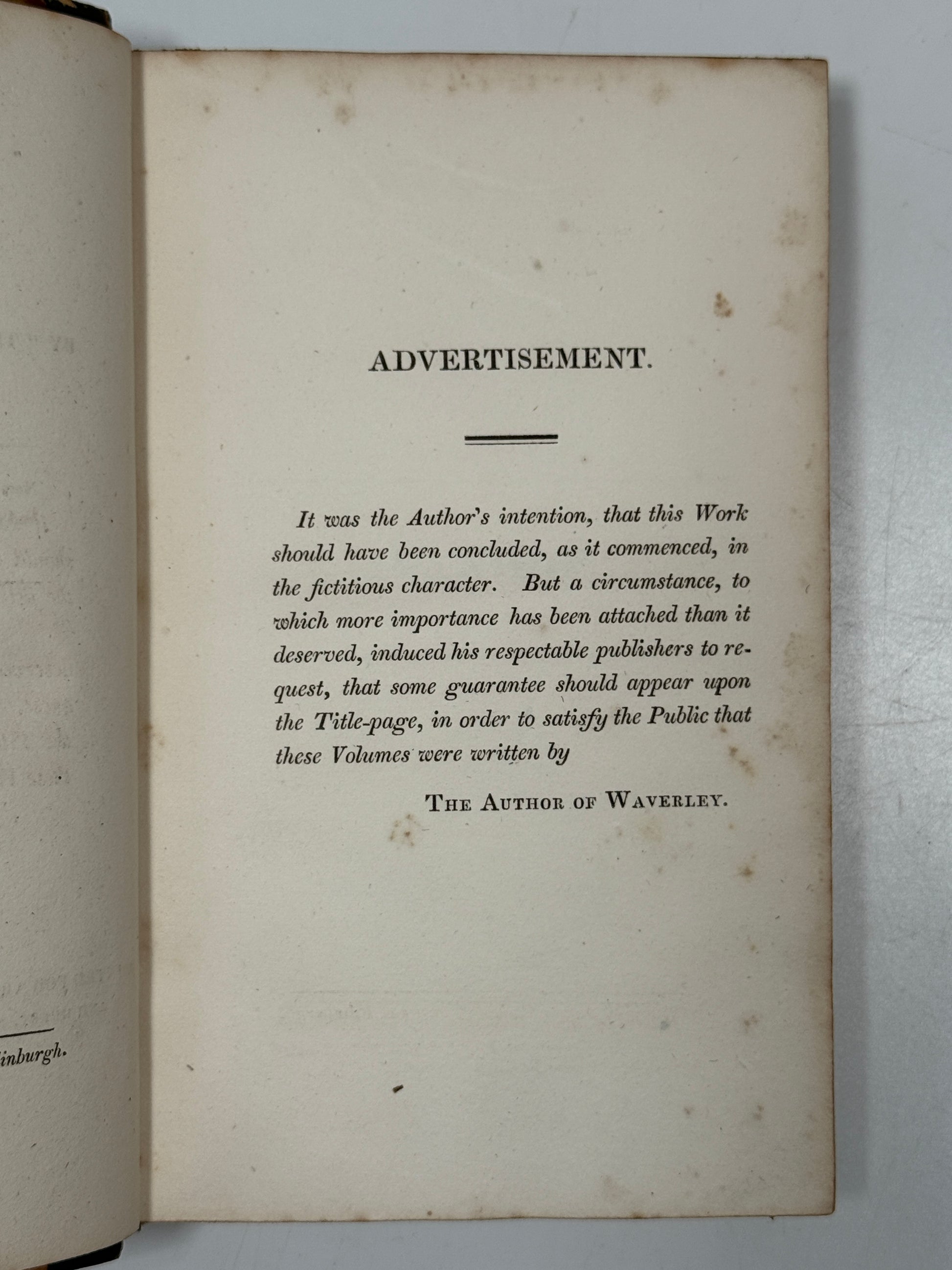 FIRST EDITION FIRST IMPRESSION of what many consider to be Walter Scott's magnum opus, and certainly one of the most important works of the 19th century, coming at a revolutionary time in British literature, in the time of Jane Austen, the Brontes, Mary Shelley, etc. An excellent example of this first edition.