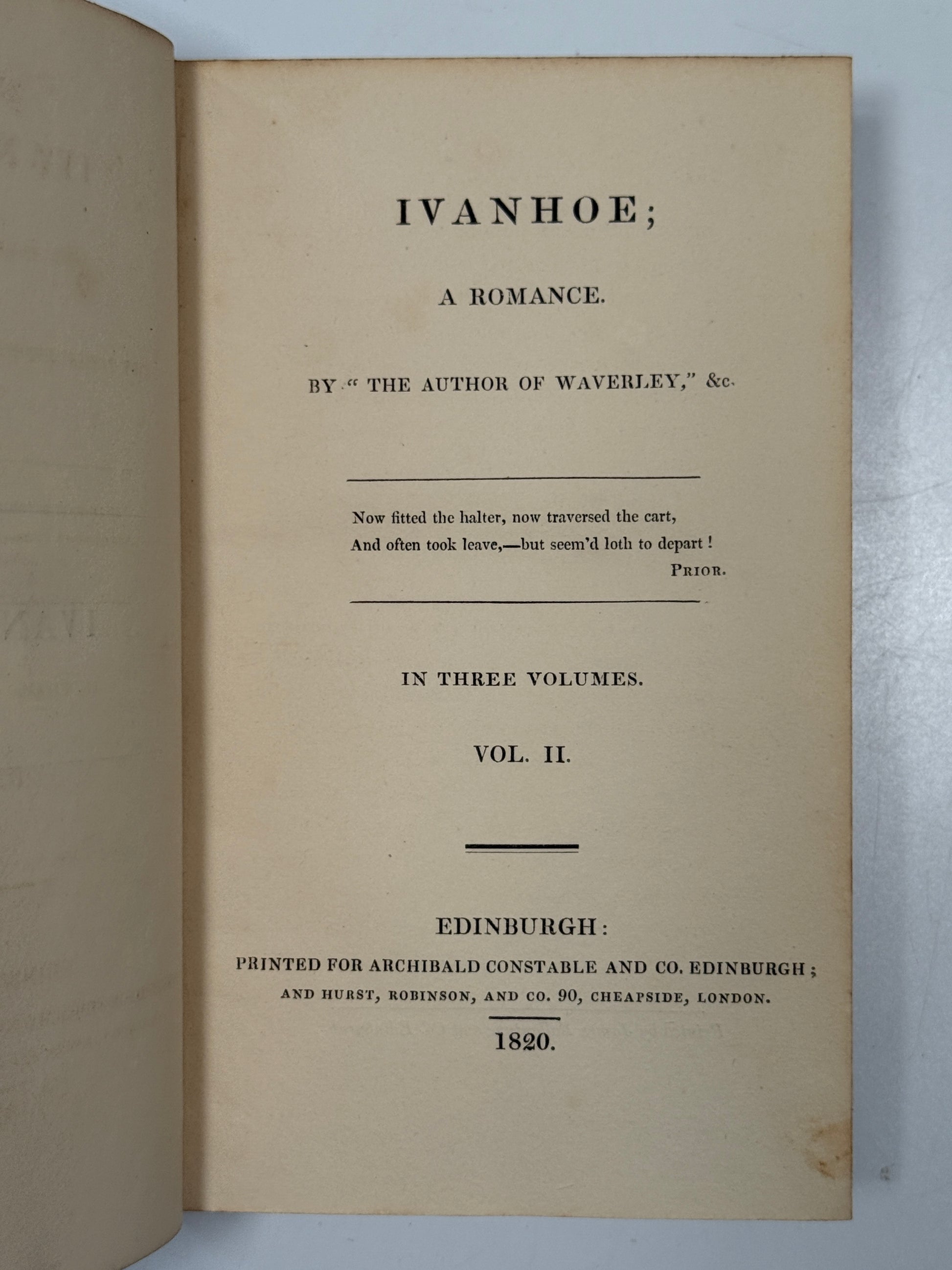 Ivanhoe; a Romance. By "the Author of Waverley," &c. [Sir Walter Scott]. In Three Volumes. Edinburgh: Printed for Archibald Constable and Co., 1820.