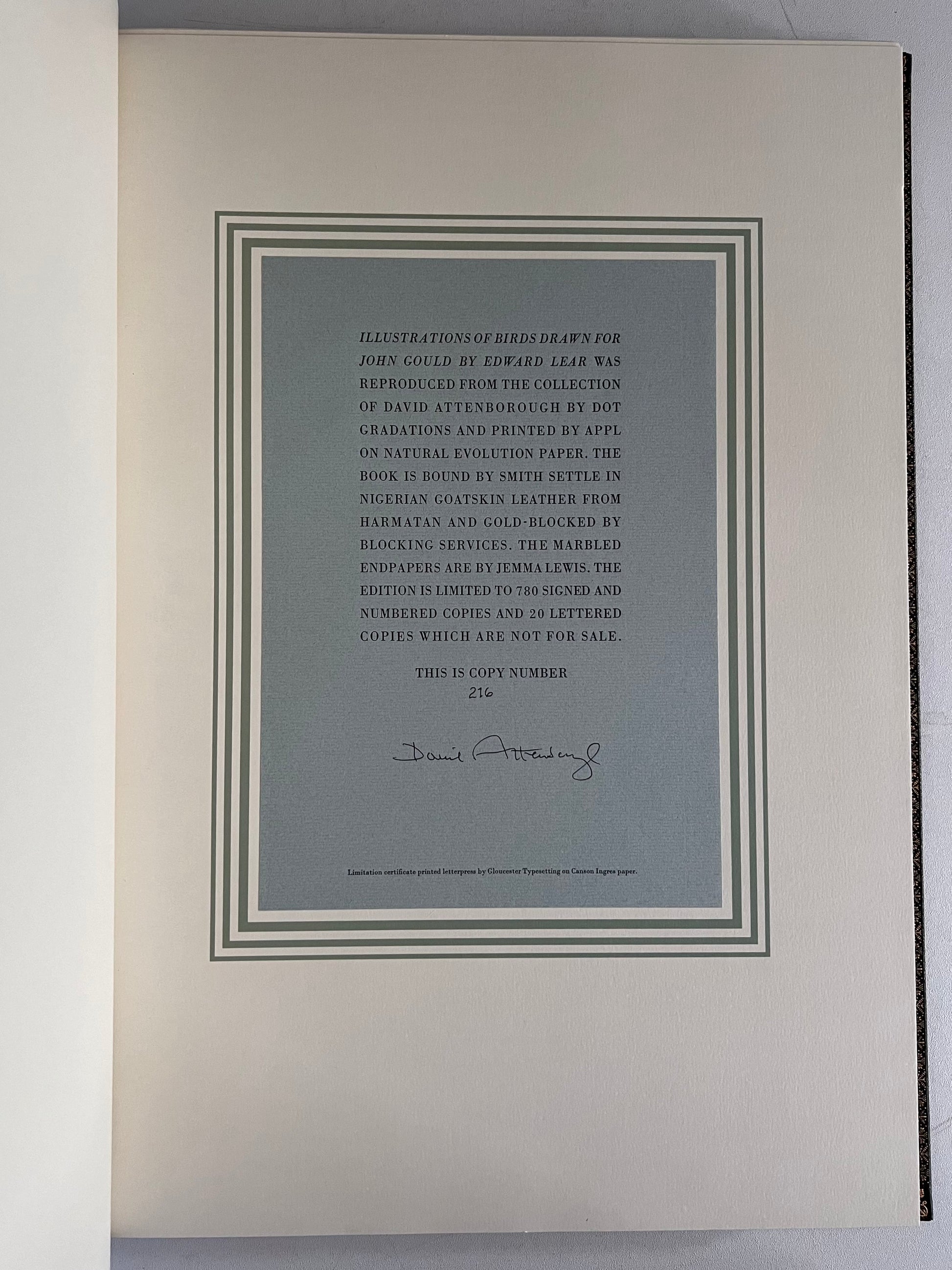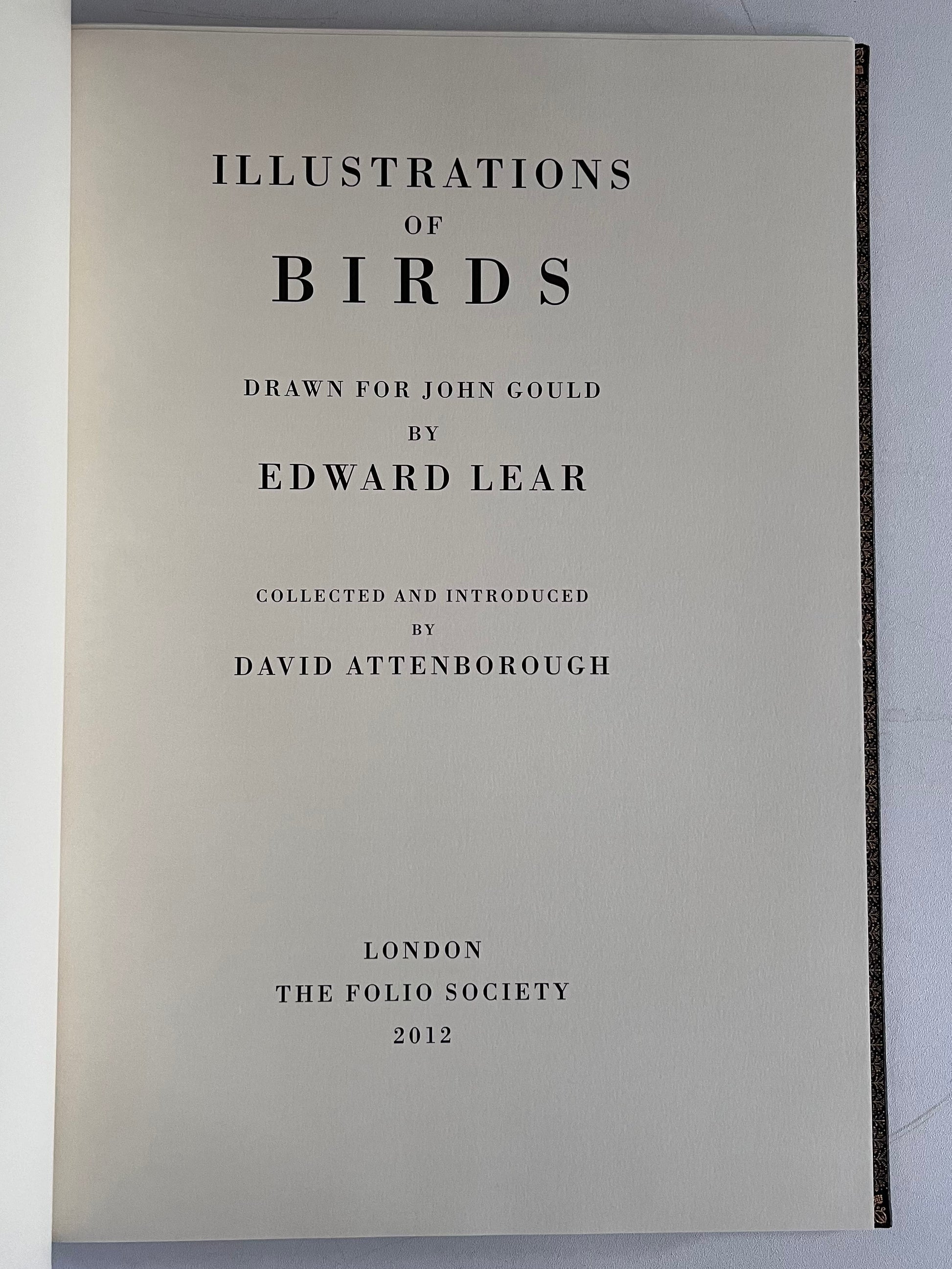 Illustrations of Birds Drawn for John Gould by Edward Lear. Collected and Introduced by David Attenborough. London: Folio Society, 2012, t.e.g., large folio.