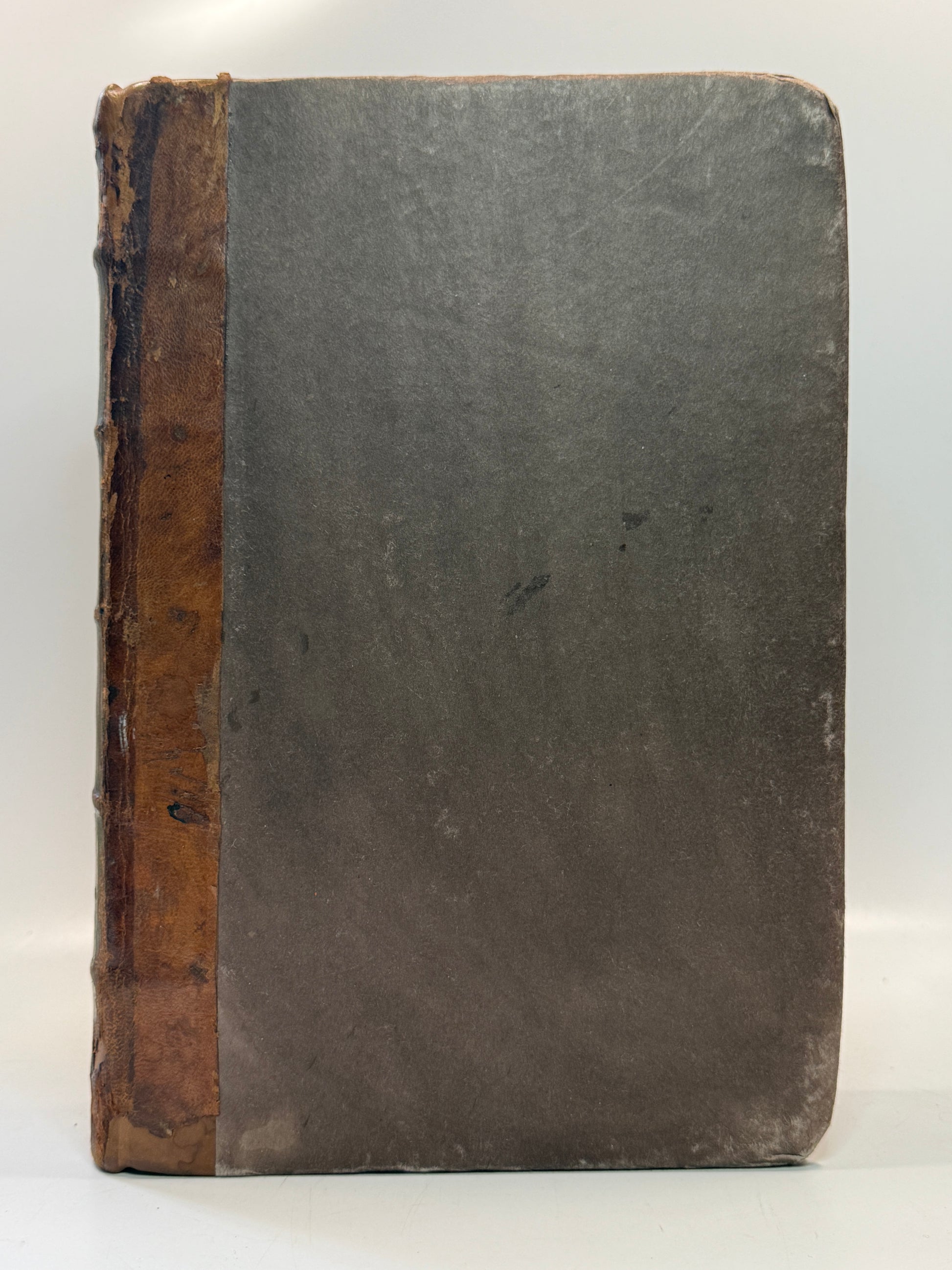 Quarter brown calf over paper backed boards, rebacked retaining most of the original spine. Binding rubbed and scuffed with some marks and small losses of leather. Both boards attached with hinges cracked, thus somewhat fragile. Shelf and edge wear. Page edges toned. Lacking pastedowns. Text blocks very clean with light toning and sporadic foxing, and with dampstaining through most of the text block, not affecting legibility. Title page minor loss at edges, some damp staining, wormholing, and creasing.