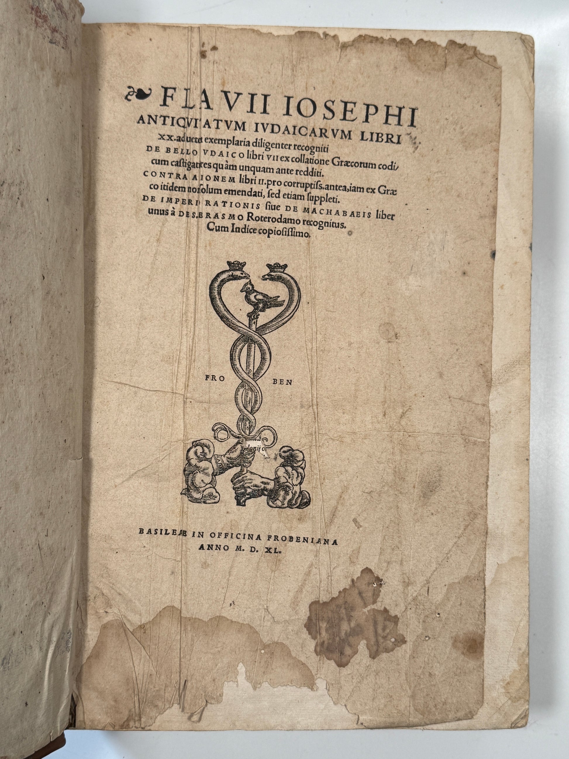 Flavius Josephus. The Jewish Antiquities, in twenty books, diligently revised according to ancient copies. The Jewish War, in seven books, made more correct than ever before from a collation of Greek manuscripts. Against Apion, in two books, not only now emended from the Greek in place of the previously corrupted text, but also supplemented. On the Supremacy of Reason, or On the Maccabees, one book, revised by Desiderius Erasmus of Rotterdam. With a very full index. Basel: At the Froben Press, 1540, folio.